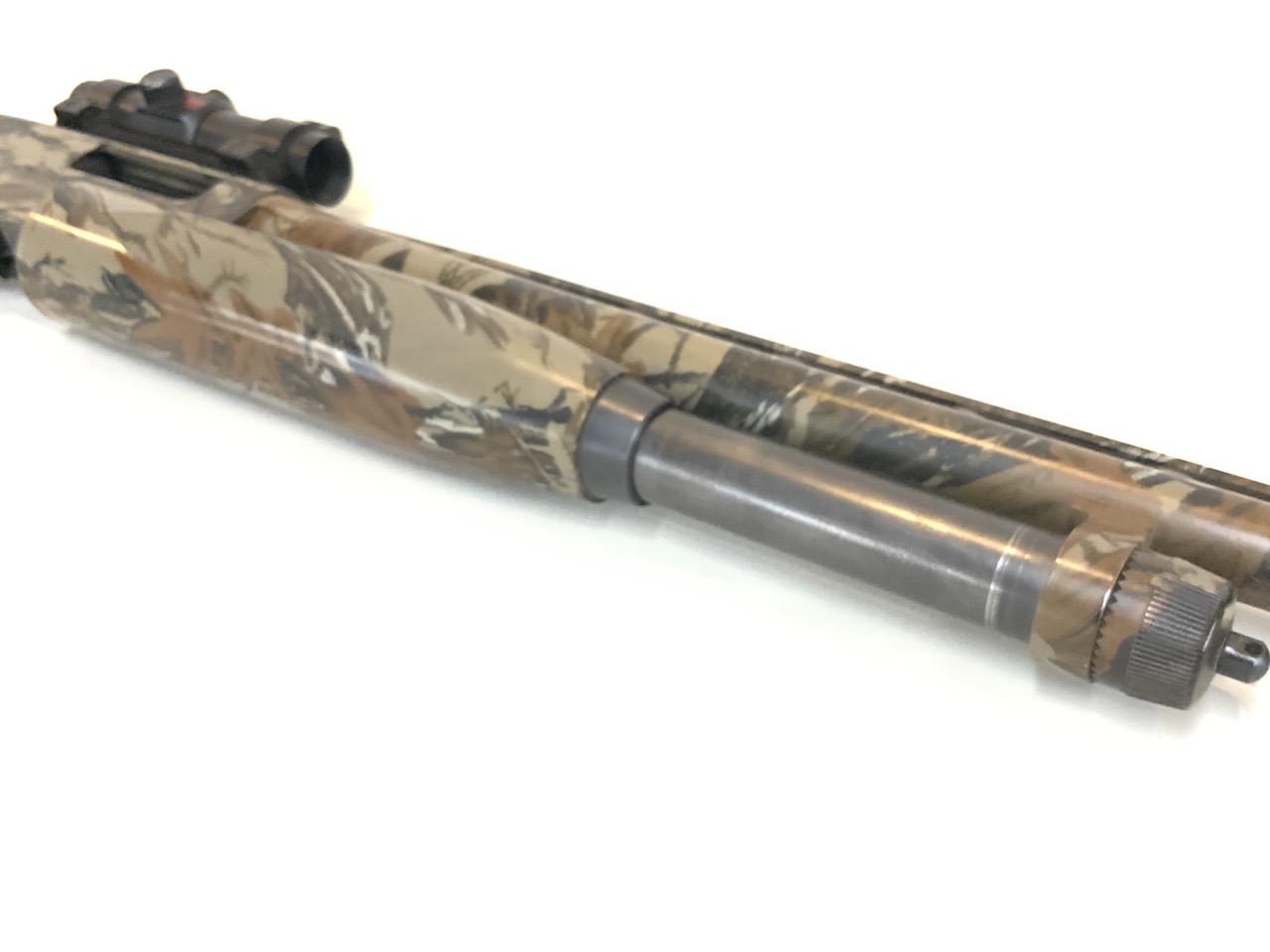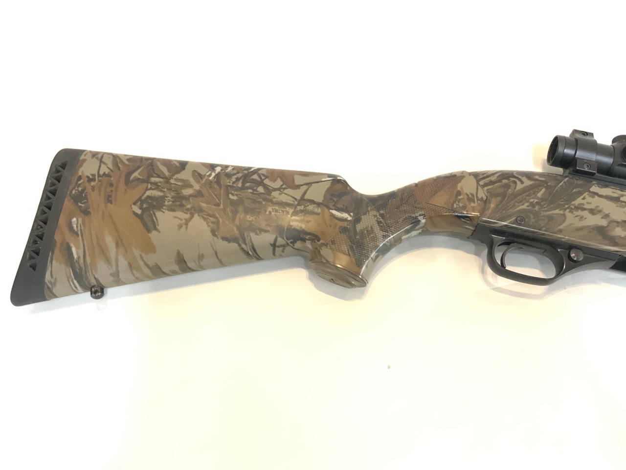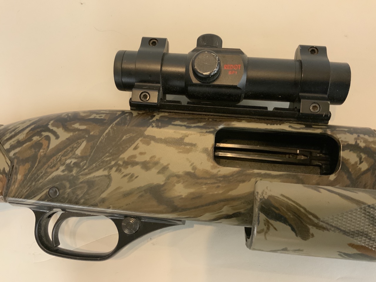 The Winchester Model 1300 12 Gauge Shotgun is a great turkey hunting gun to have. The shotgun has a full camo stock, has a redot sight equipped to it, and has a full choke attachment equipped to it as well.