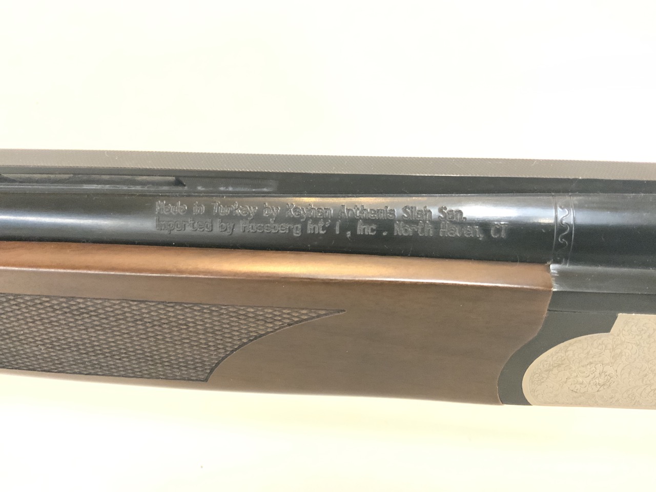 The Mossberg 12 Gauge Shotgun is an over-under double-barrel shotgun that was produced in Turkey by Kayhan Arthemis Silah San. The shotgun has a nice wood finish to its stock and has great metal scroll work throughout the action section of the gun.