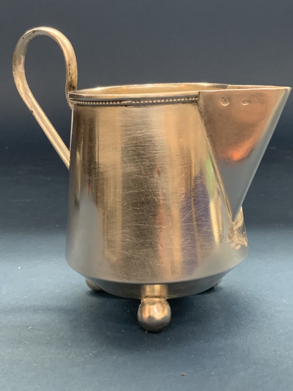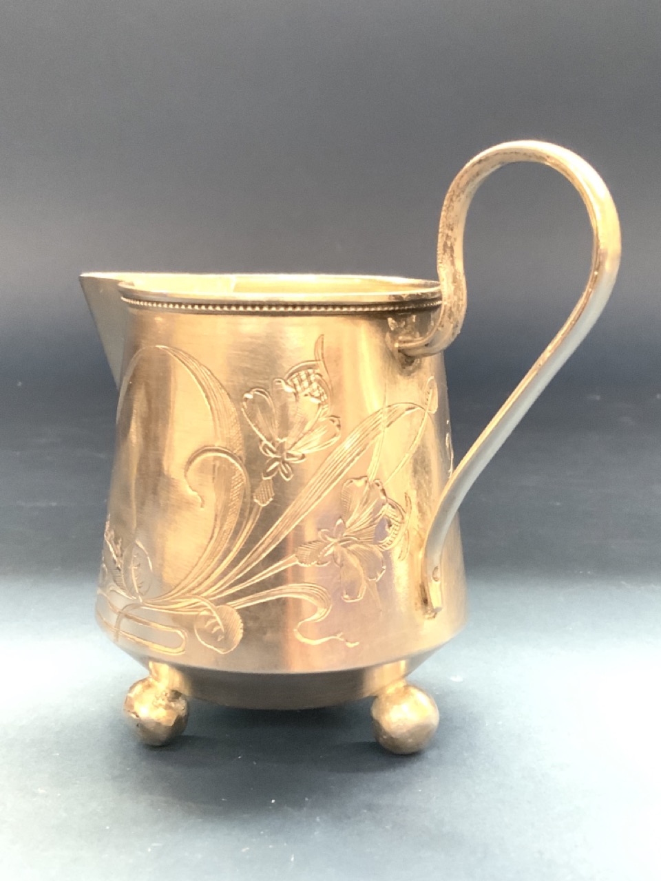 Antique Imperial Russian sterling (84) silver footed milk pitcher with bun feet. Hallmarked.