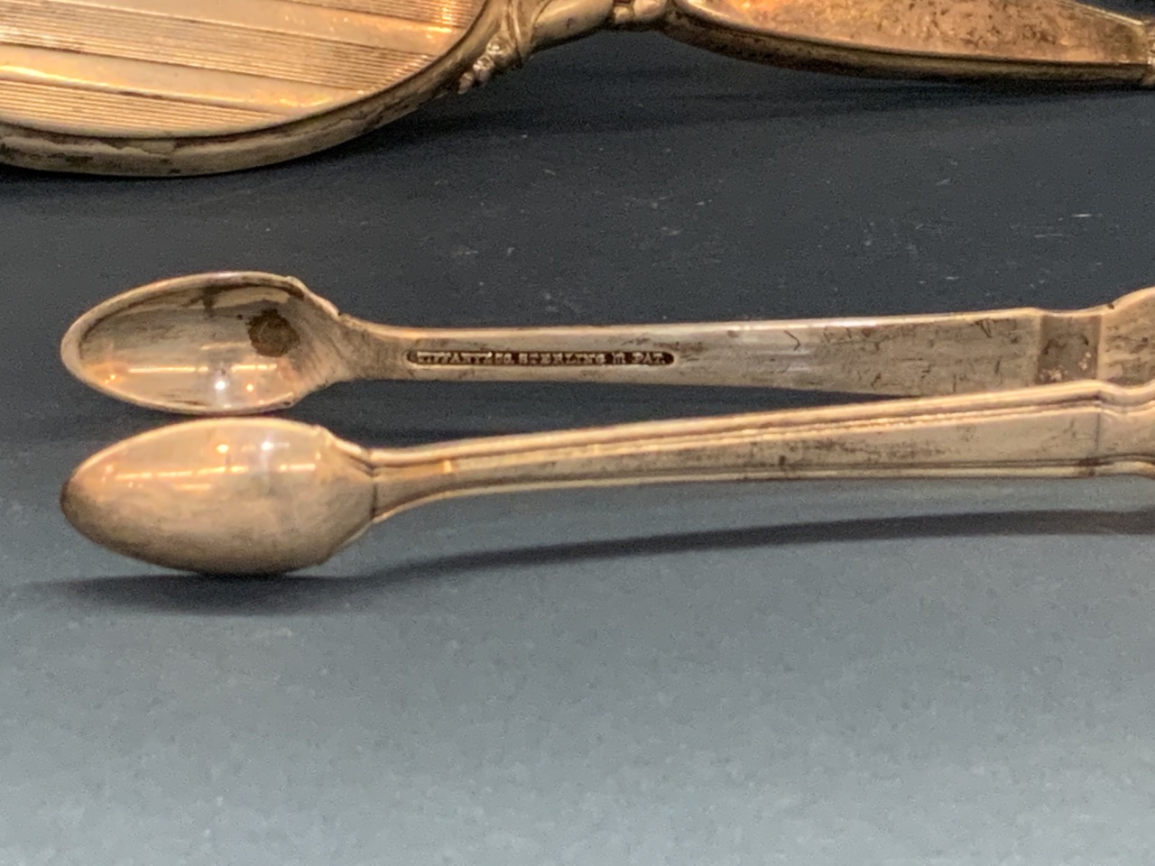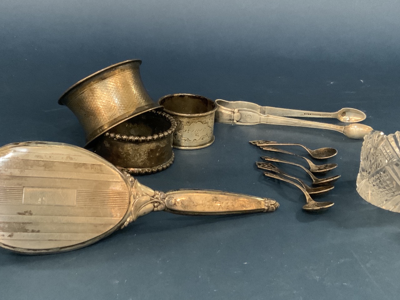 Compiled sterling silver salts, Tiffany sugar tongs, child's brush and napking rings.