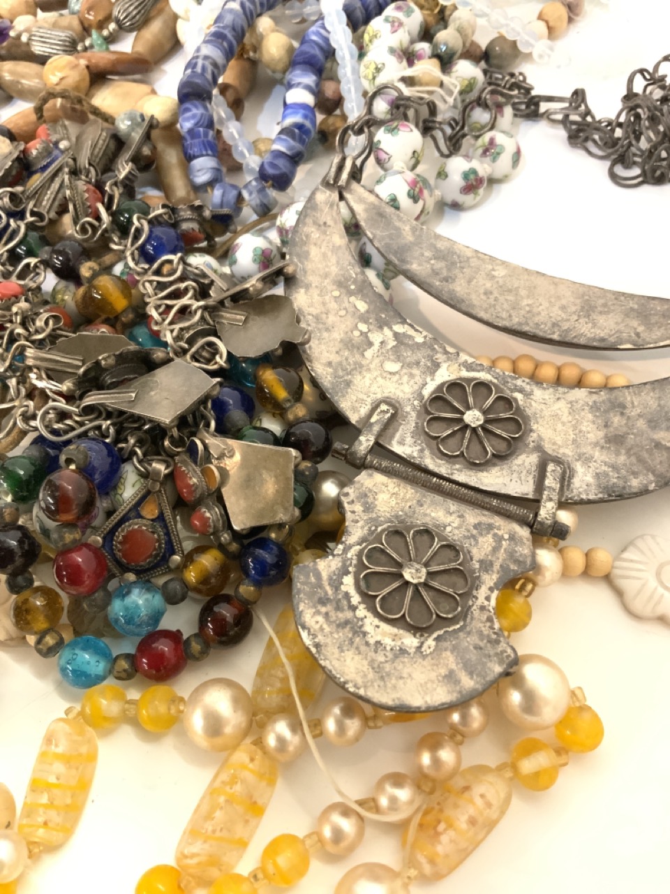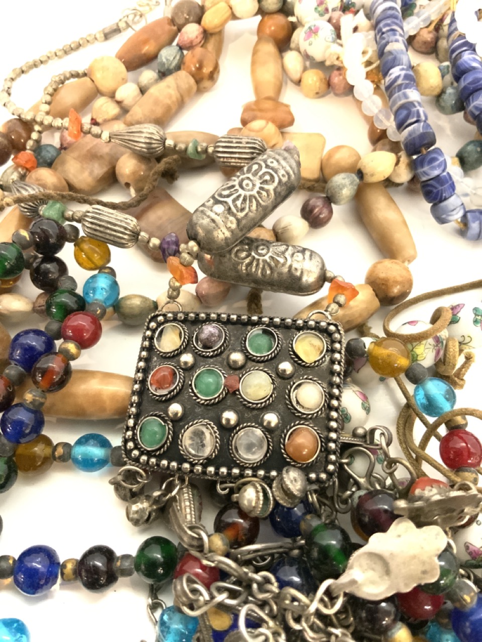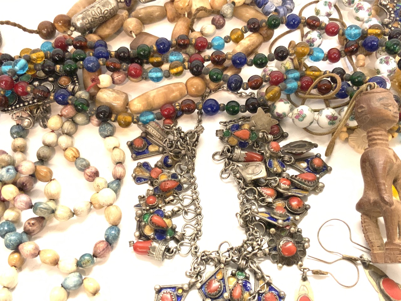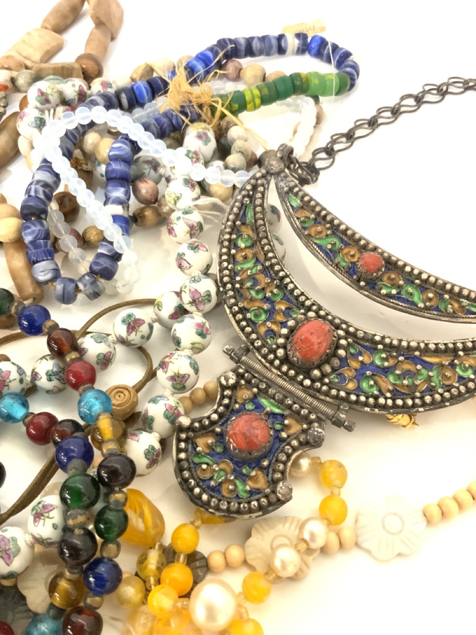 Assorted Ethnic tribal enamel jewelry glass beads. Chinese porcelain etc.