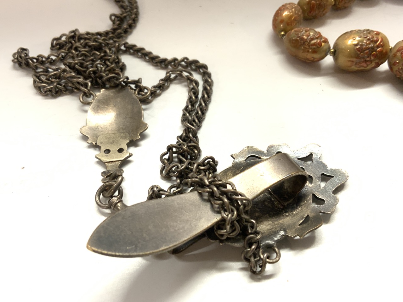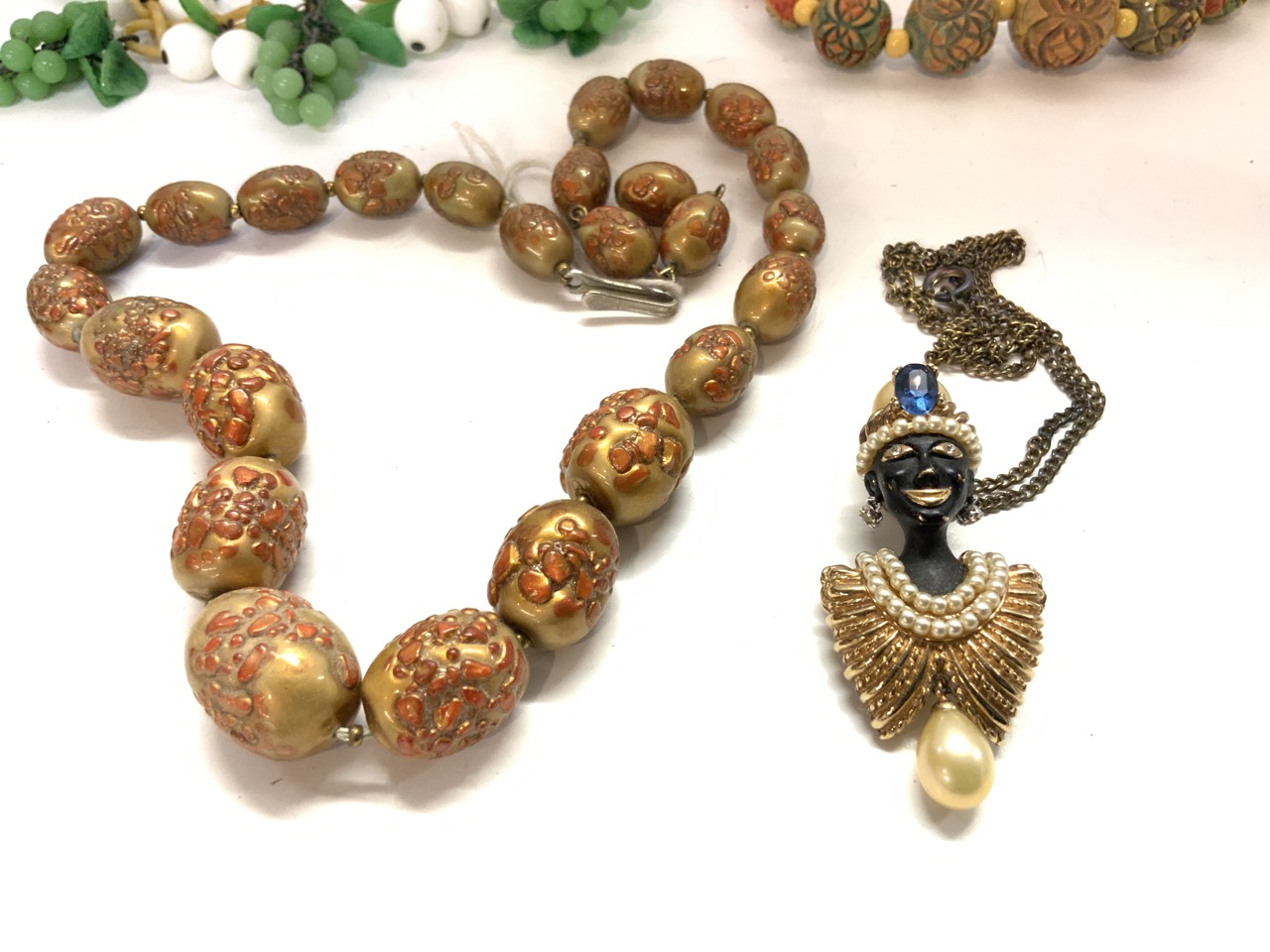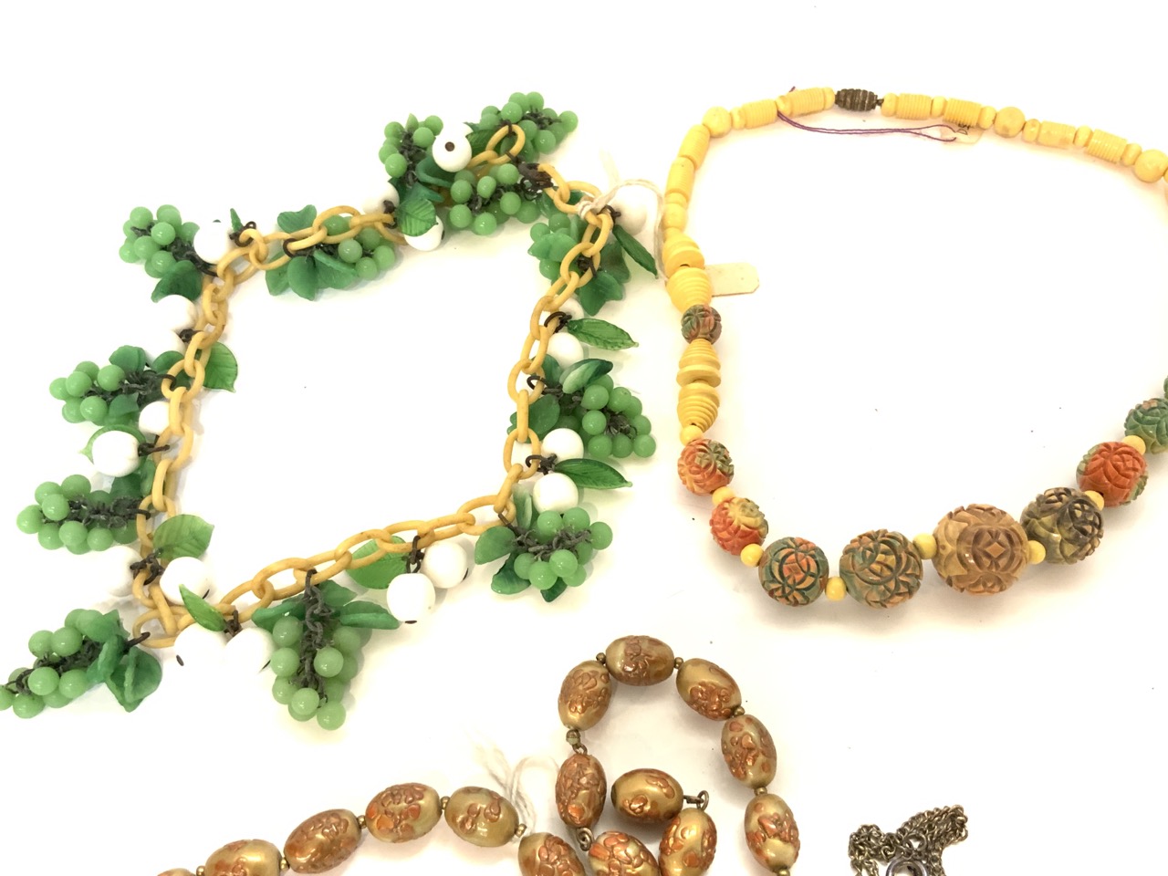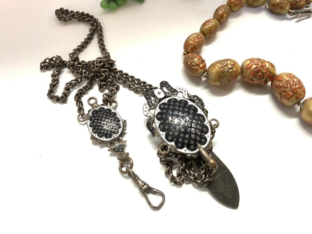 Vintage costume jewelry group. Celluloid choker, early enameled antique watch fob, green glass cluster necklace etc.