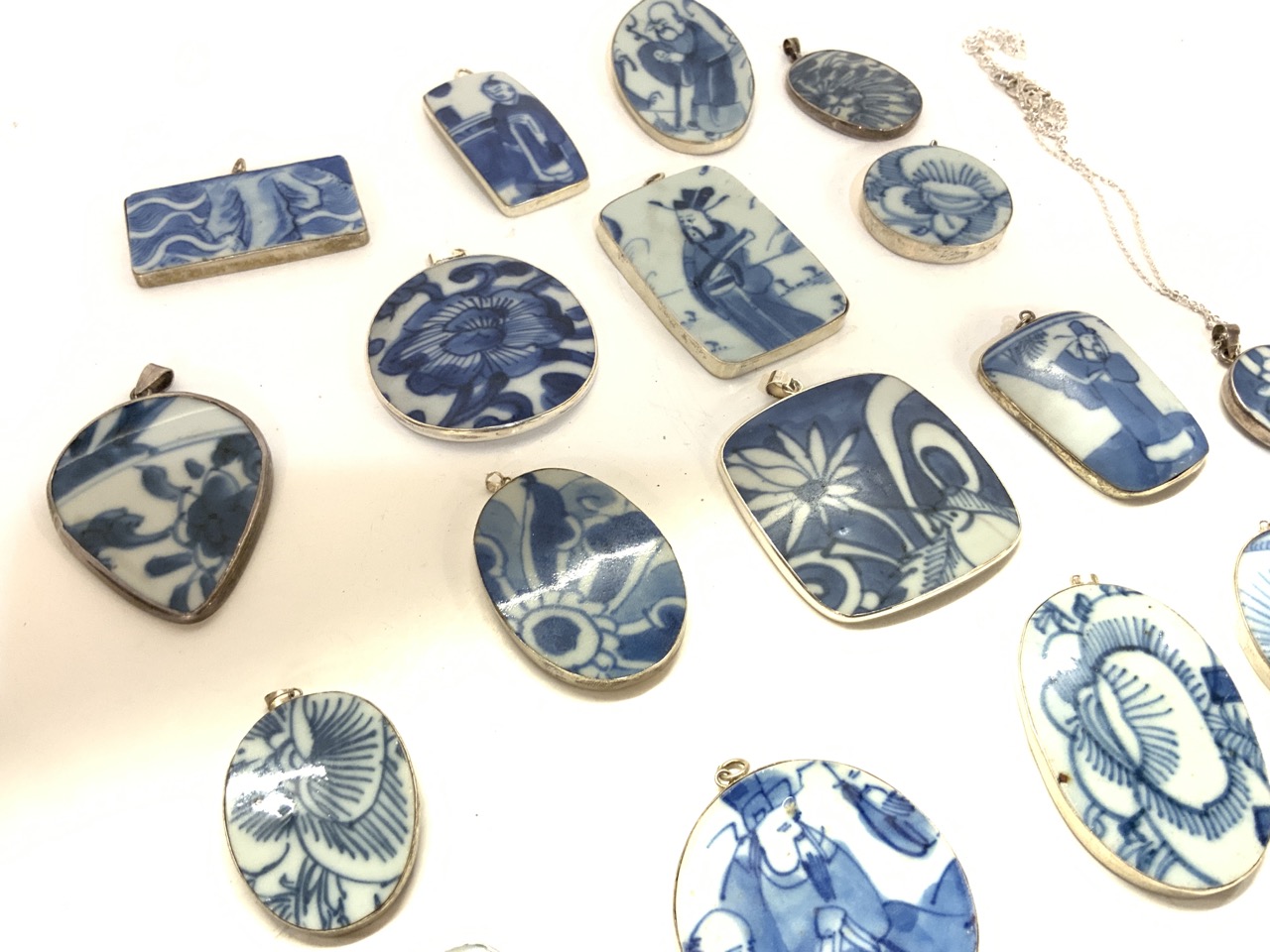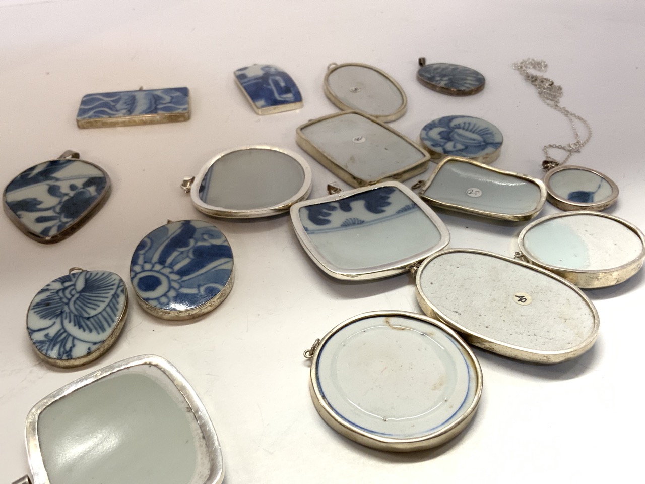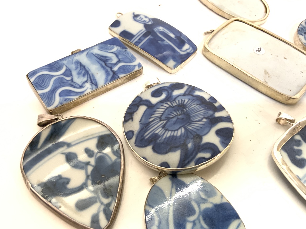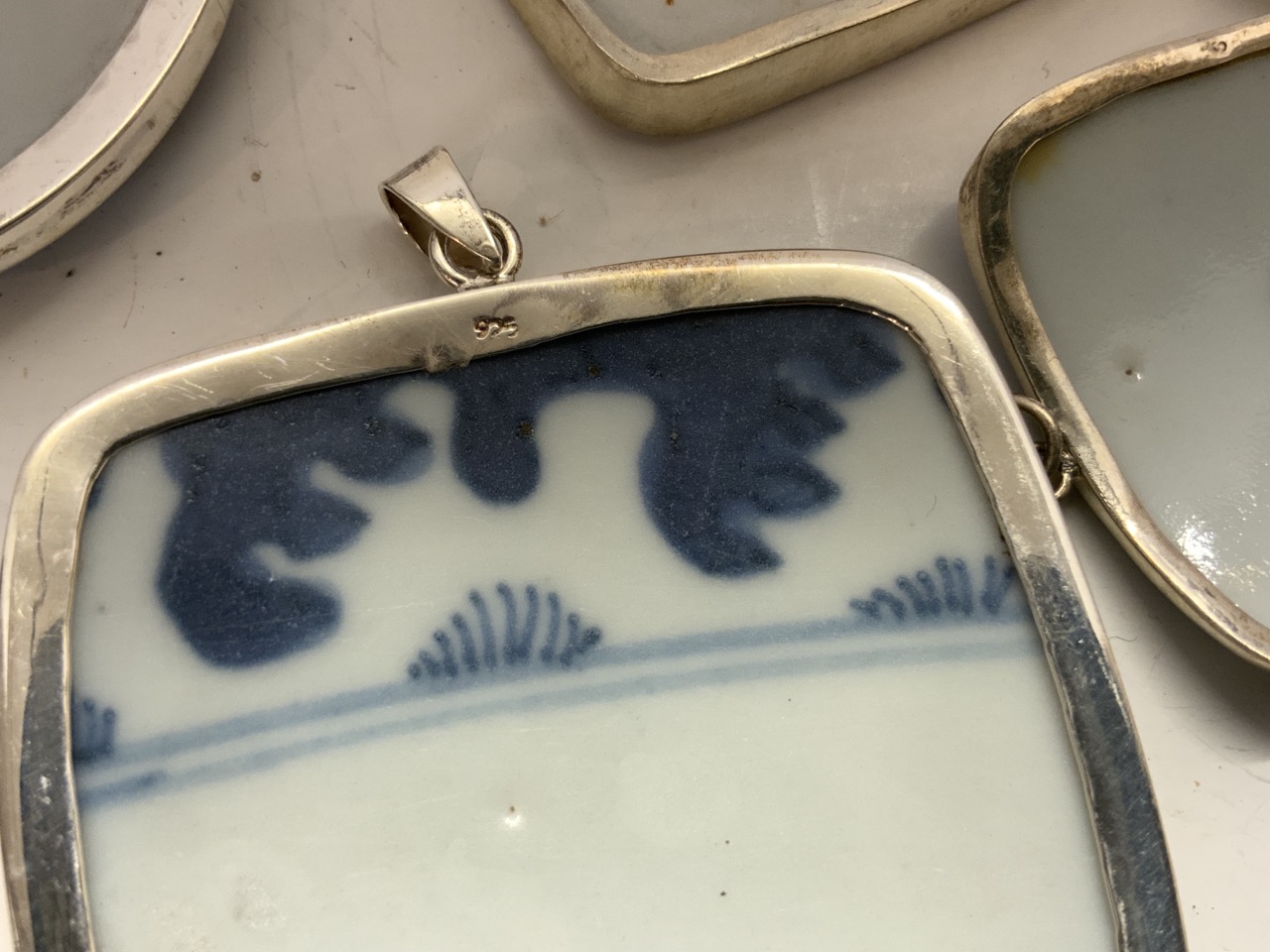 New/Old Stock Chinese porcelain shards in sterling silver frame pendants.