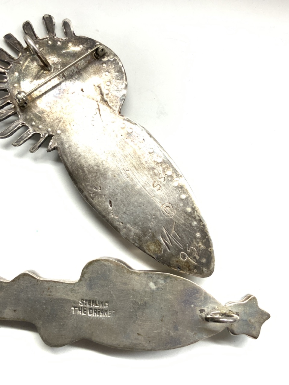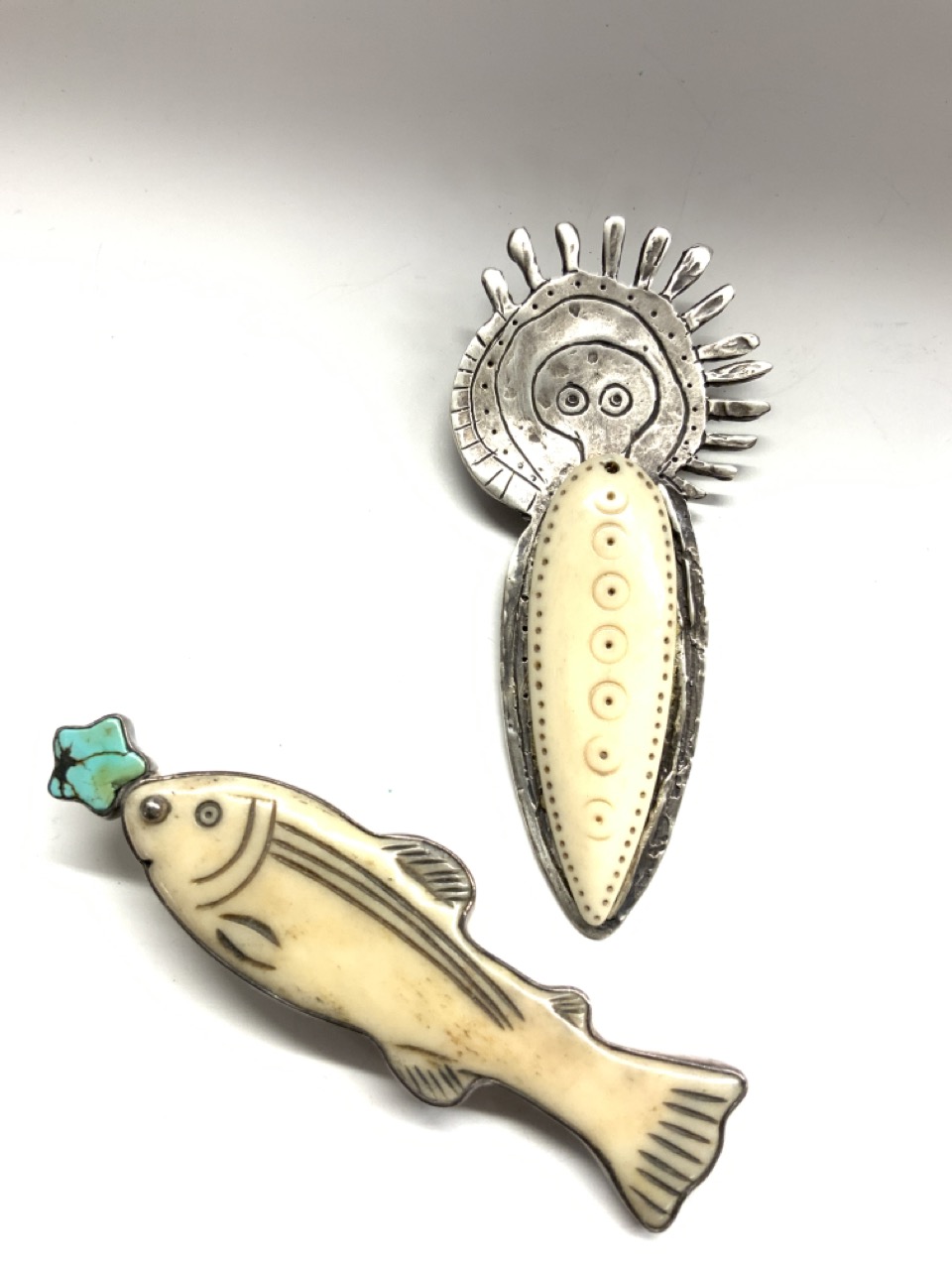 Two (2) sterling silver bone pendants. Artisan pieces. Fish Is bone and turquoise and marked "The Dreamer" Sterling ( 3 3/4" X 1") . African style bone pendant (4" X 1 3/4")