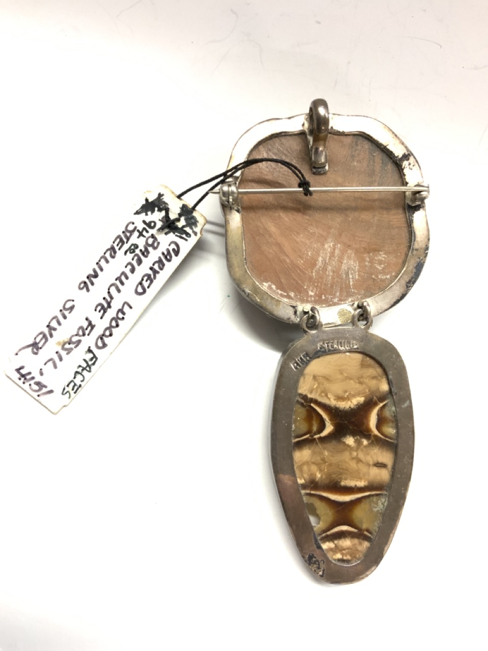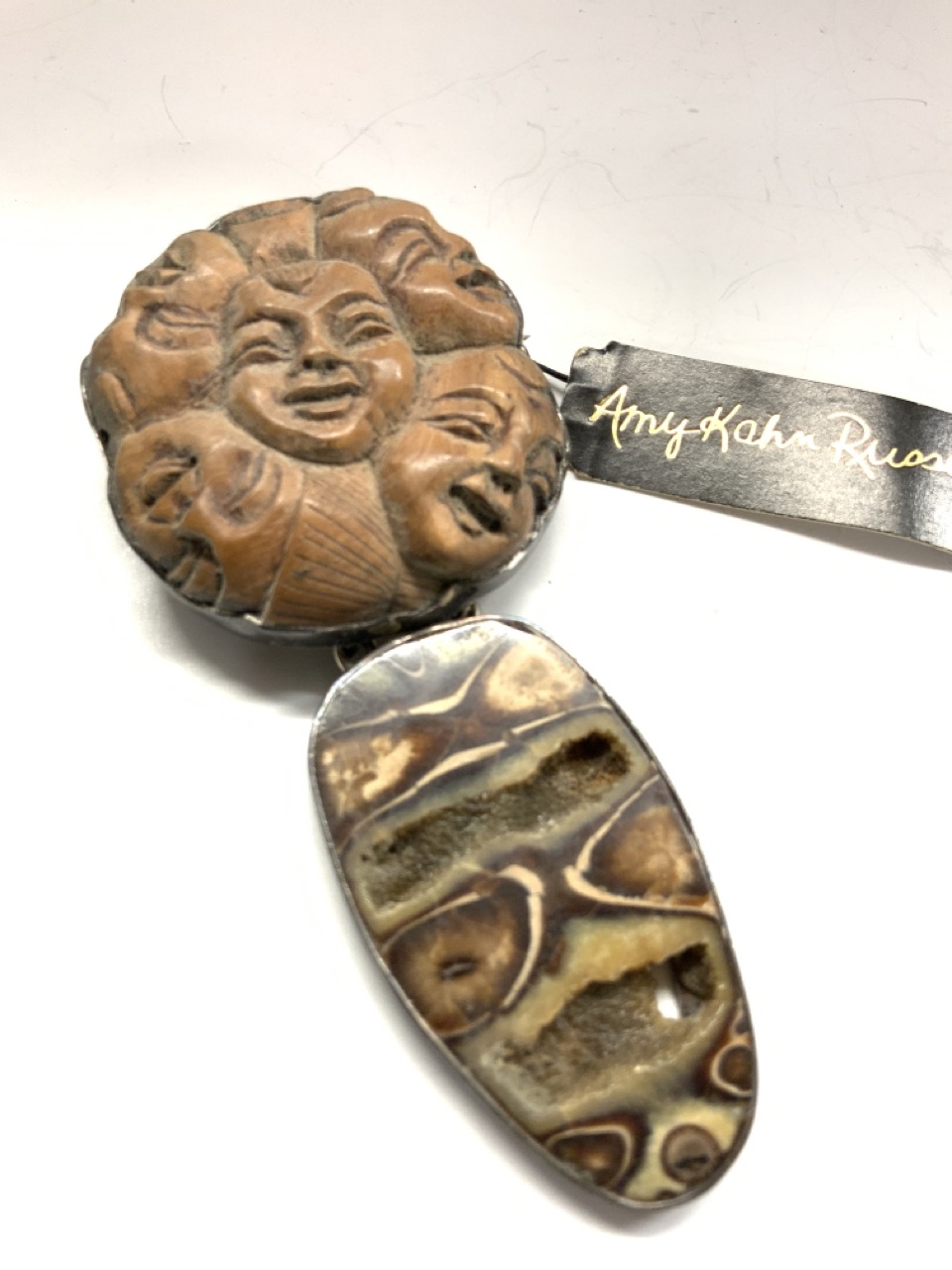 Amy Kahn Russell Artisan sterling silver with carved wood face and fossil brooch or pendant.