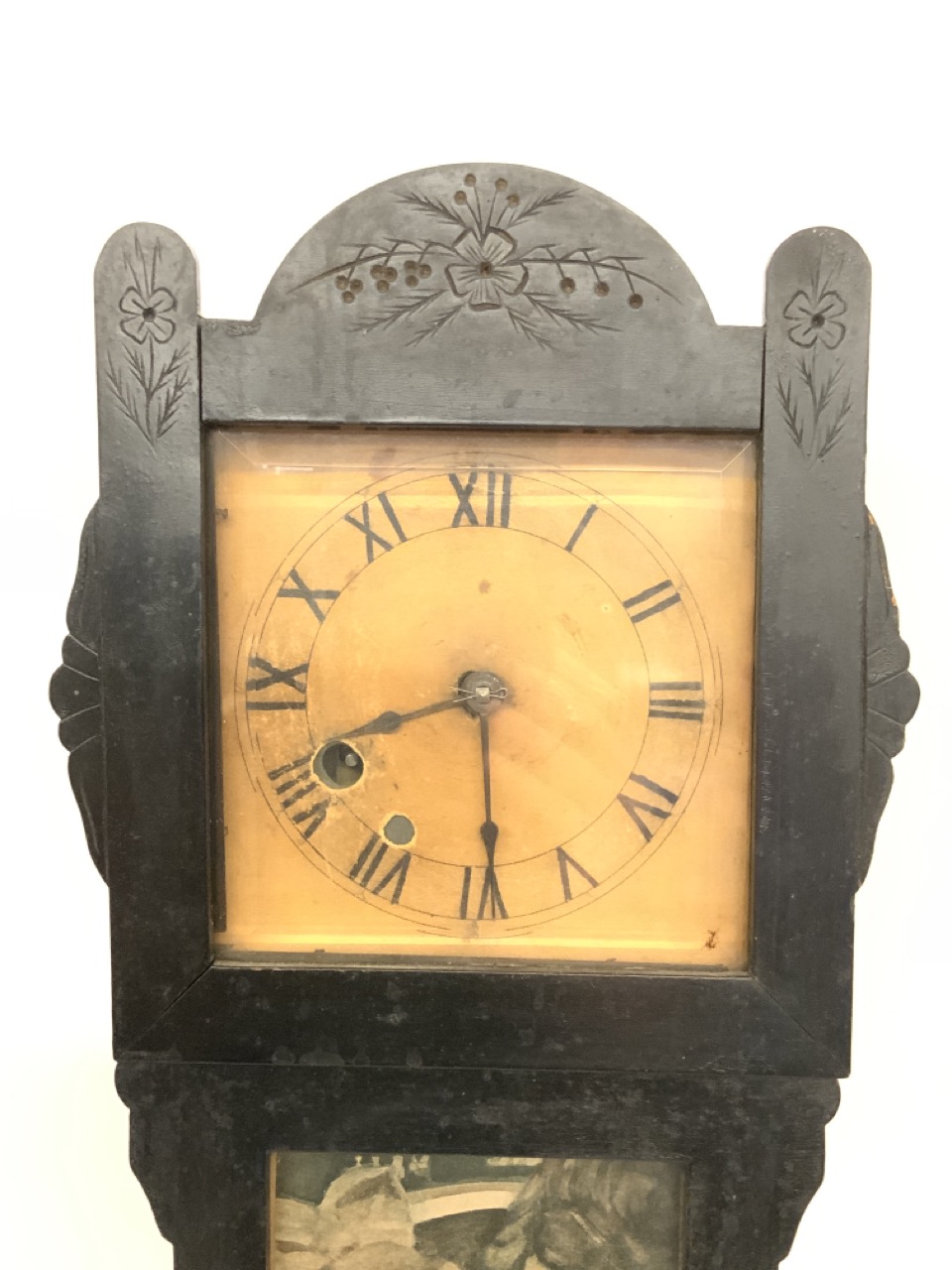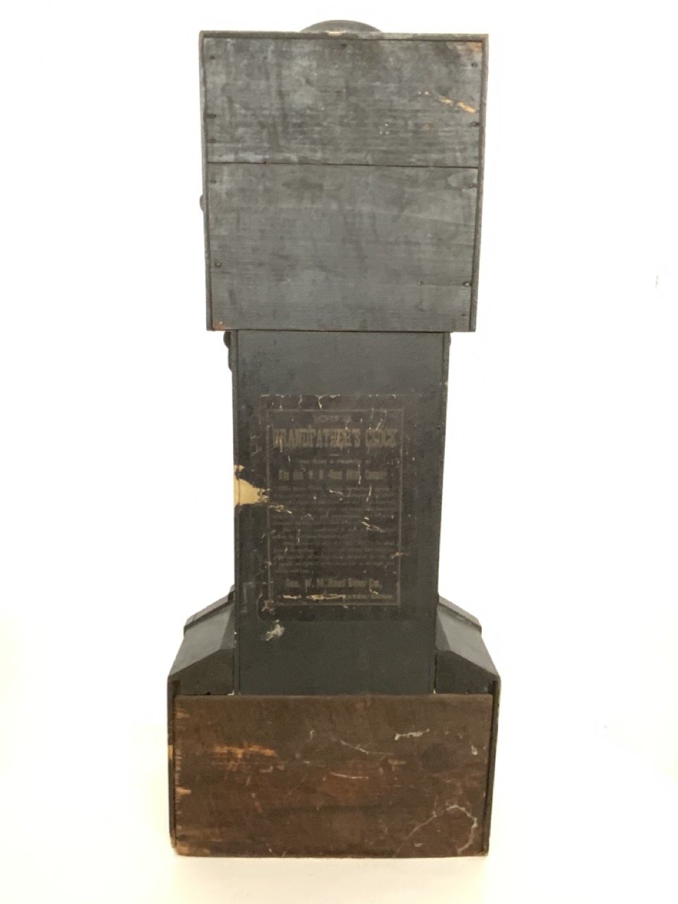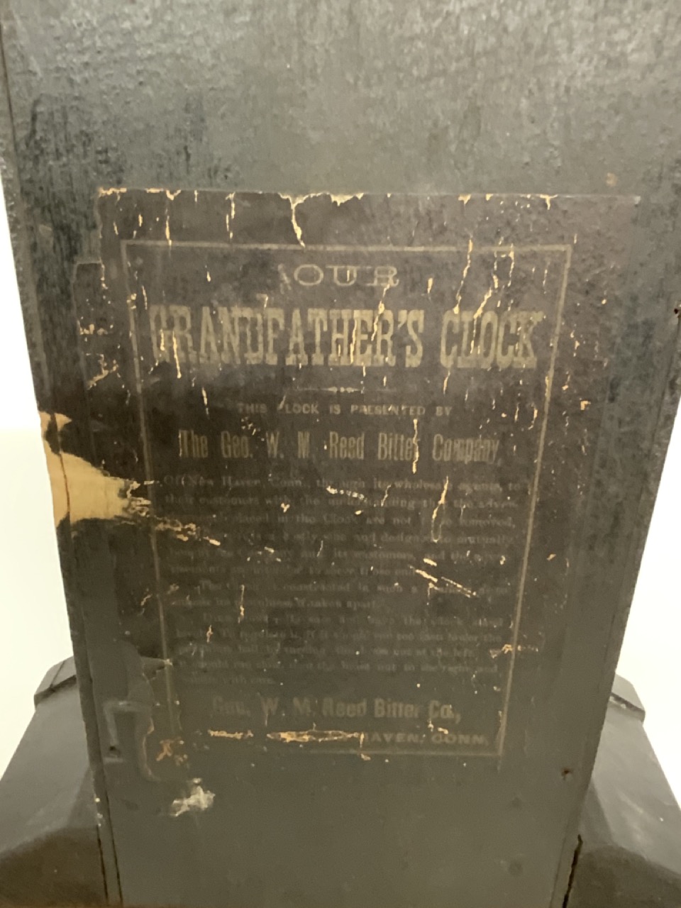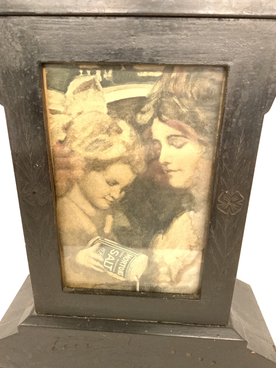 A miniature grandfather advertising clock with print of Morton's Salt Company in Glass.