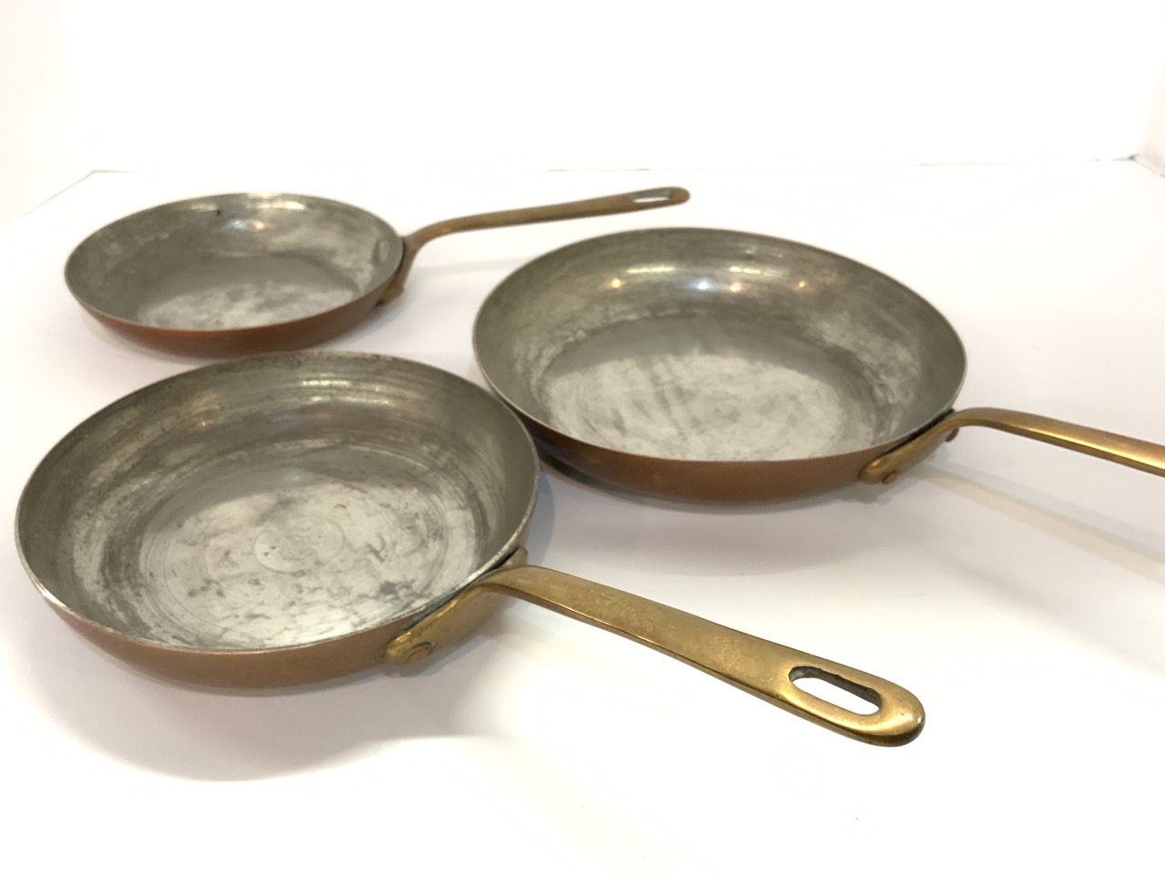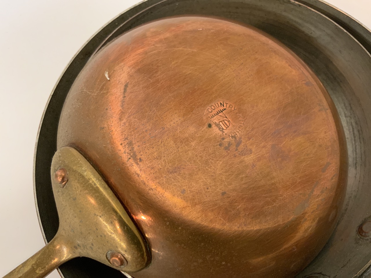 Three (3) piece small copper and brass skillets. Signed Country Kitchen.