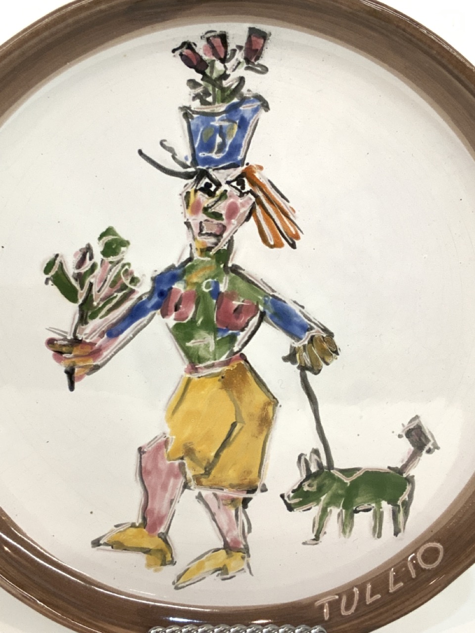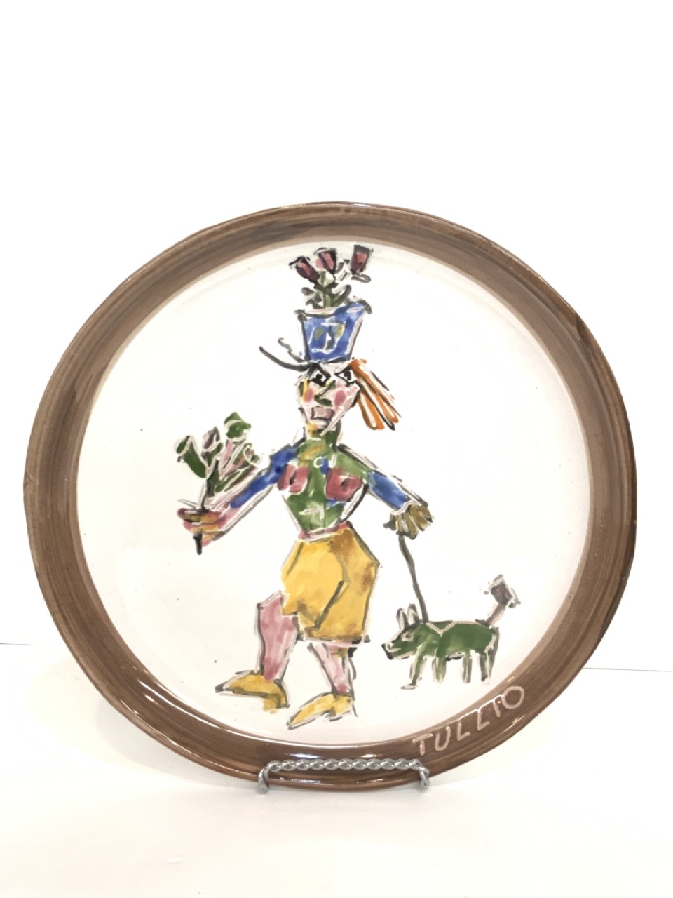 Tullio signed flower selling walking a pig ceramic charger.