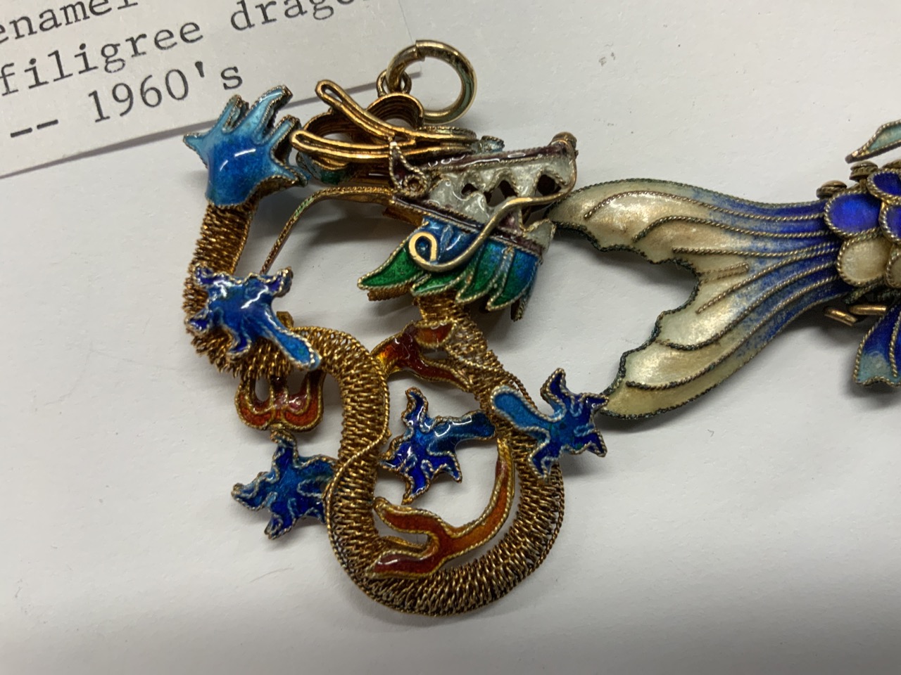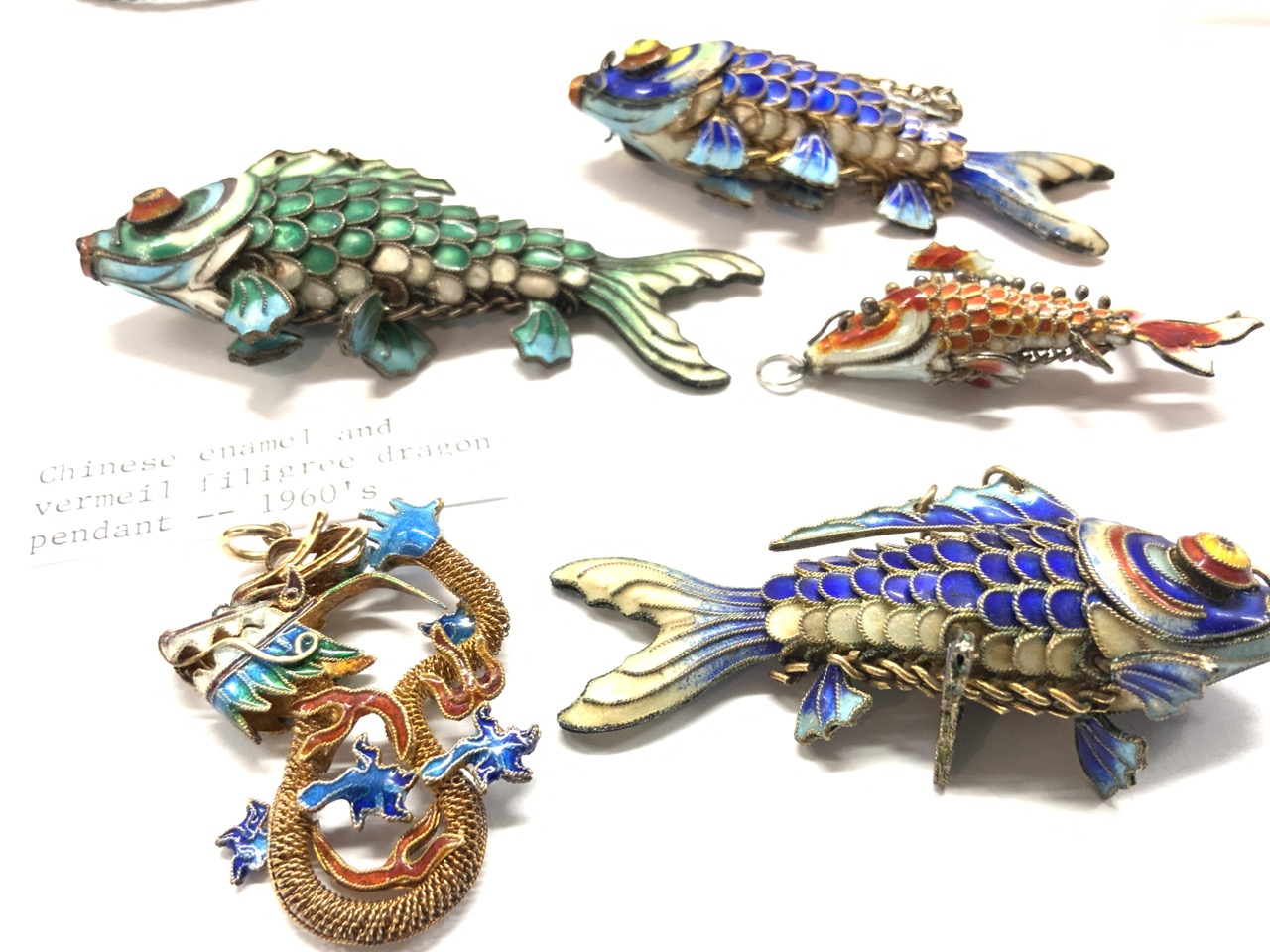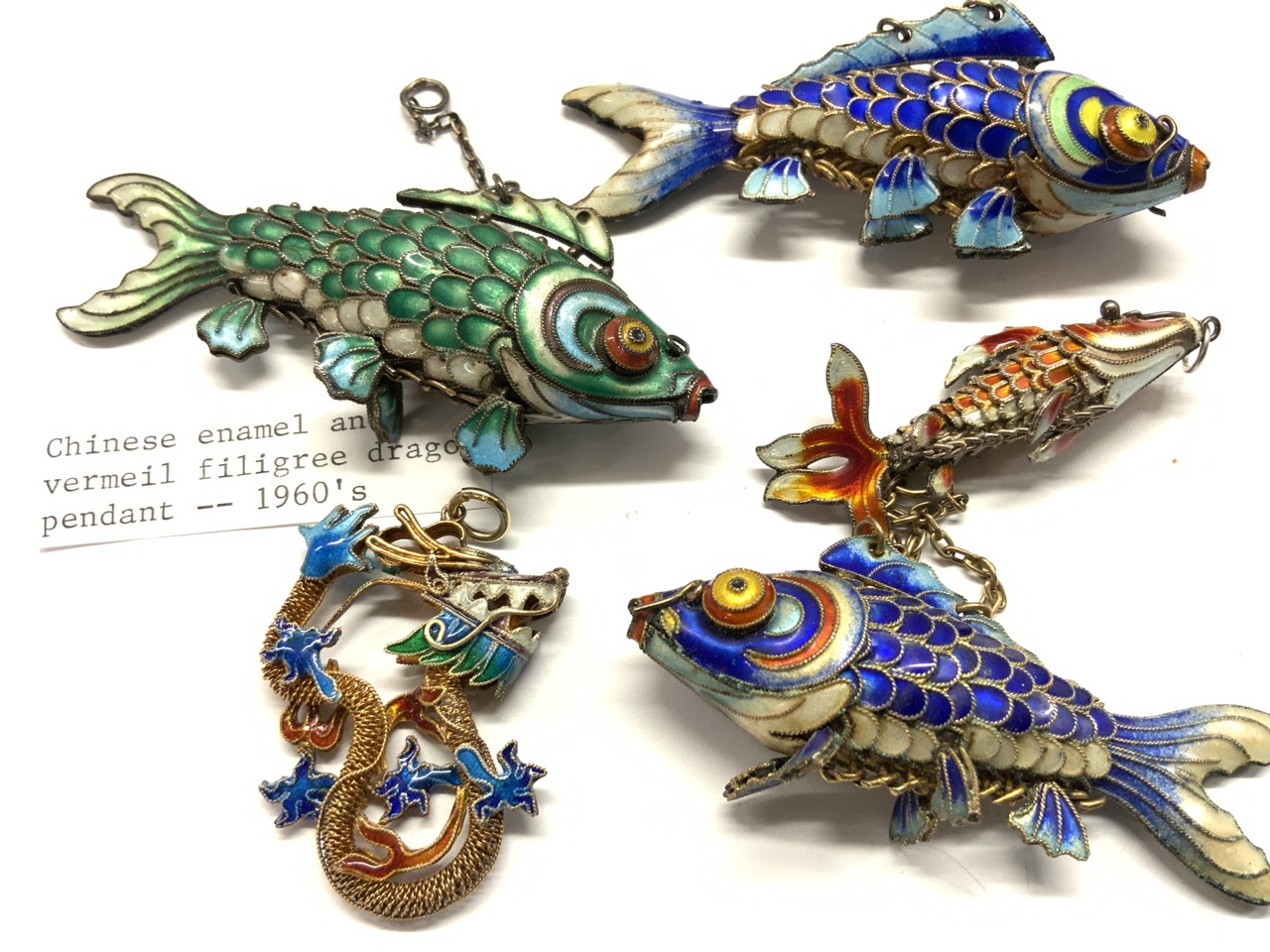 Five Chinese Enamel Jewelry Pieces. Four Fish and A 1960's Dragon Pendant. As seen in photograph preview.