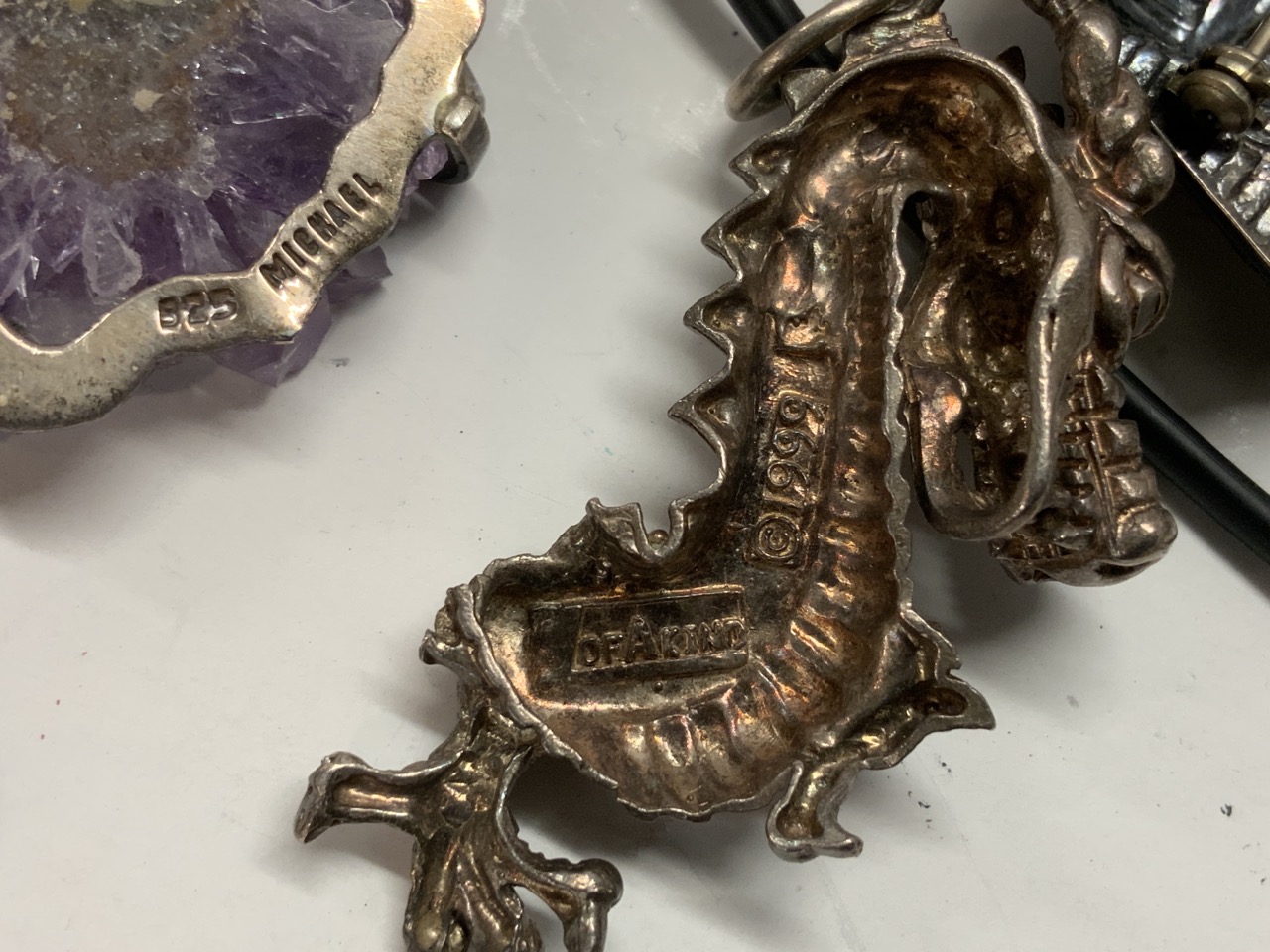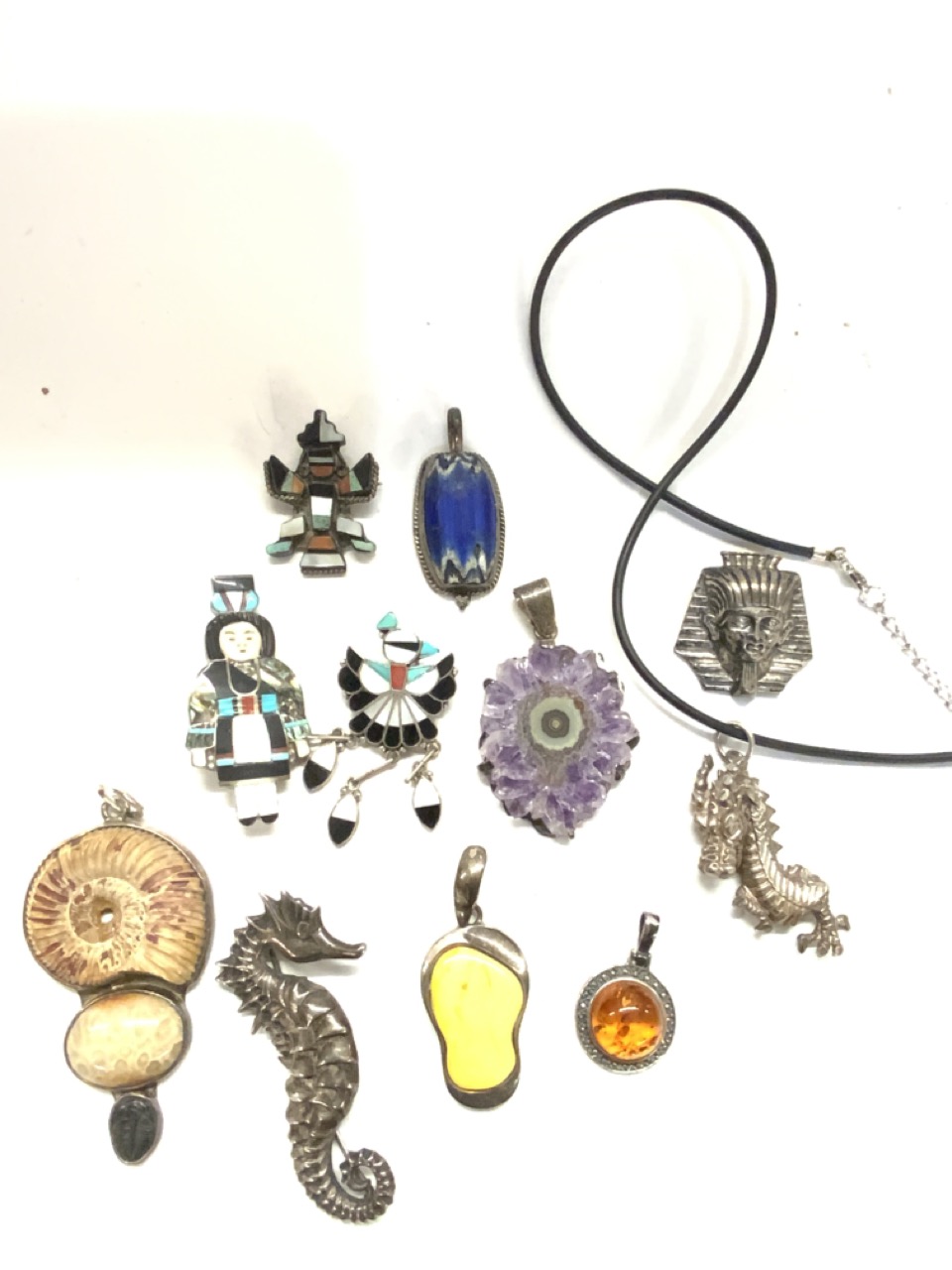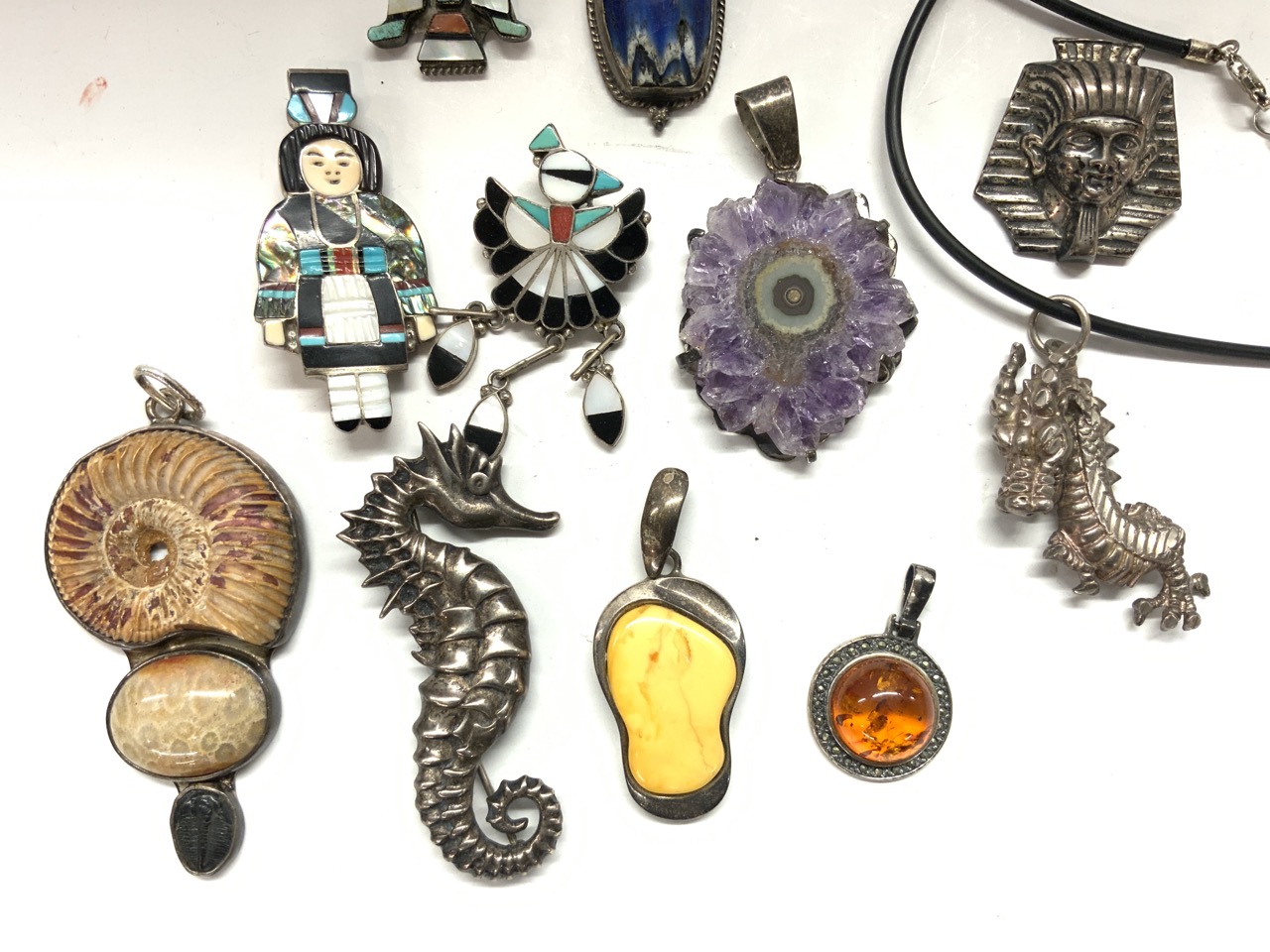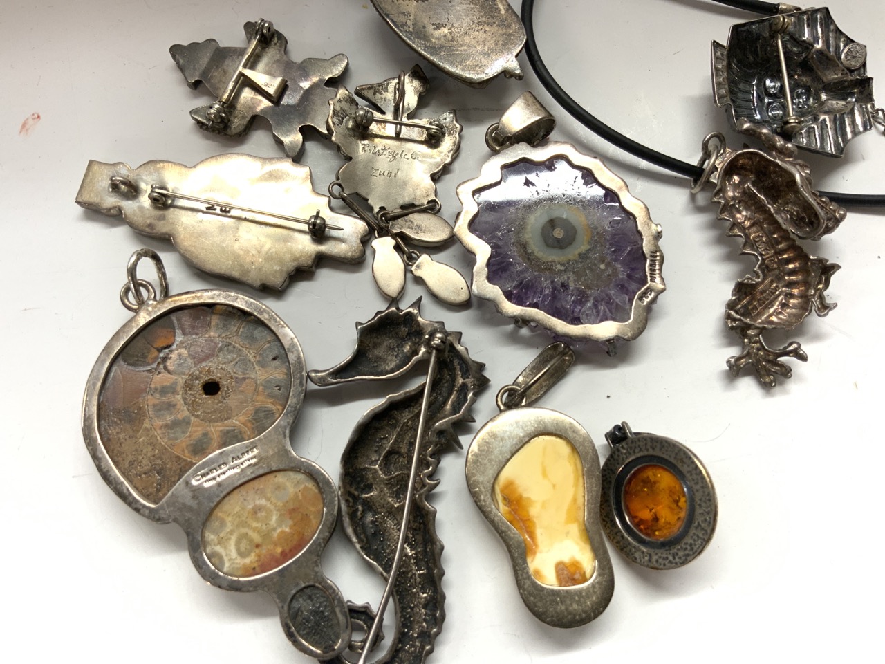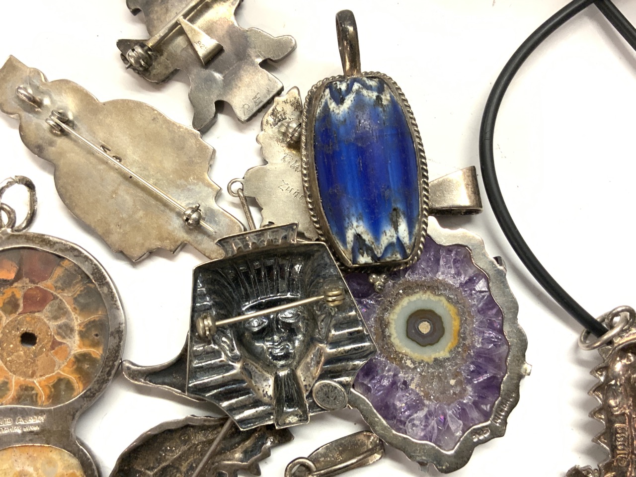 Assorted estate sterling silver jewelry group. Charles Albert, Michael Conner, American Indian Signed pieces, Blue chevron stone pendant etc. Please see photograph preview.
