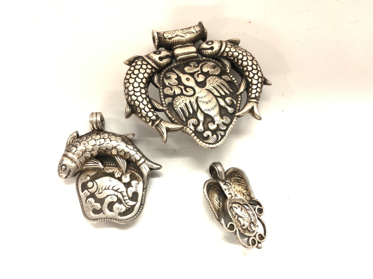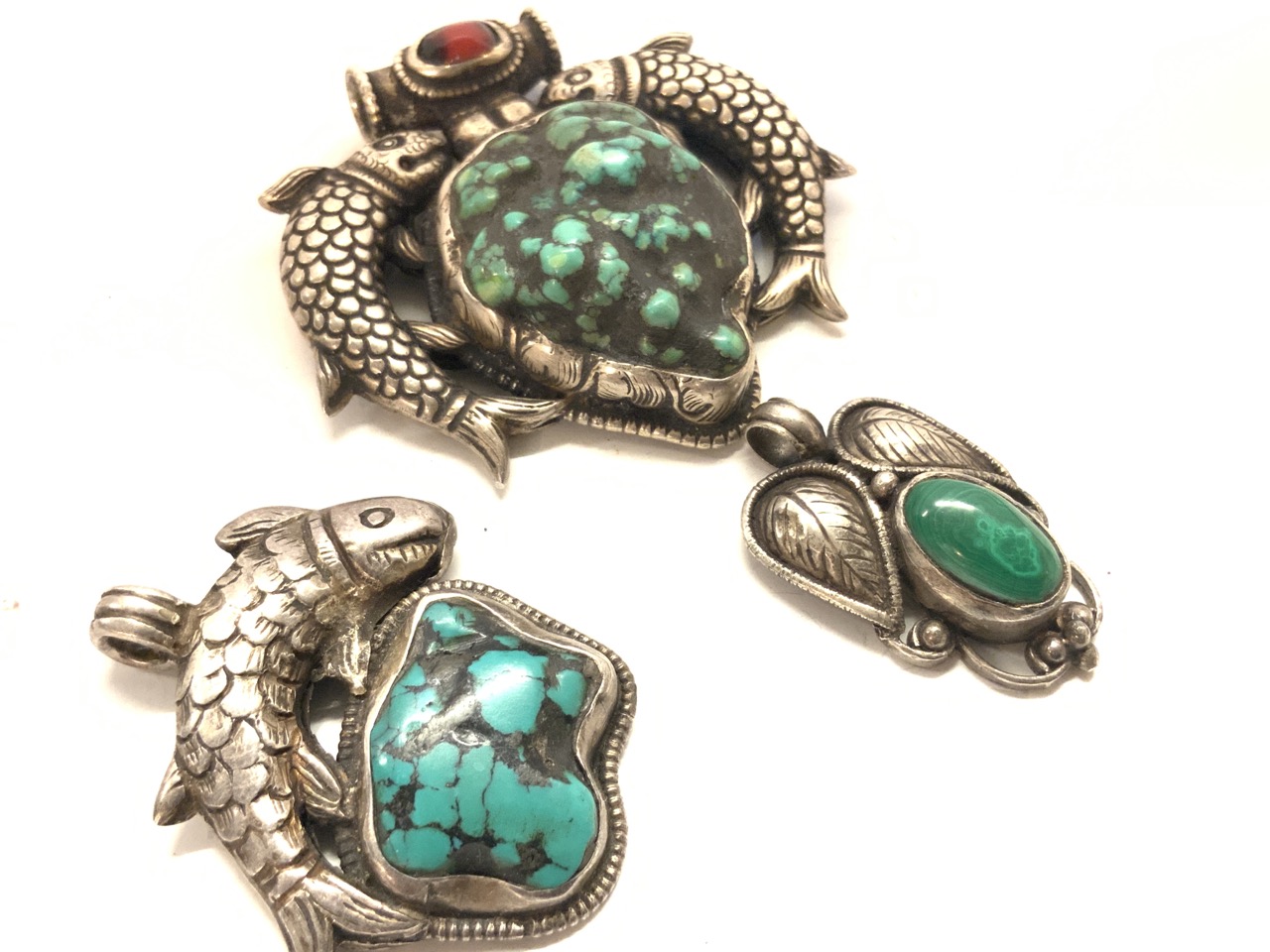 Three Nepal Sterling Silver Pendants With Turquoise And Malachite Stones.