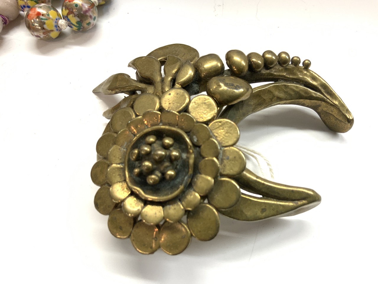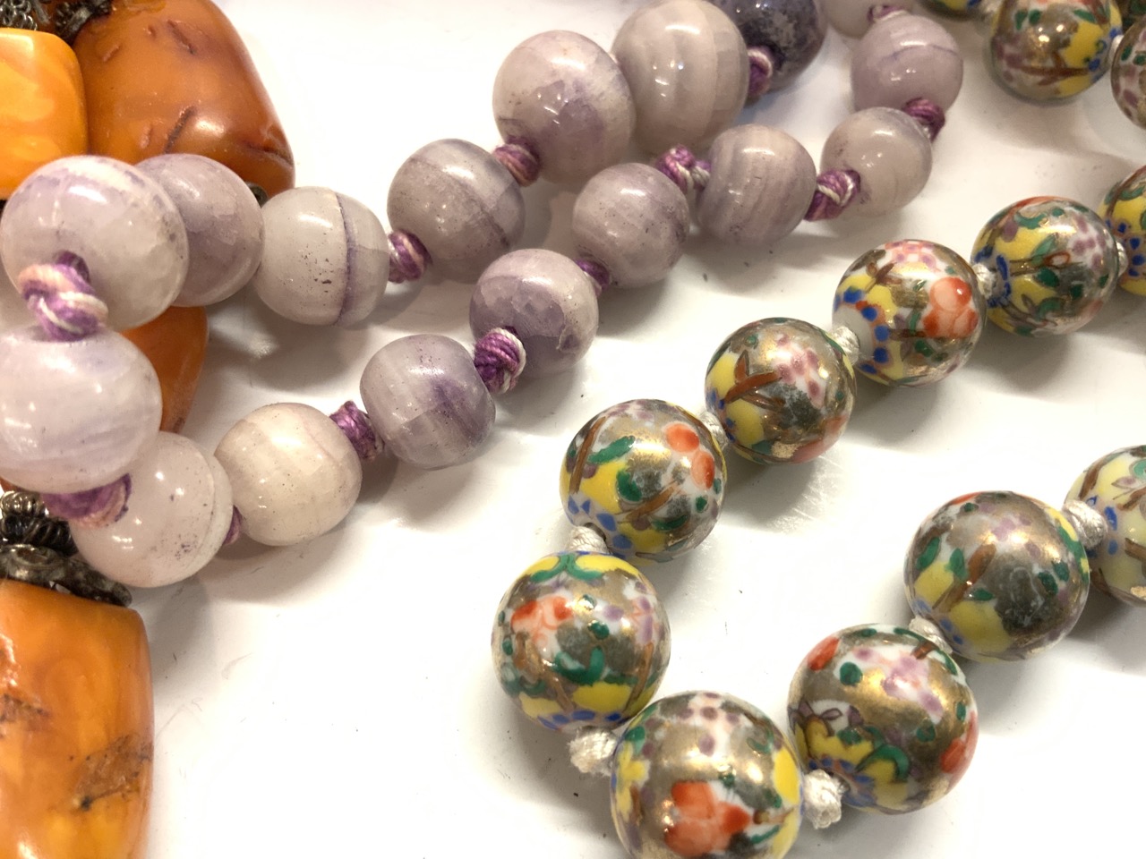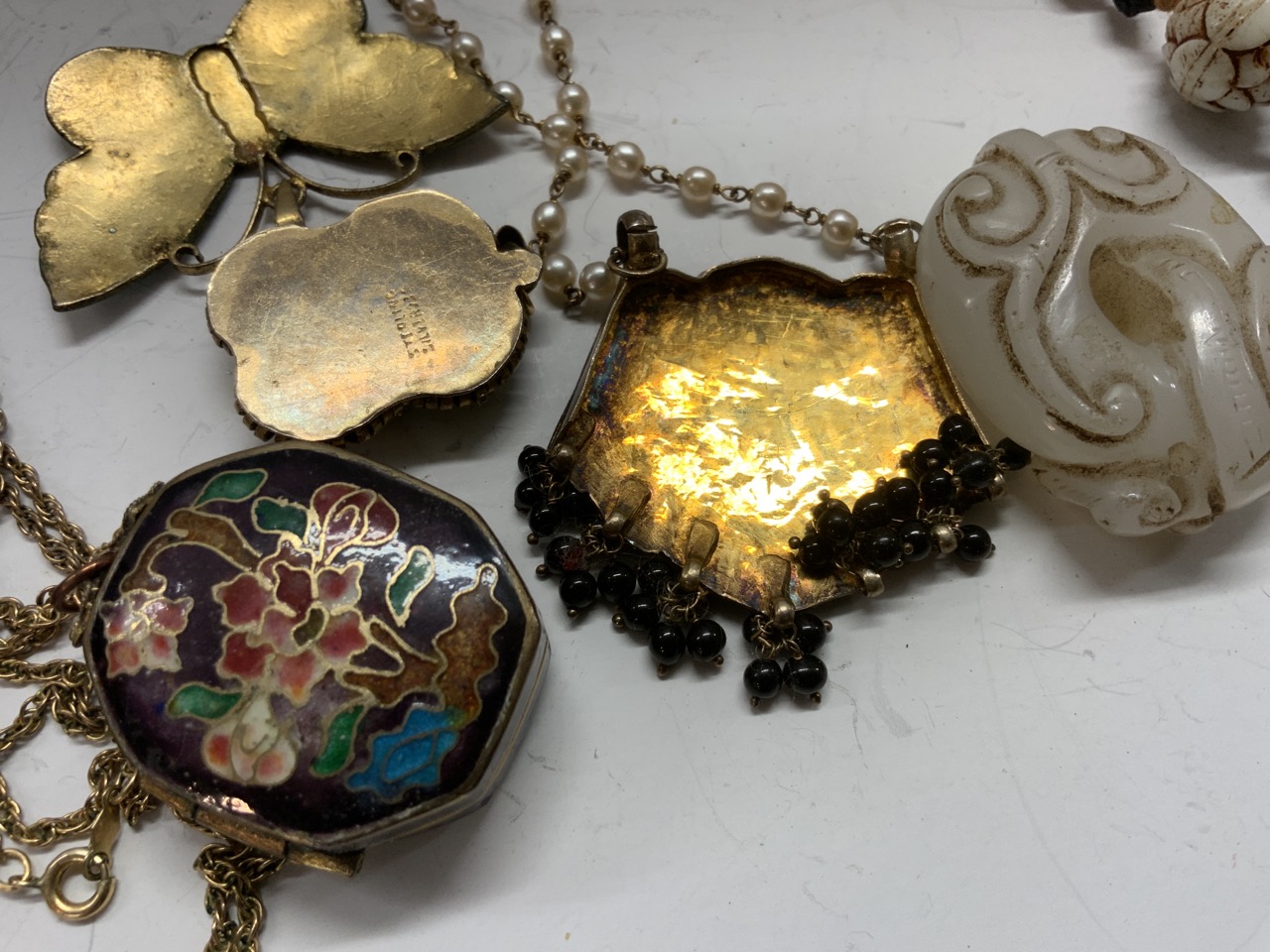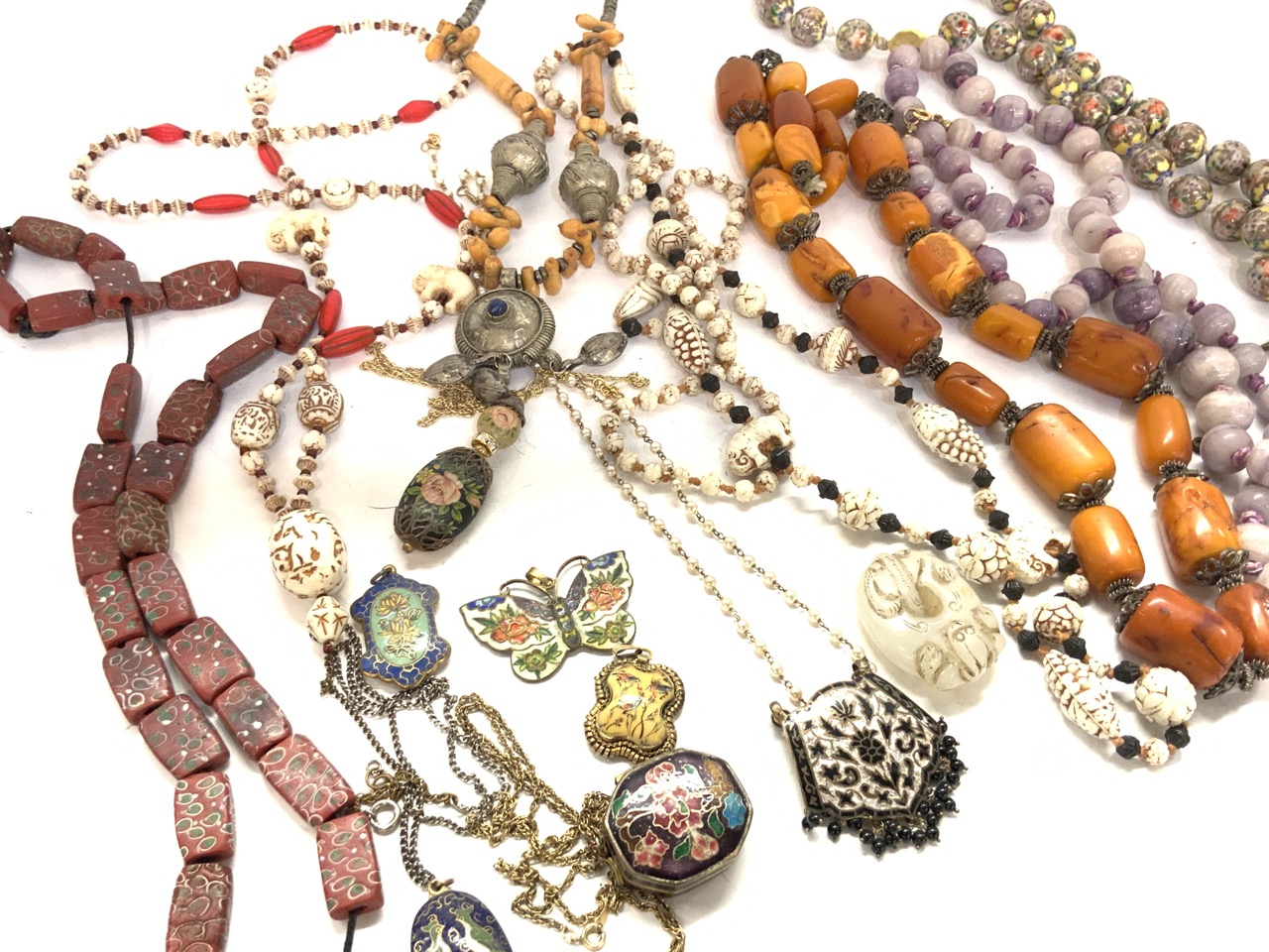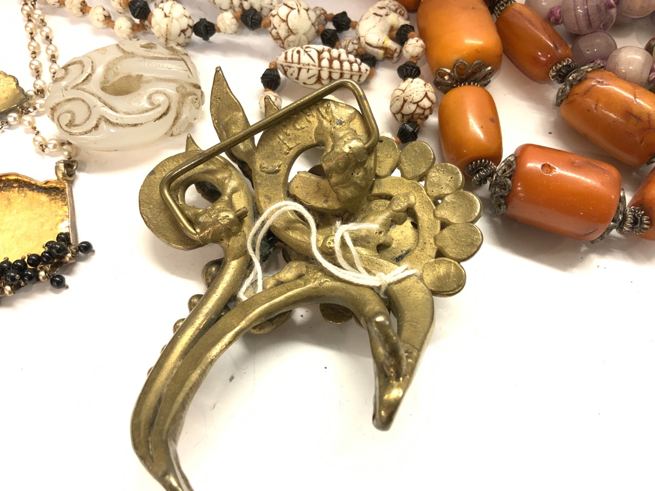 Assorted Estate Jewelry Grouping. Chinese glass bead, Silver filigree pendant, Silver with black enamel pendant with chain, Trade beads, Heavy Brass Bucklet, Amulets etc. As seen in photograph preview.