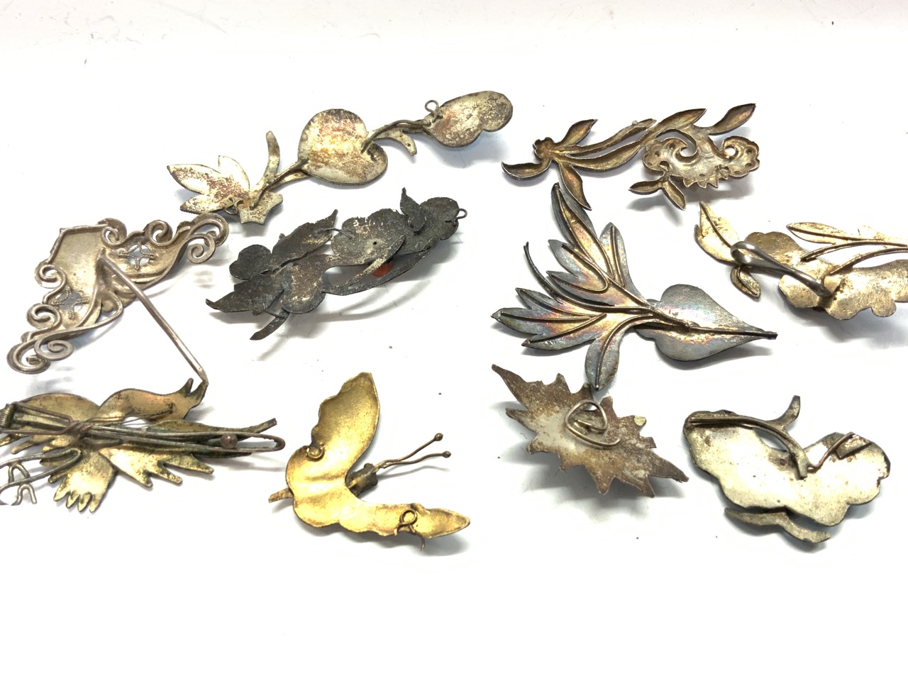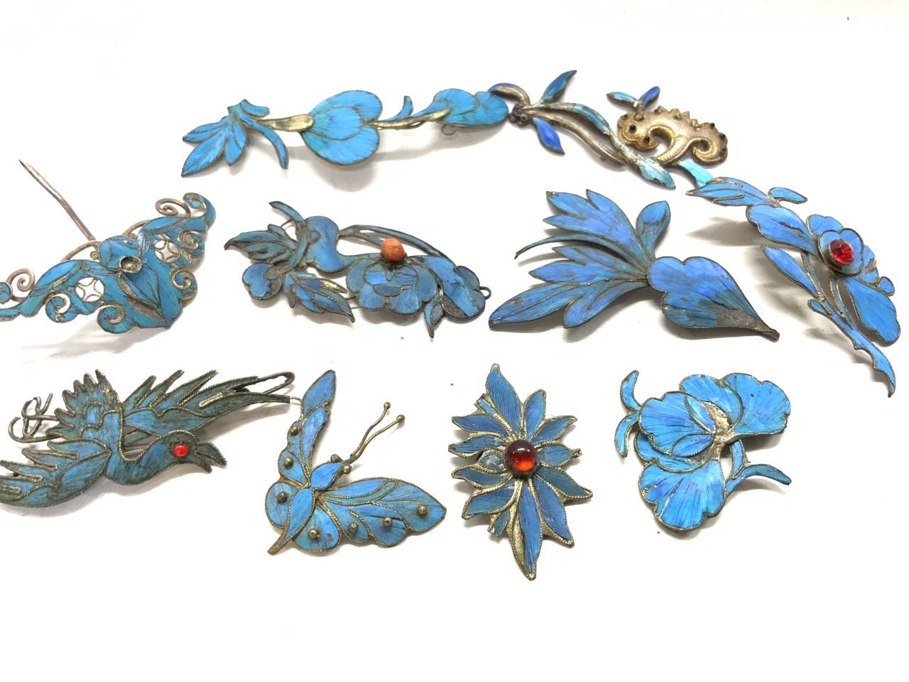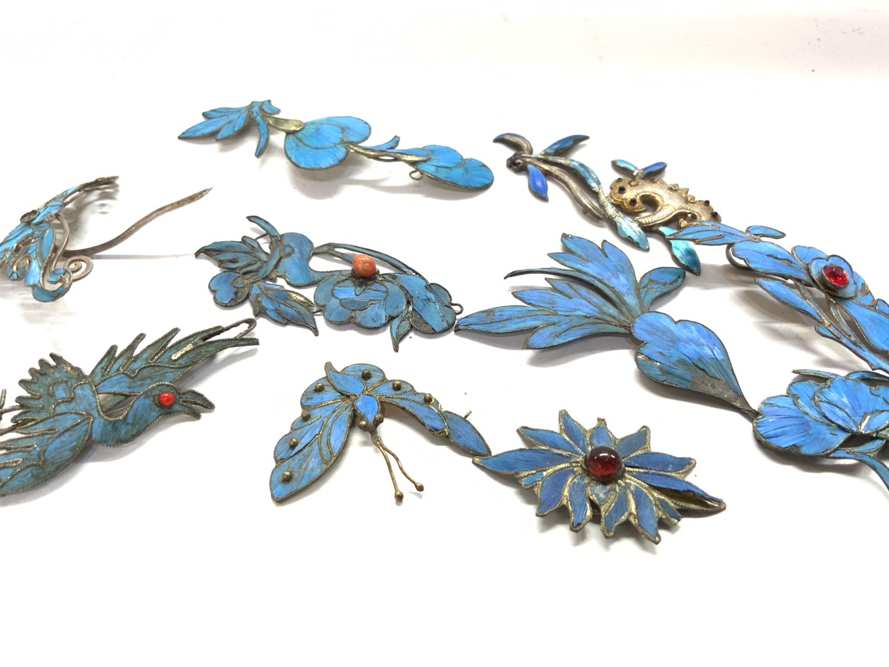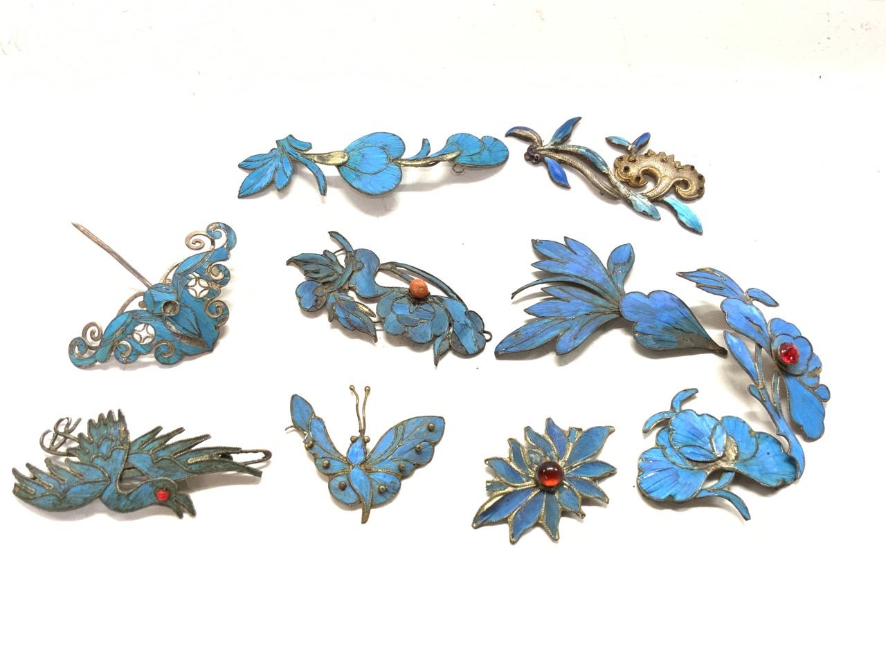 Ten (10) Antique Chinese Kingfisher blue fragments and adornments.