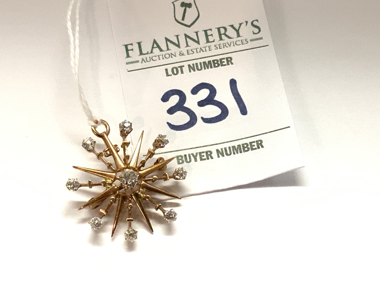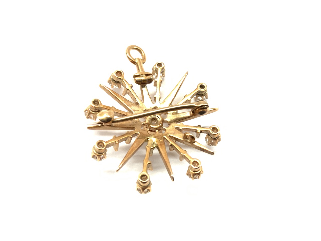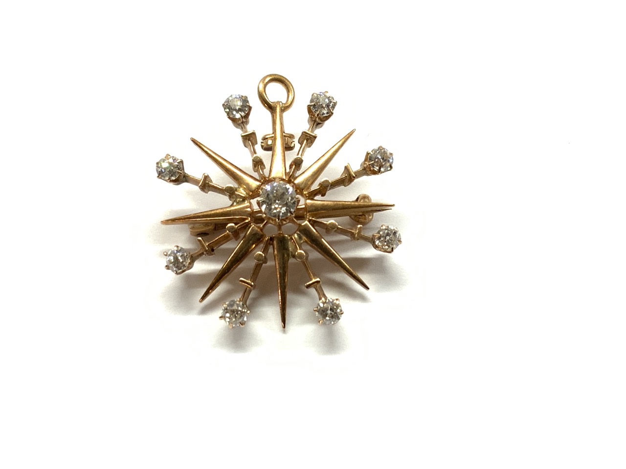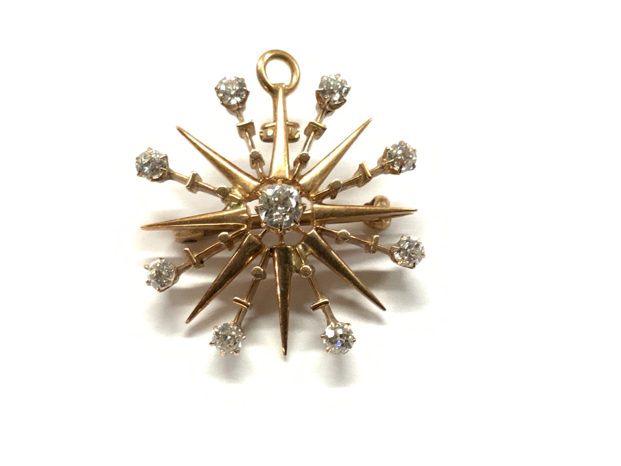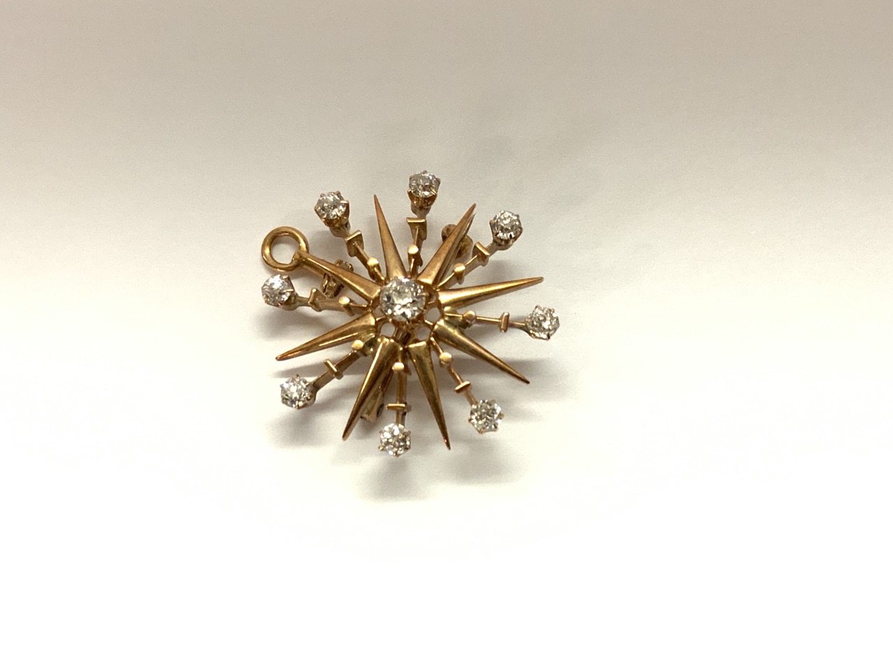 A 14k yellow gold diamond starburst pendant with eight brilliant diamonds.