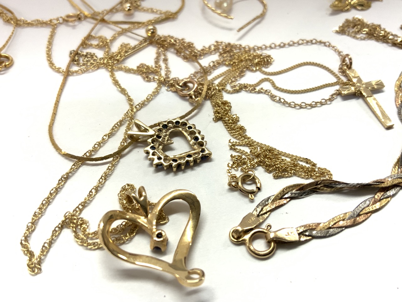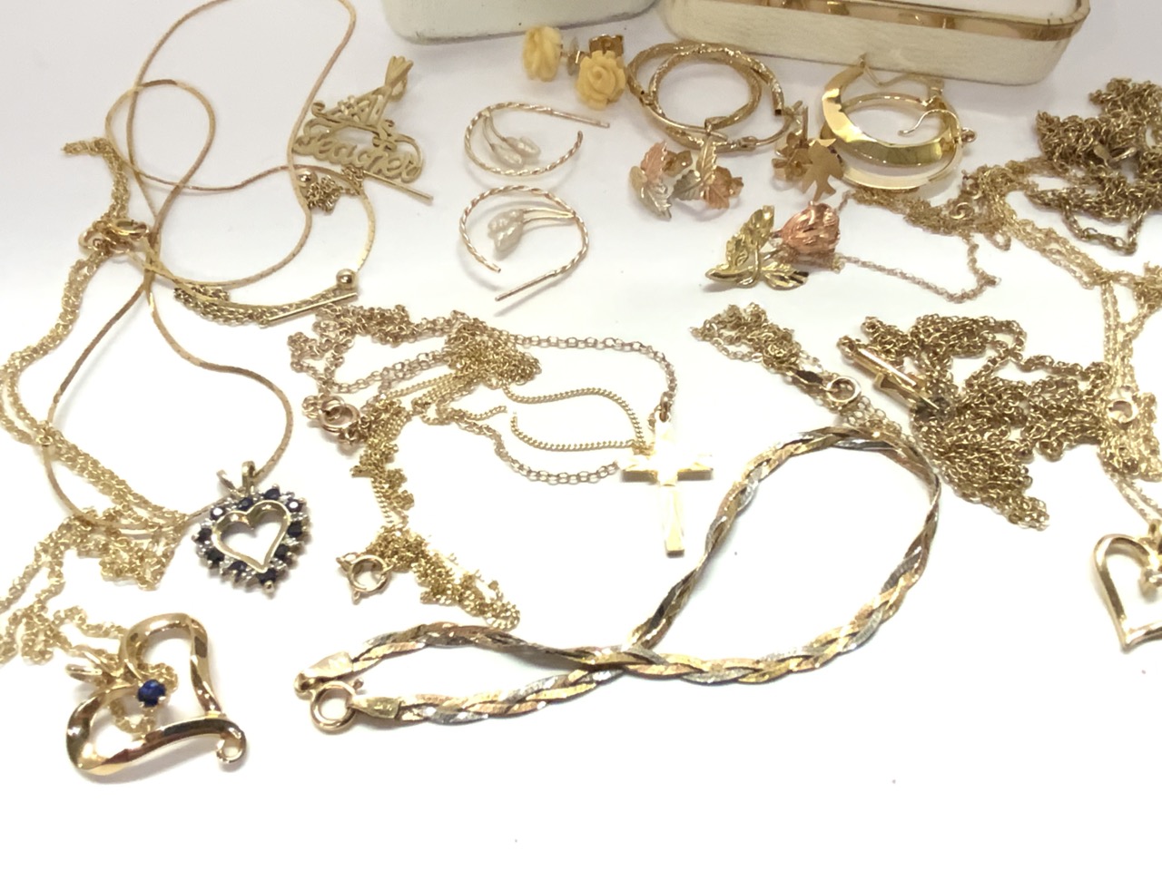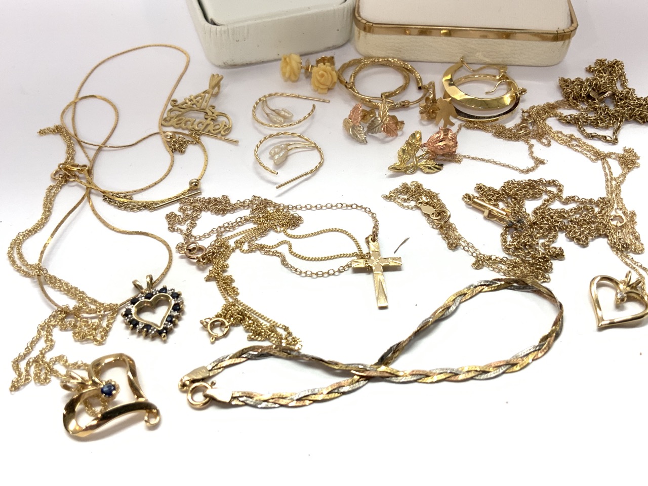 Compiled 14k gold jewelry. Earrings, pendants and necklaces as seen in photograph preview. Cloisonne earring not included in weight.