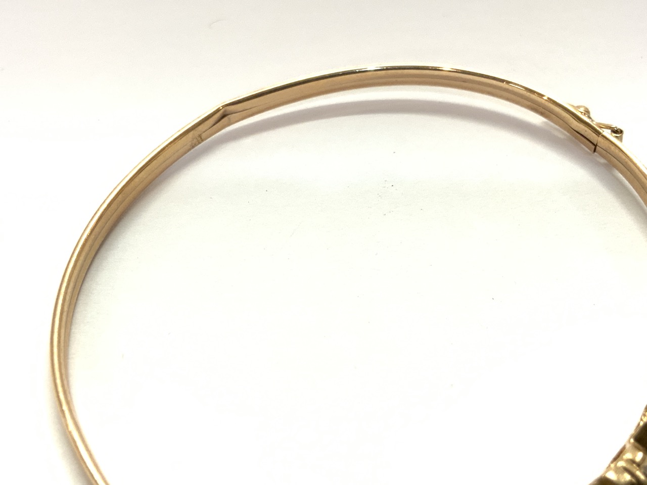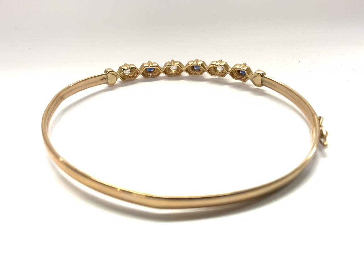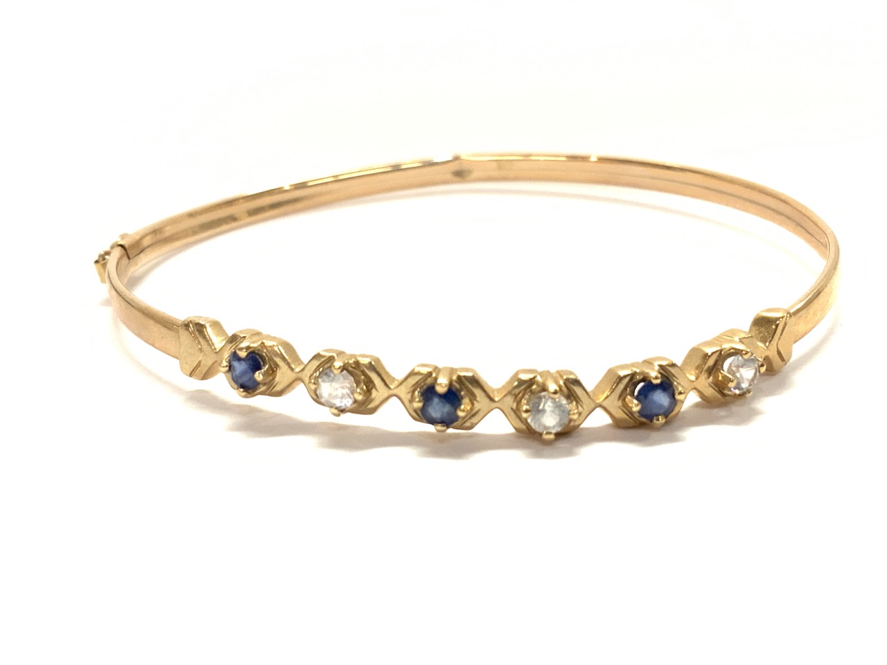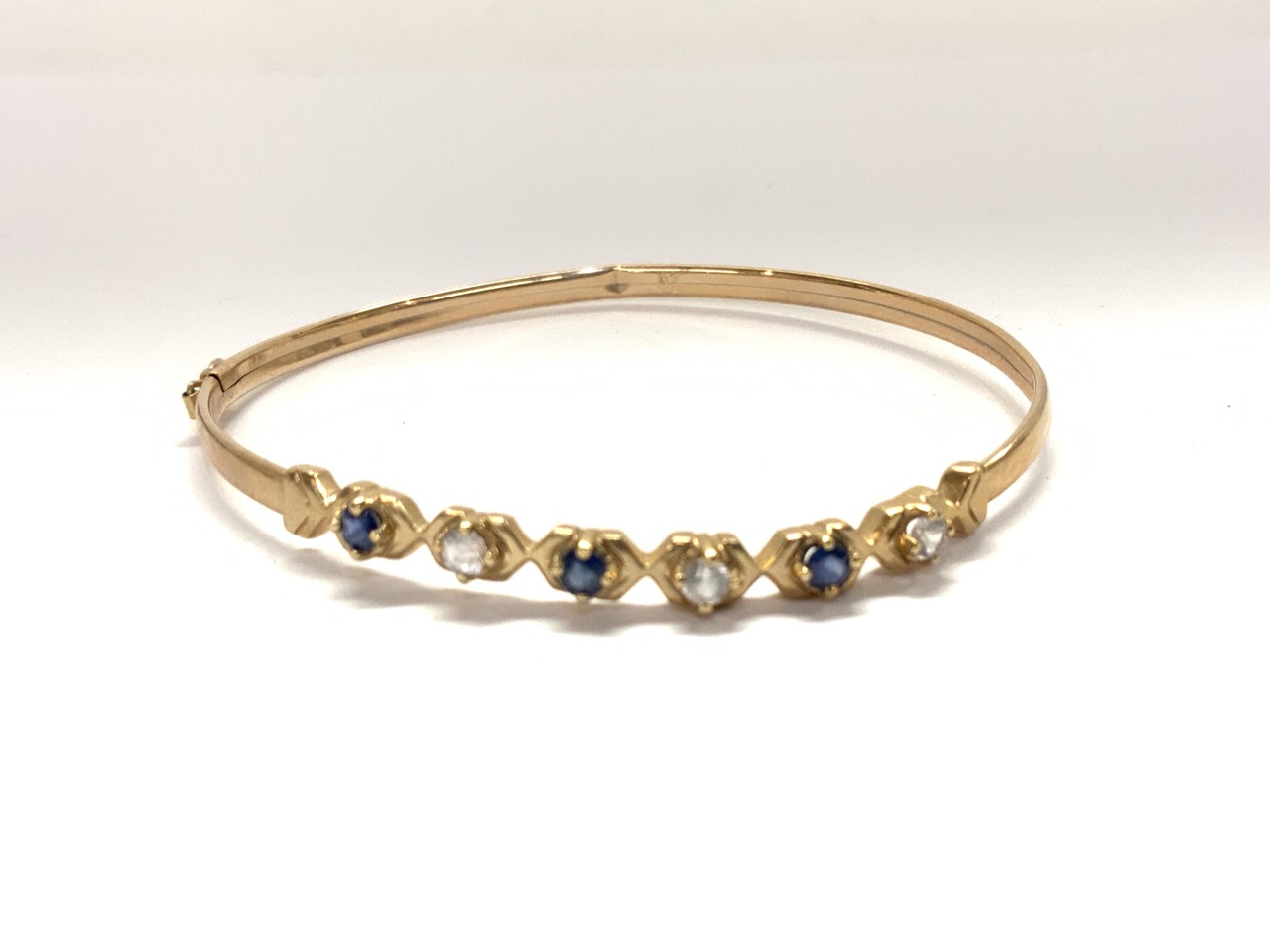 14k blue and white sapphire hinged bracelet. Slightly dented.