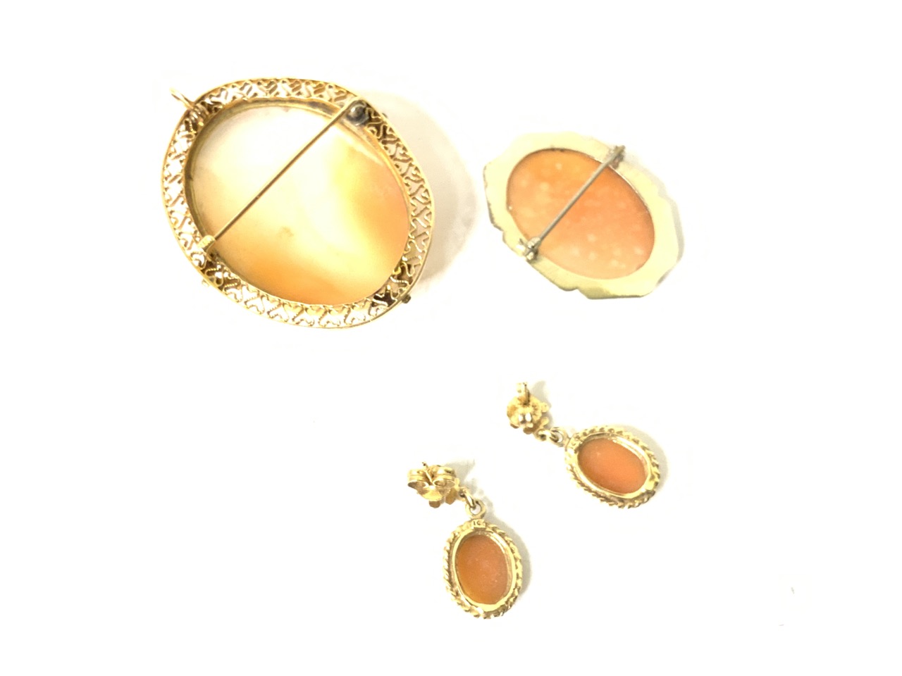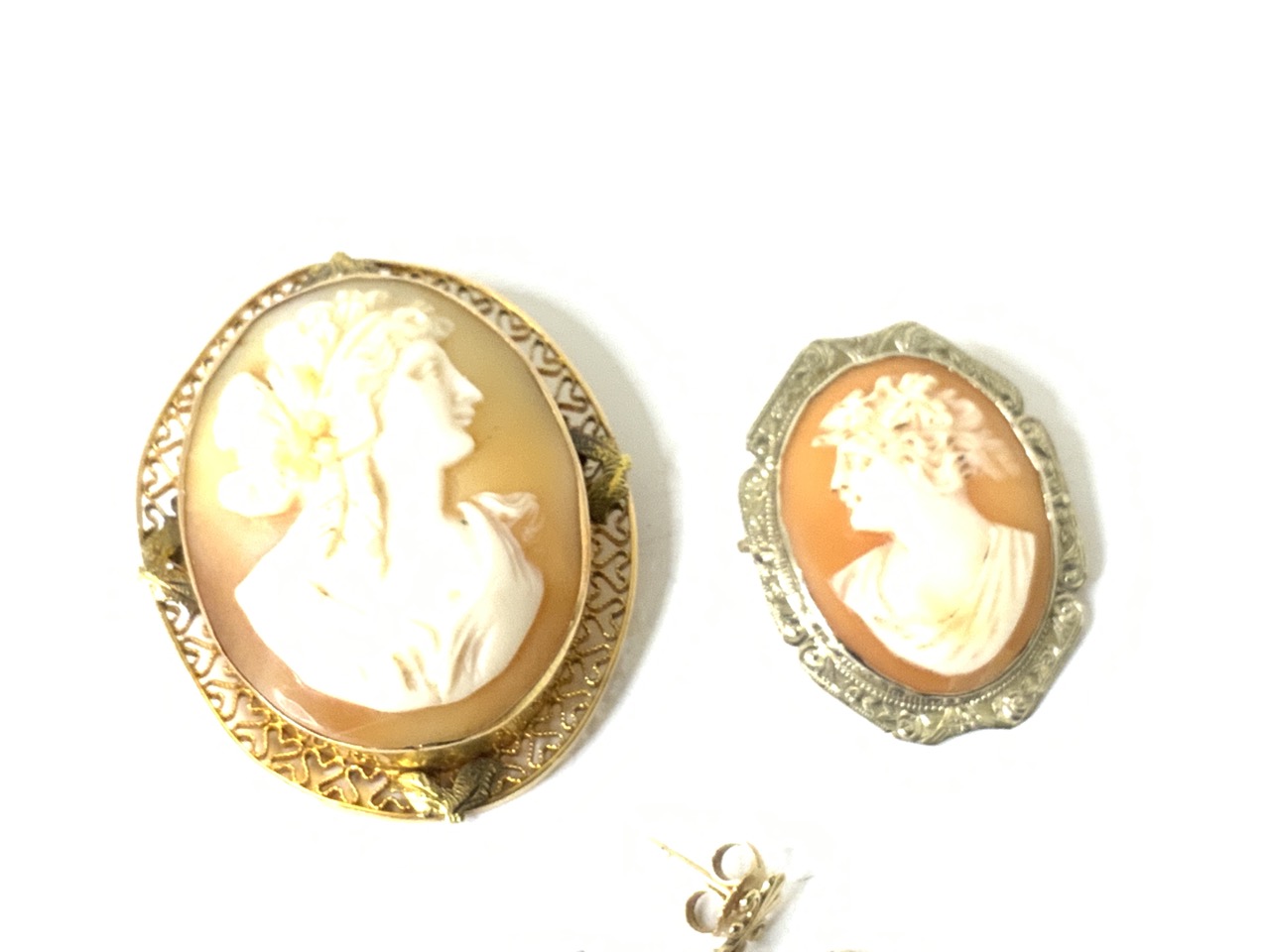 Two (2) 14k gold cameo brooch pins and a pair of 14k cameo earrings.