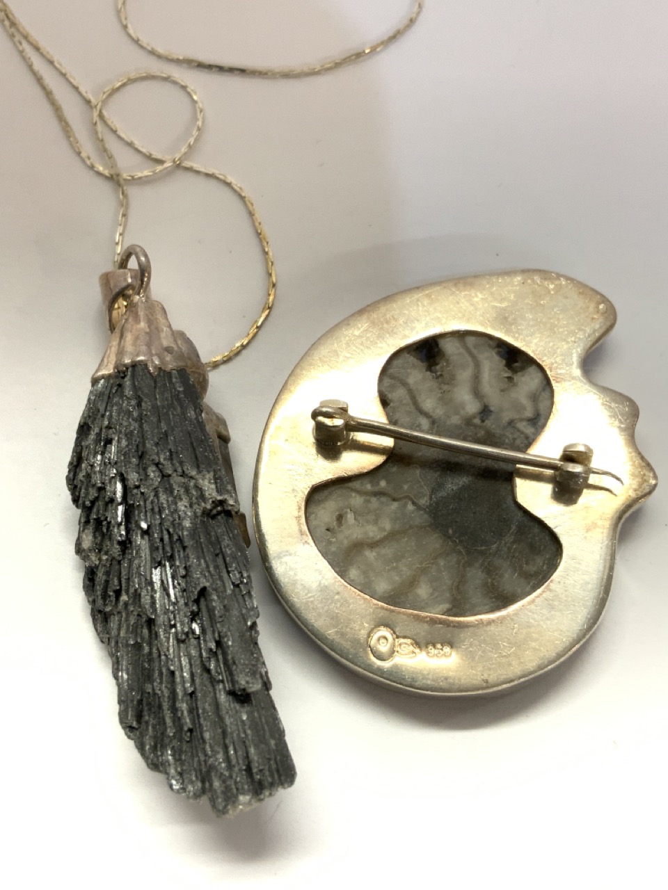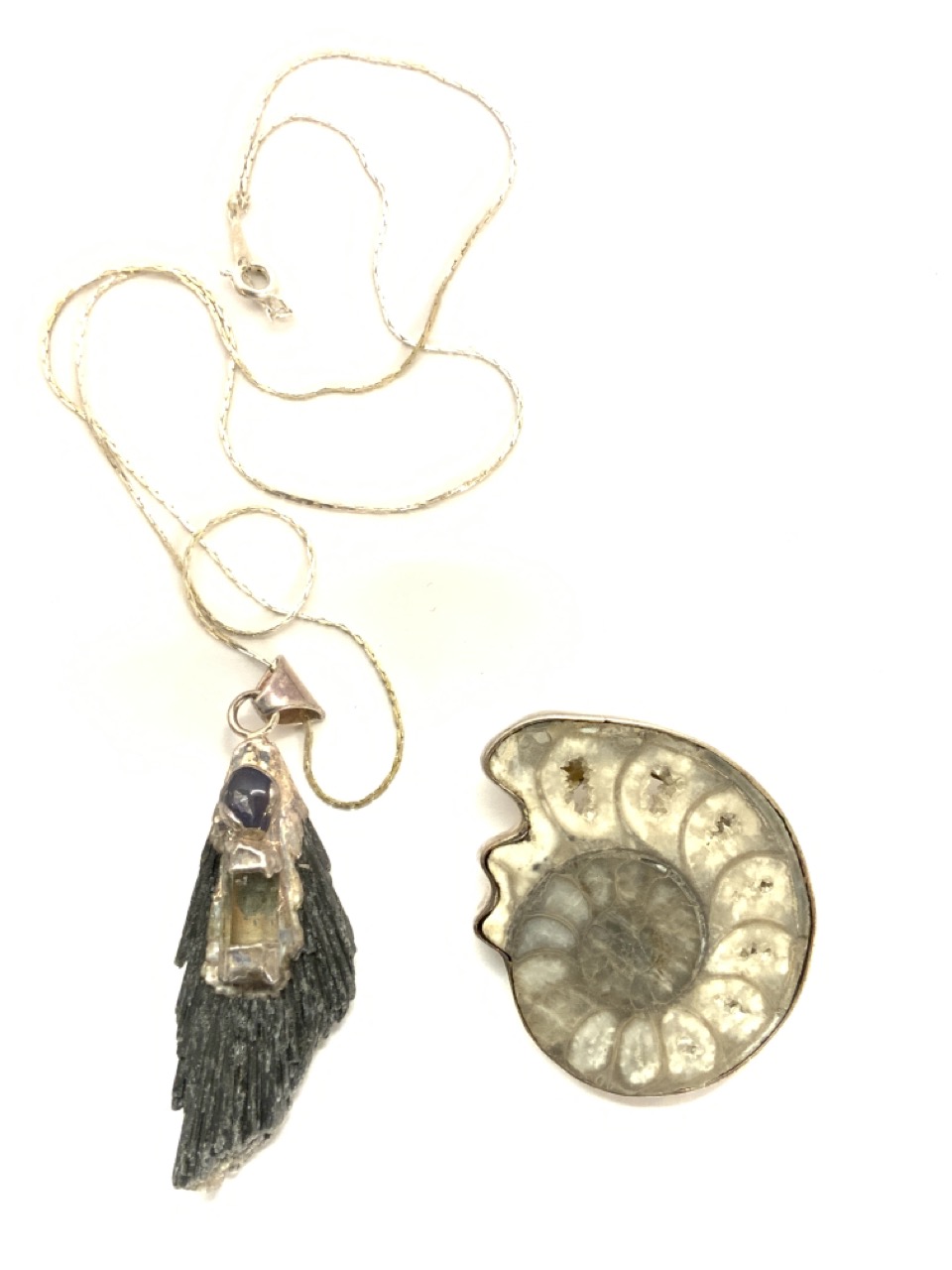 Two (2) Artisan sterling silver pendants. 950 fossil and amethyst with rock.