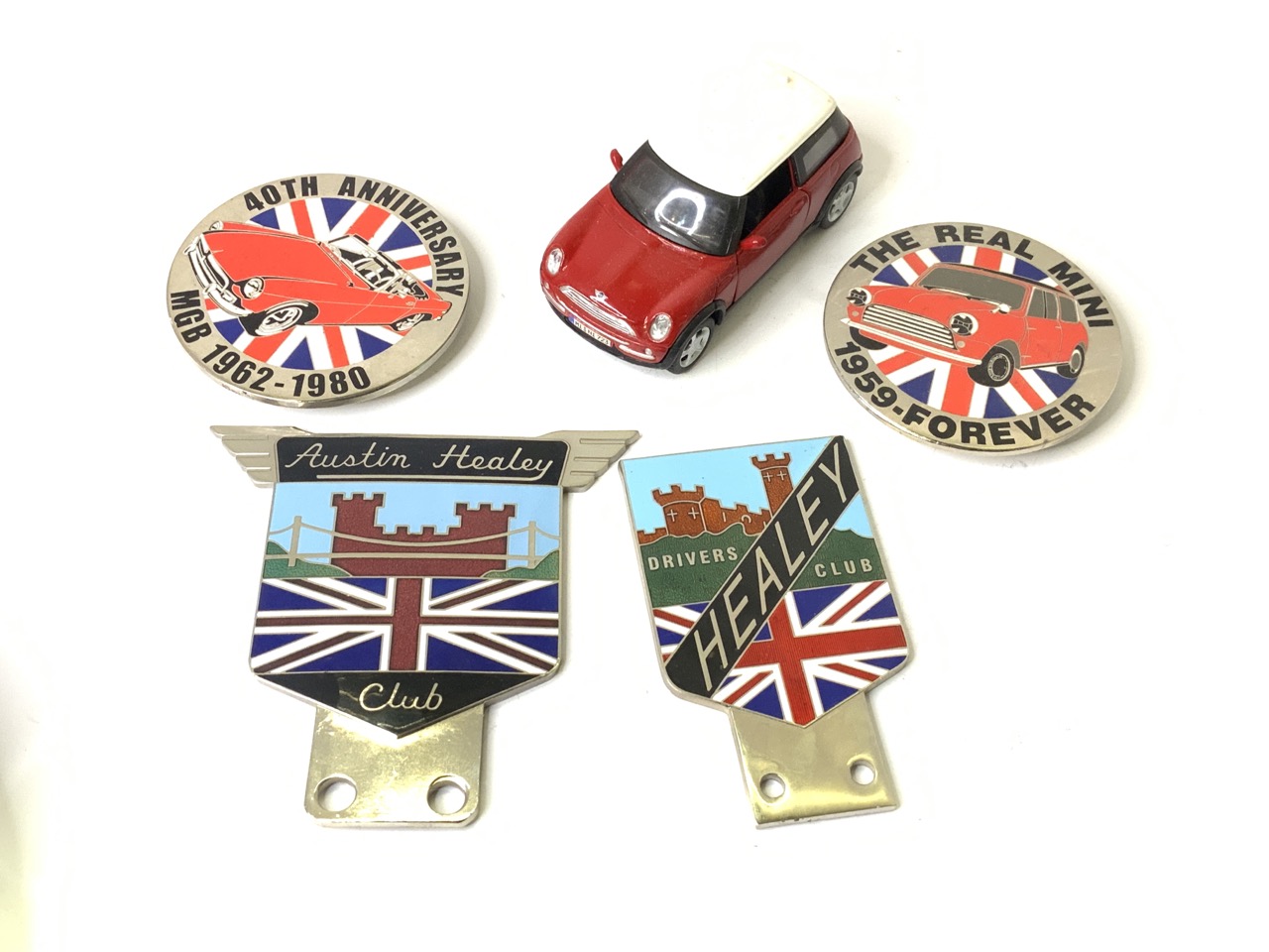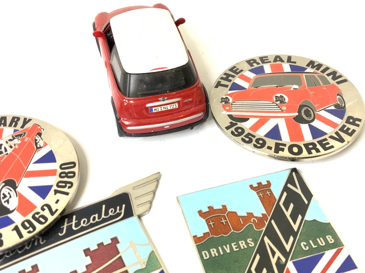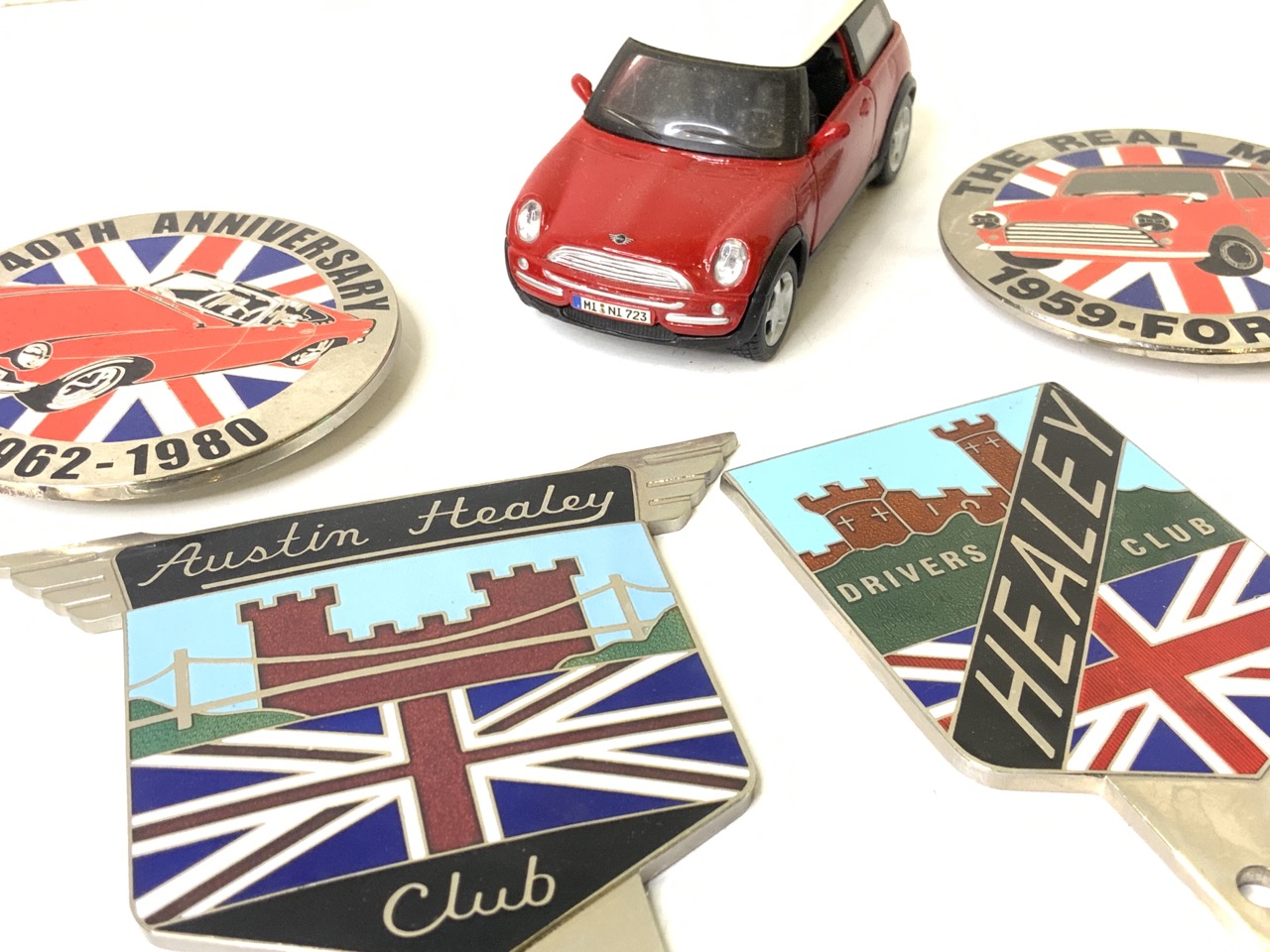 Five (5) Estate compiled car club emblems. Austin Healey, British Motor Works etc. As seen in photograph preview.