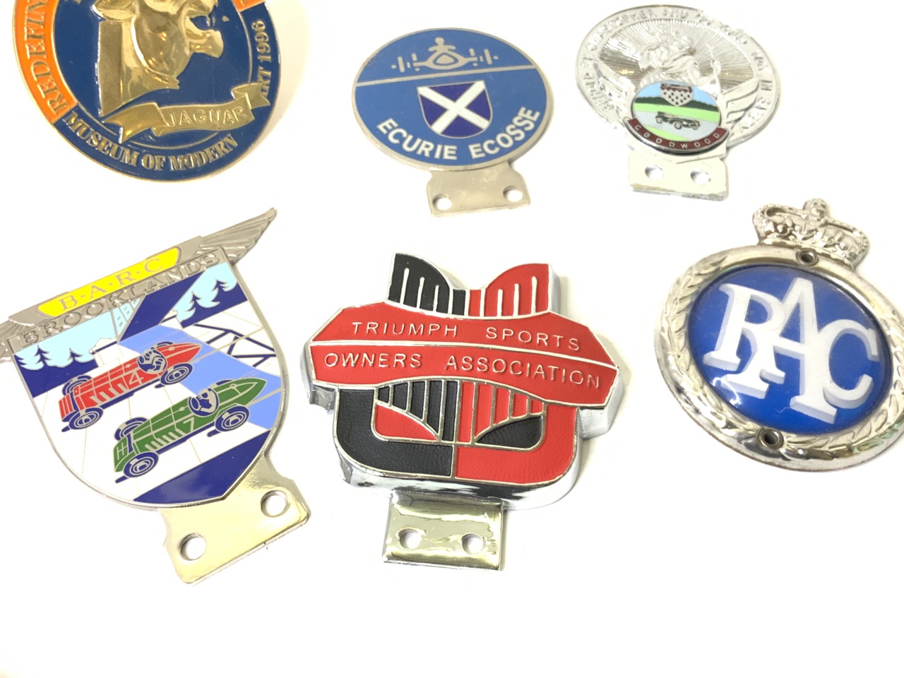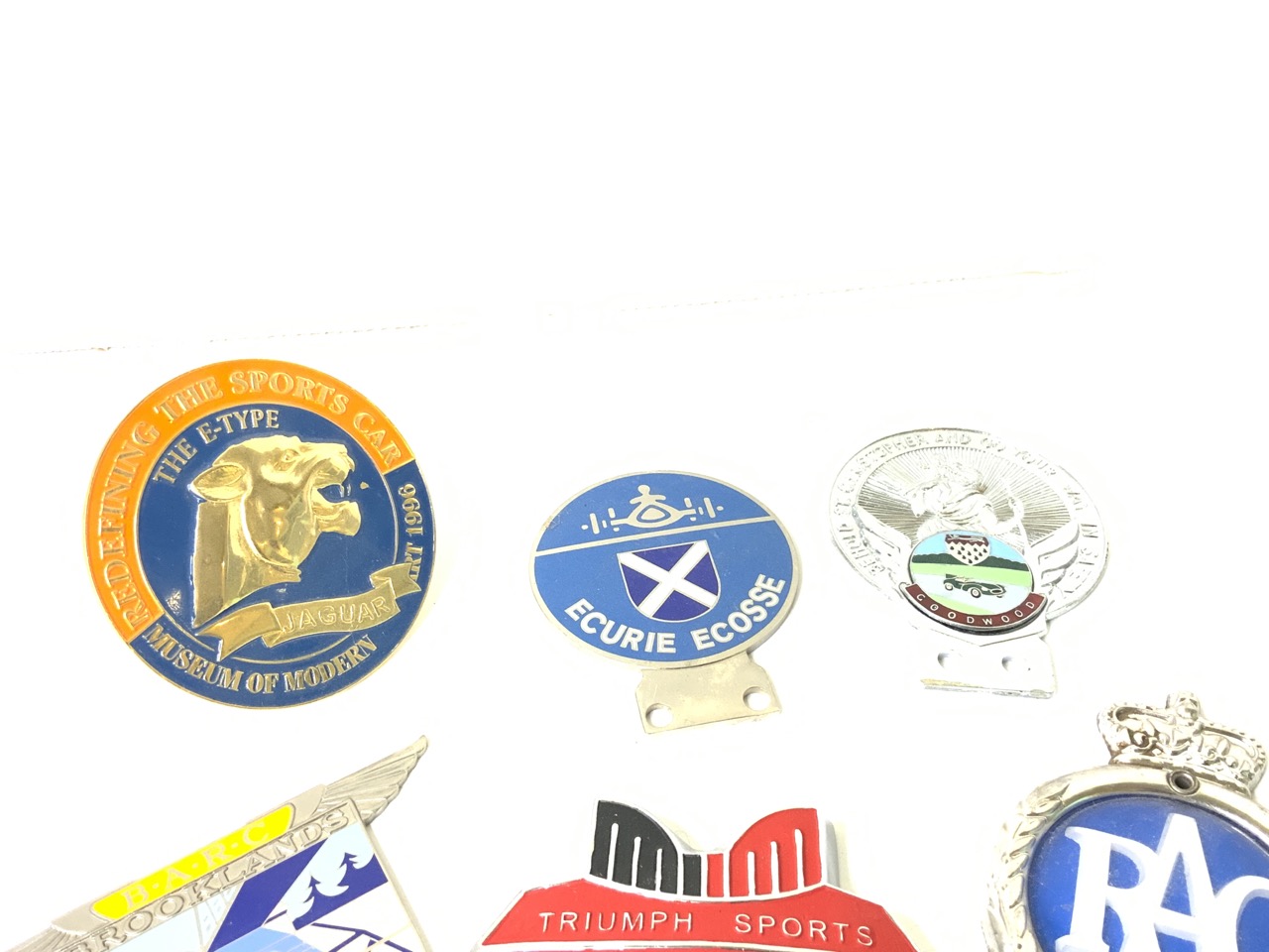 Compiled estate collection of car club emblems. As seen in photograph preview. Triumph Sports, RAC, BARC Brooklands, Jaguar, Goodwood