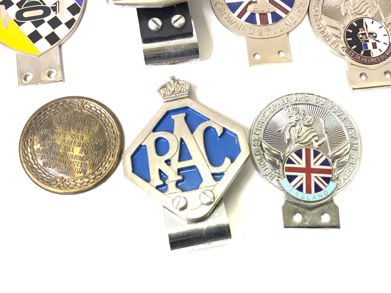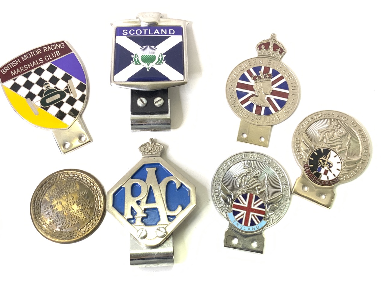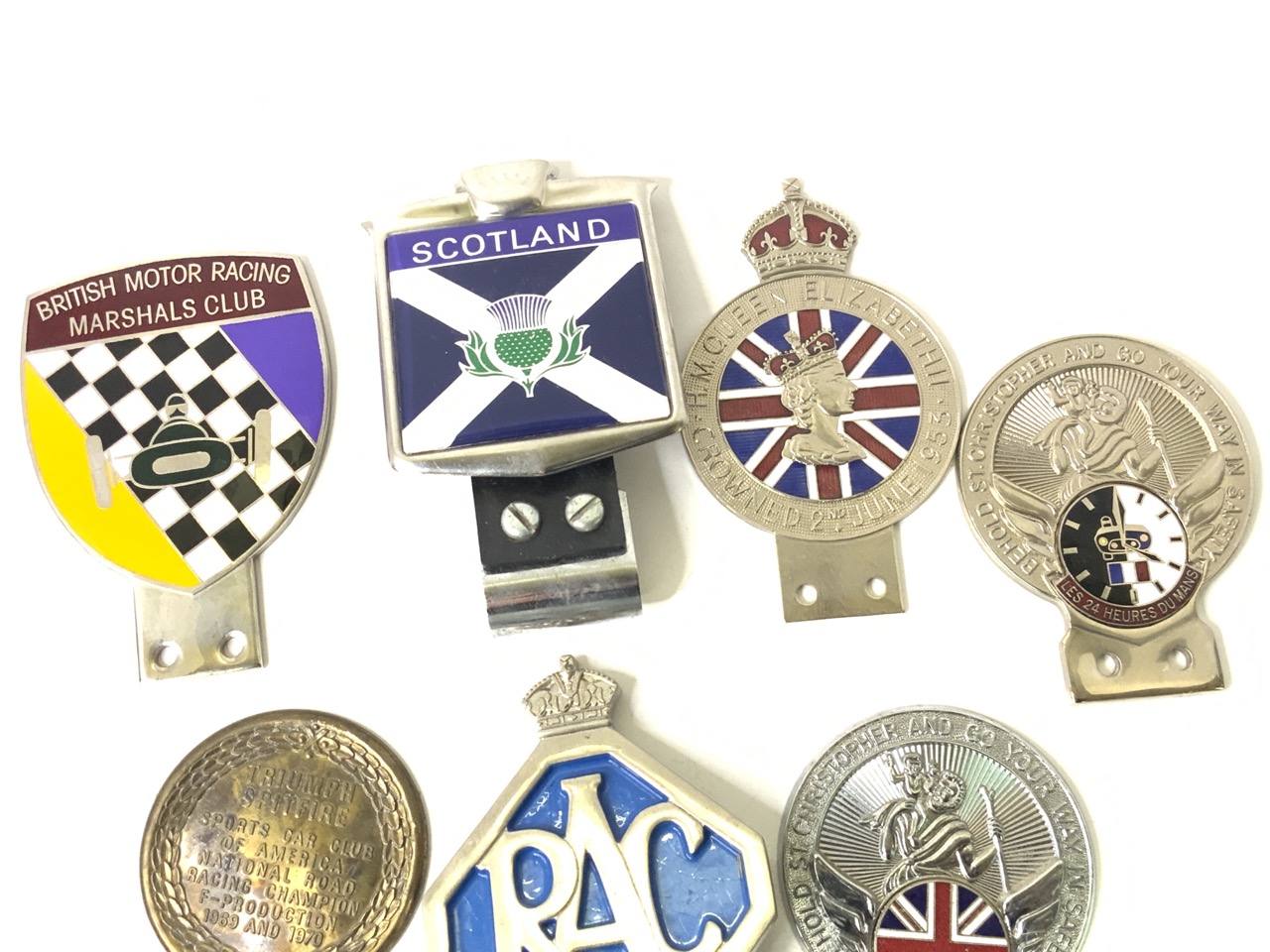 Compiled estate collection of car club emblems. British Motor Racing, Scotland, Queen Elizabeth, RAC, Triumph Spitfire, England, France