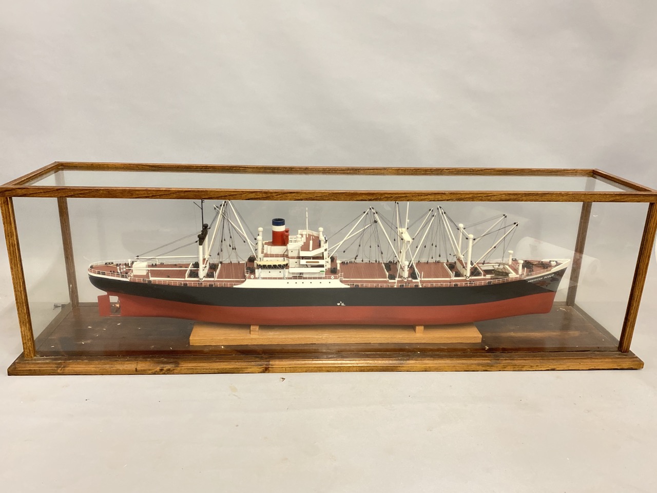 A fine American Scout ship model housed in oak and glass case. Dimensions: 18 inches height x 59 1/2” width (almost 5 feet total)