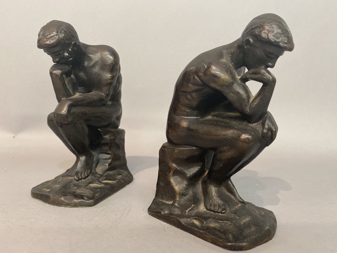 After Rodin's sculpture "The Thinker," stamped and dated G.H. Inc. / NYC / 1928. A pair of bronze bookends. Good patina. Dimensions: 7.5" h Condition Report: Even patina, minimal wear. Please see photograph preview or call.
