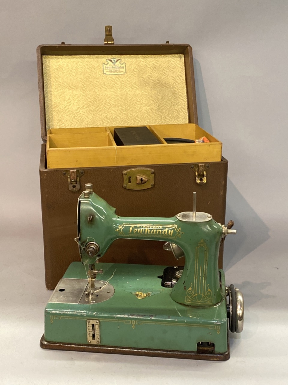 Vintage Standard Sewhandy Sewing Machine By General Electric. Green enamel with case, directions, attachments etc. Dimensions: 9.5” x 12” x 7”