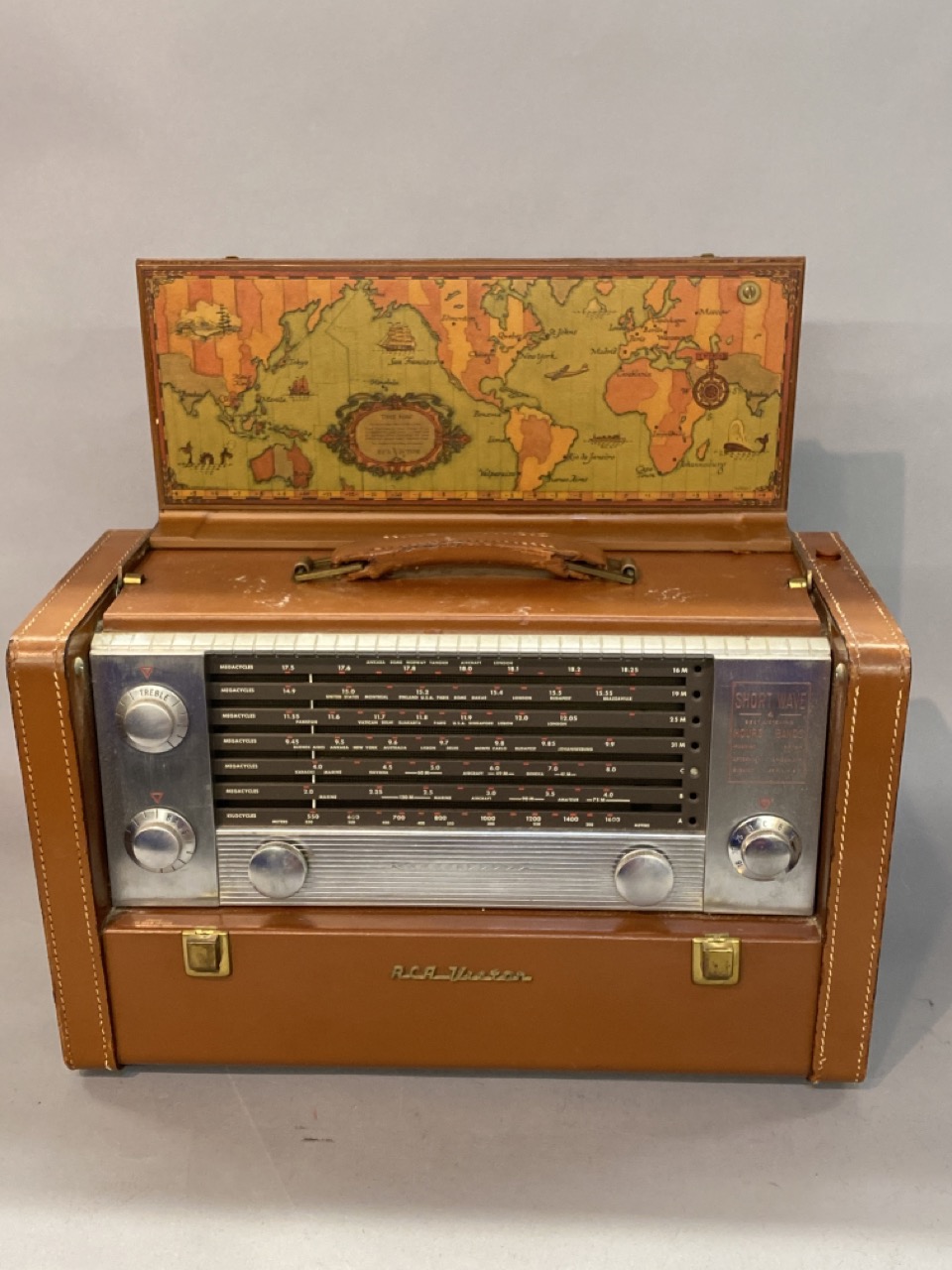 RCA Victor short wave worlds radio model three Dash BX- 671 serial number 034637. Condition Report: Very good, some scratching and minmal wear to cowhide casing. Working order. Please see photograph preview or call.