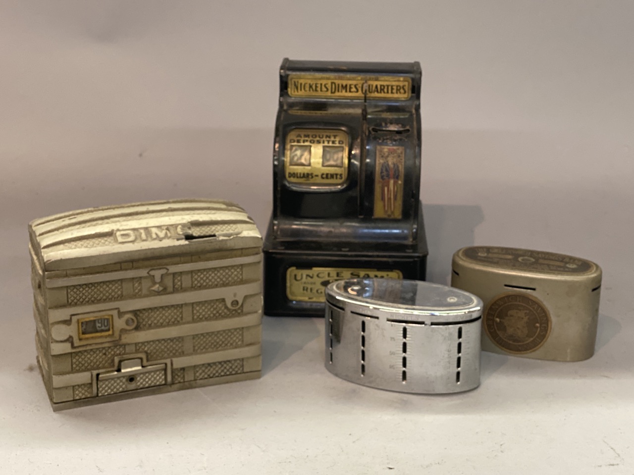 The H & H registering savings bank trunk for dimes with counter patented March 13, 1888 June 12, 1888, Uncle Sam’s register bank ,Greenwich savings Bank and New Model Clearview Bank. Condition Report: Break on side of Dime bank. Please see photograph preview or call.