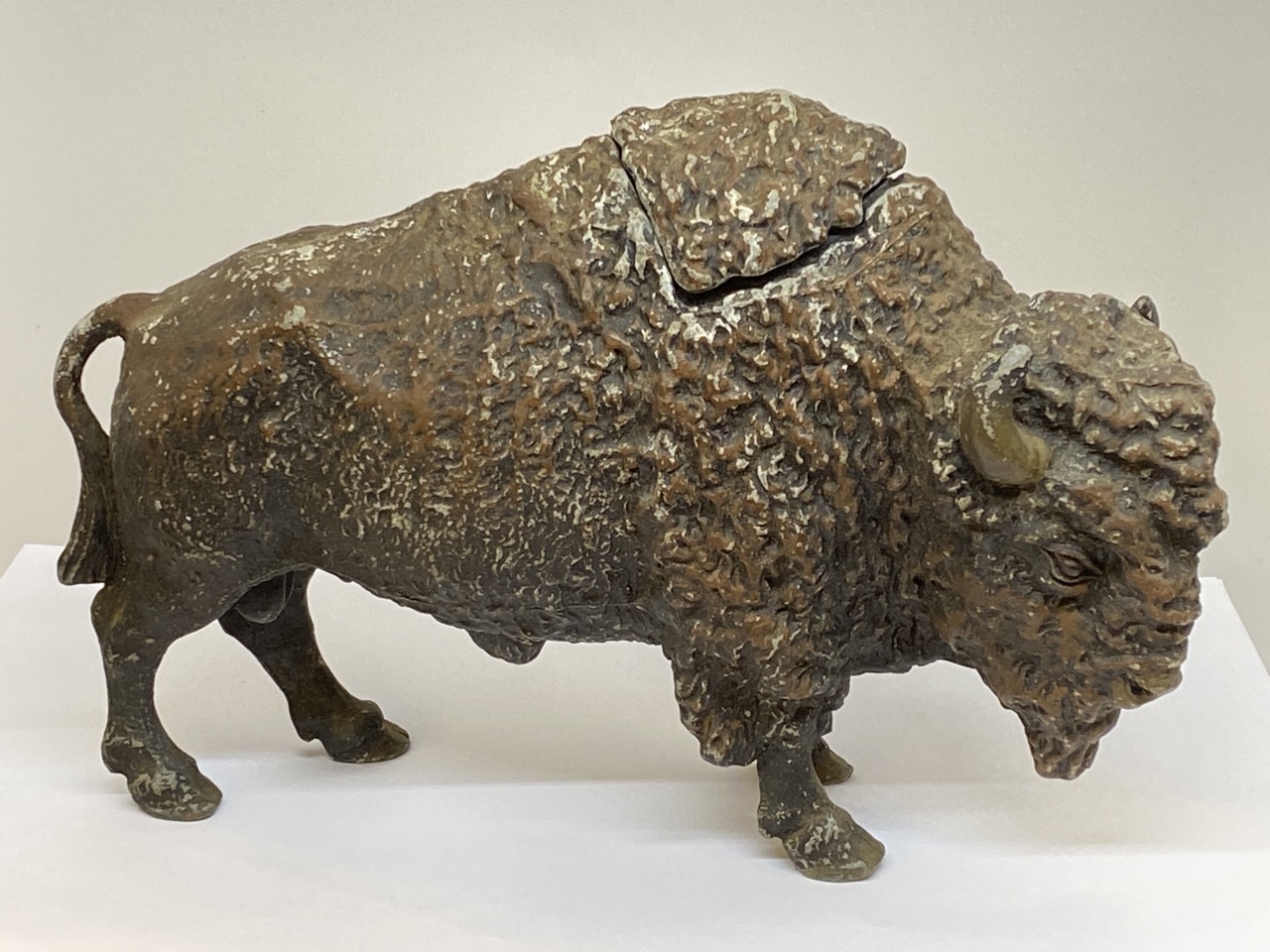 An antique spelter metal figural buffalo inkwell. Dimensions:6 inch height x 8 1/4 inch wide