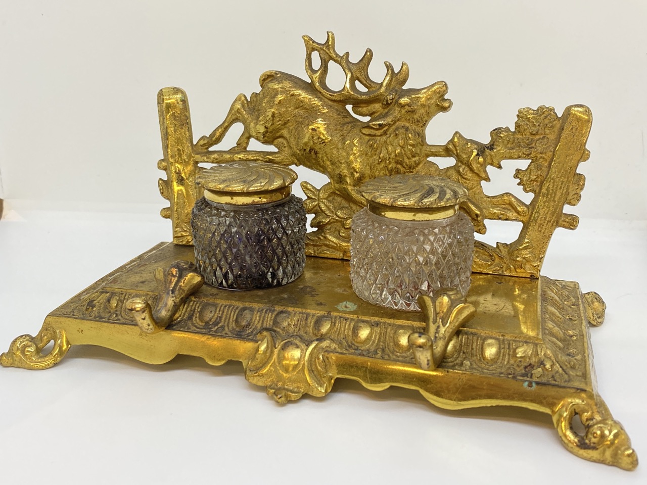 A Victorian Desktop inkwell of a "Stag being hunted". Signed at base for Bradley & Hubbard B&H. Dimensions: 5"h X 9"w X 5"D Condition Report: Some finish wear, corrosion from storage. Barn find. Please see photograph preview or call.