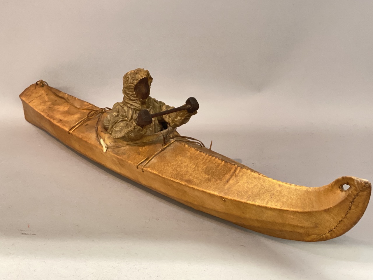 Vintage Alaskan Inuit carved wood figure in a hide covered canoe. Dimensions: 5 1/2"h X 26 1/2"L Condition Report: Some loss to covered over head. Please see photograph preview or call.