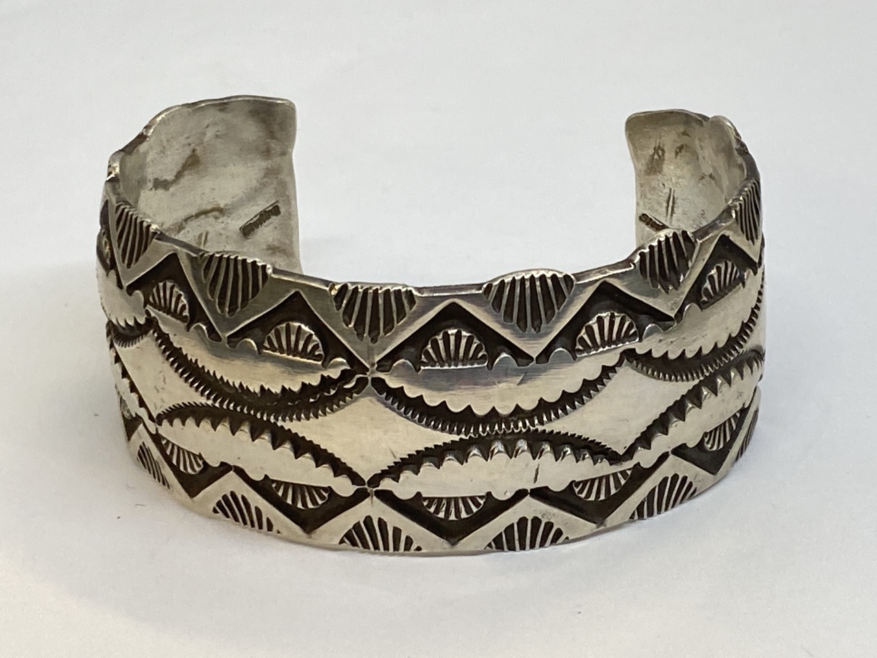 Indian sterling silver cuff bracelet wide band (1 1/4"). Marked sterling. Total weight: 2.6 troy ounces