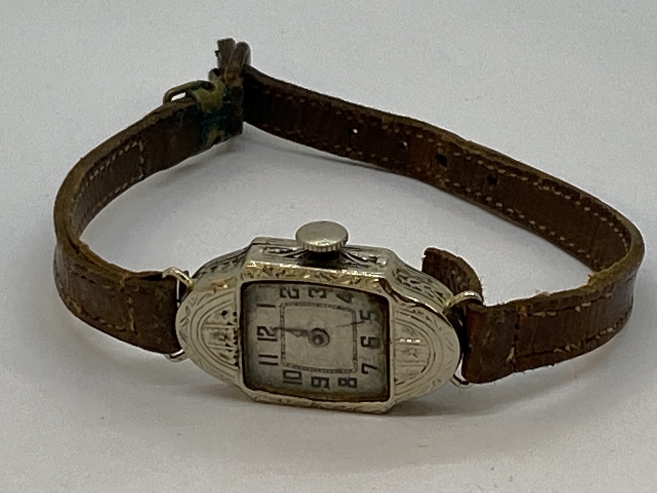 14k white gold Art Deco period ladies wrist watch with leather band. Conditon Report: Not working. Please see photograph preview or call.