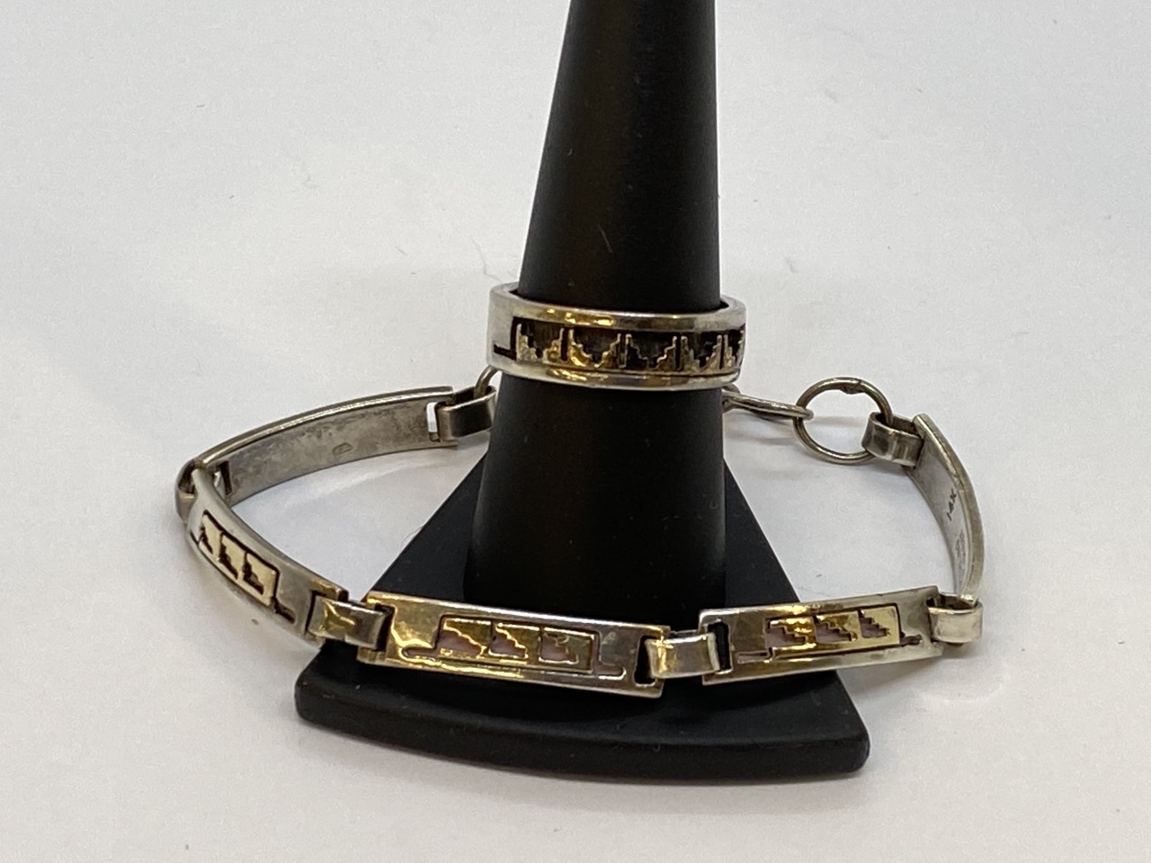Native American 14 karat and sterling silver ring and bracelet, Signed P.SKEET Size 8 ring, 7" bracelet Total weight: 19.7 grams