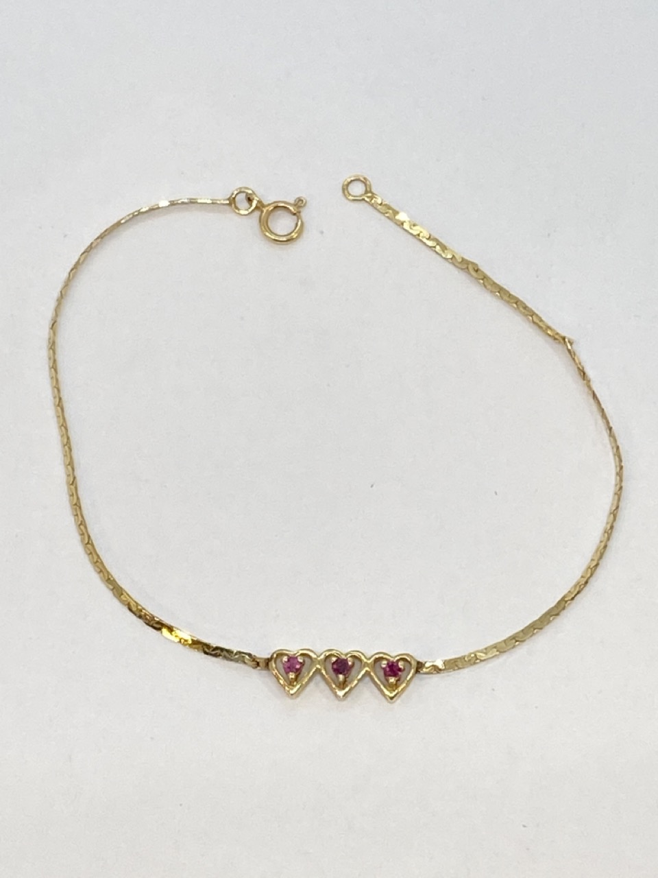 14k yellow gold ruby heart bracelet. 7" length. Total weight: 1.5 g