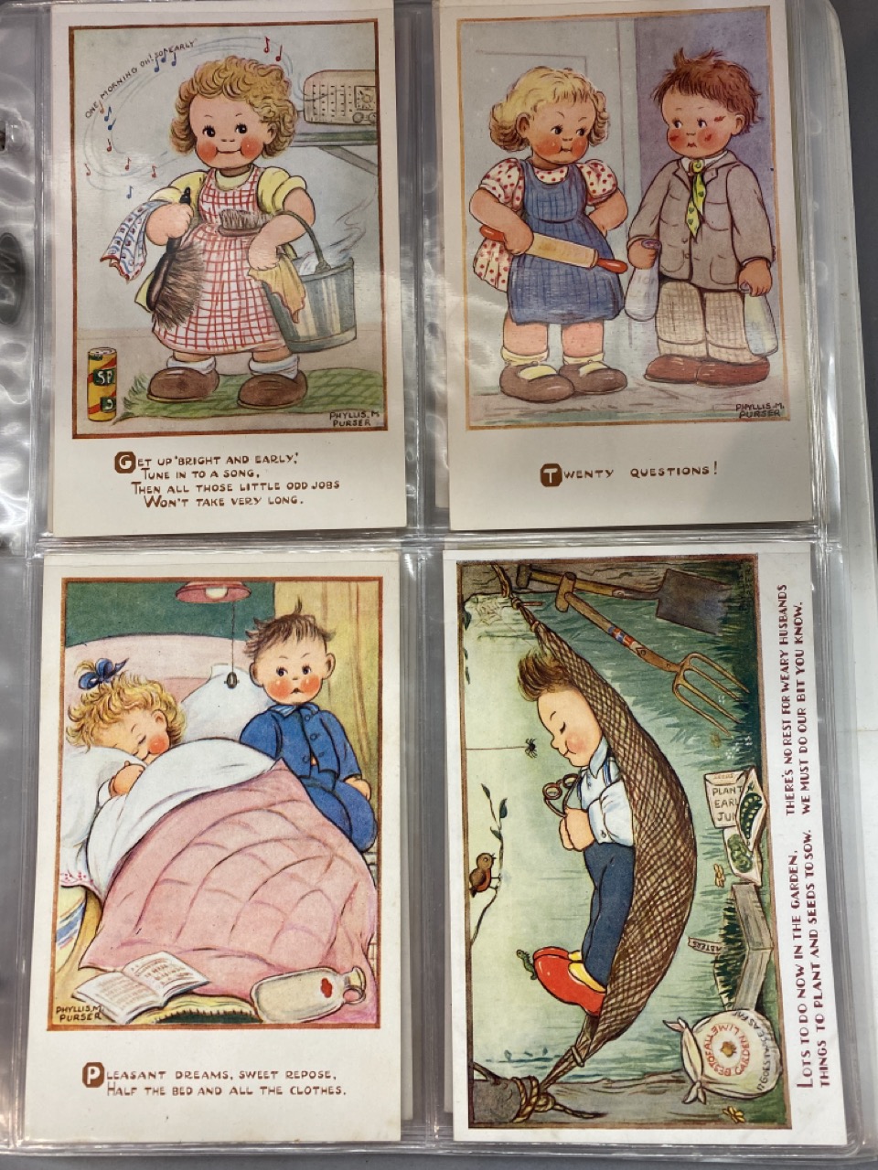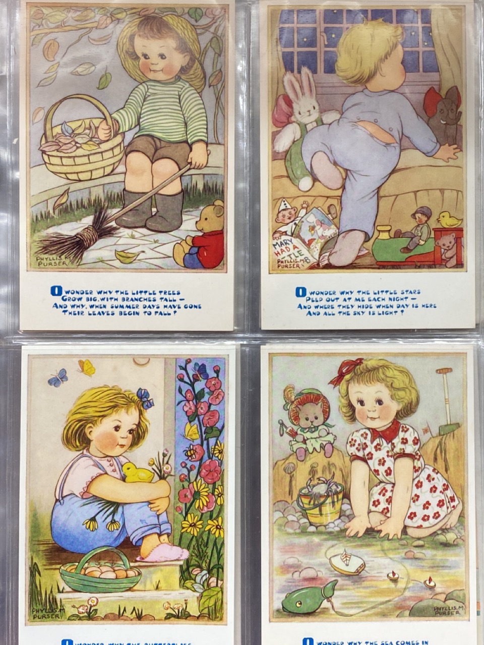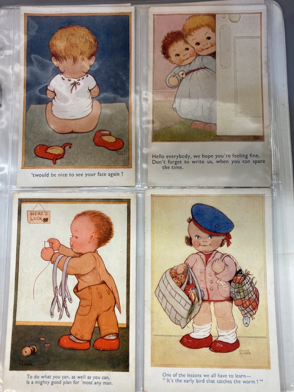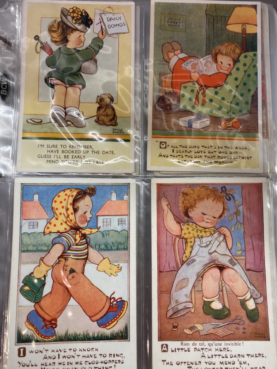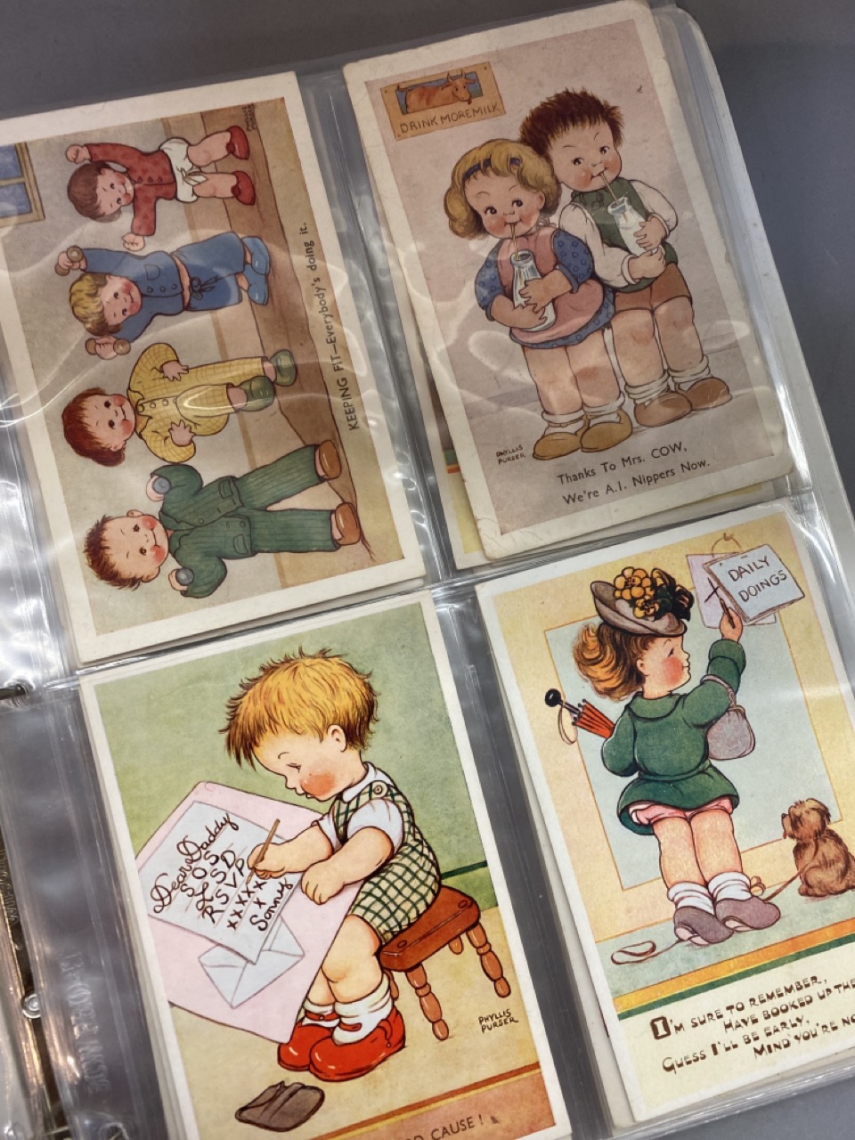 53 pieces, Phyllis M. Purser vintage postcards housed in album. Some postmarked, some unused. Overall very good.
