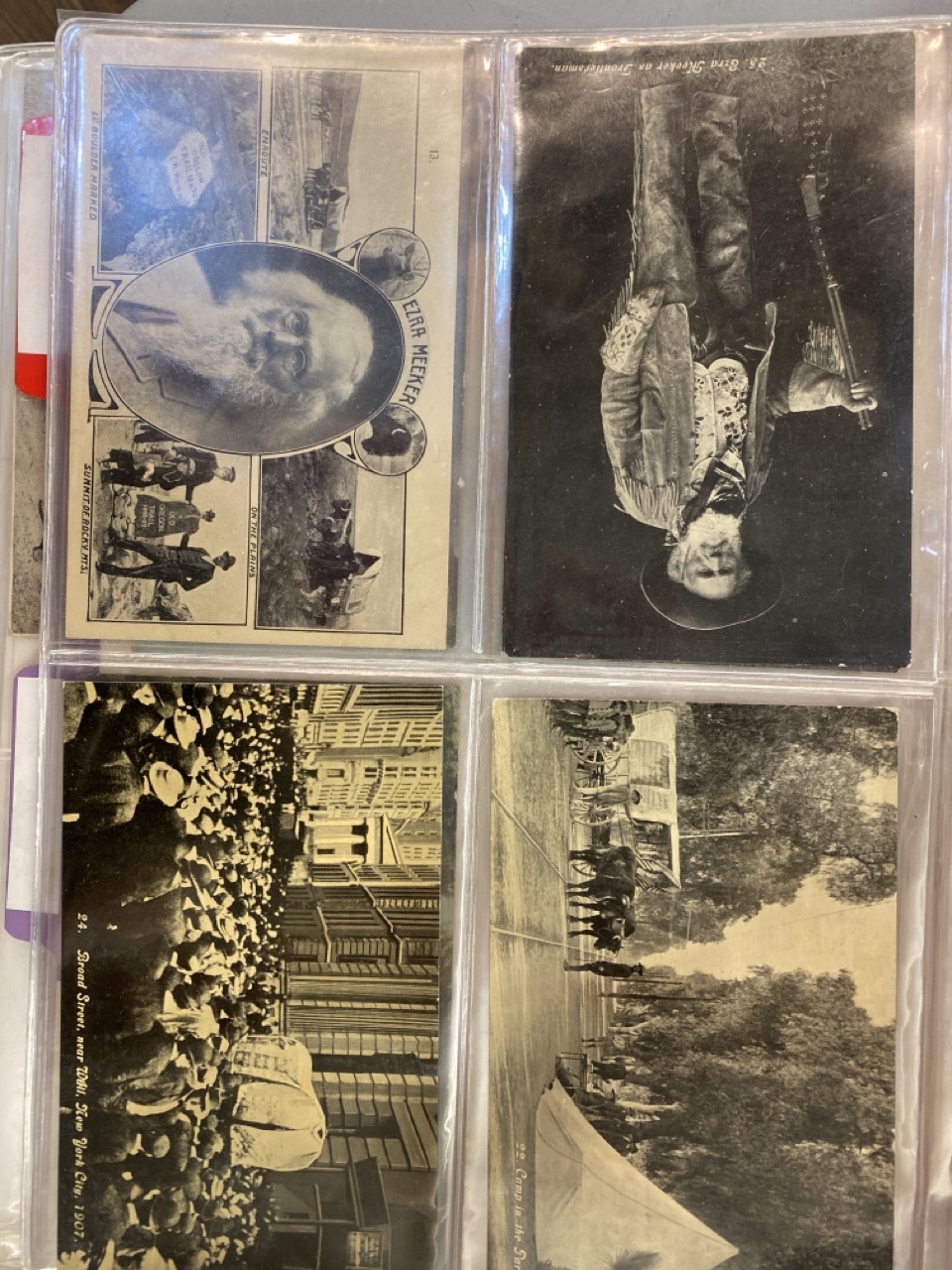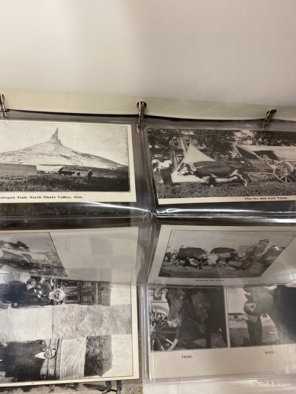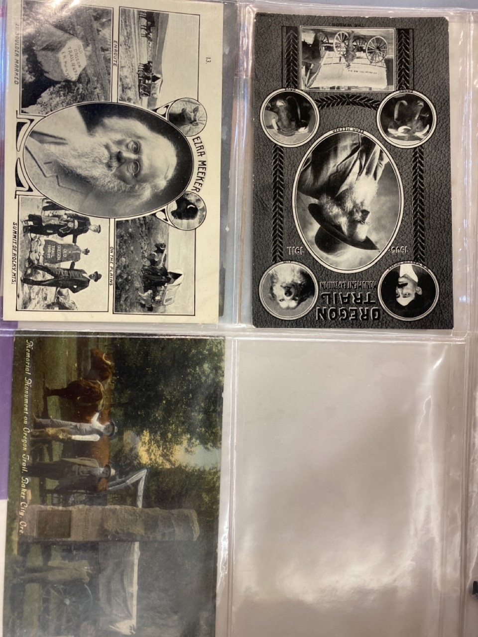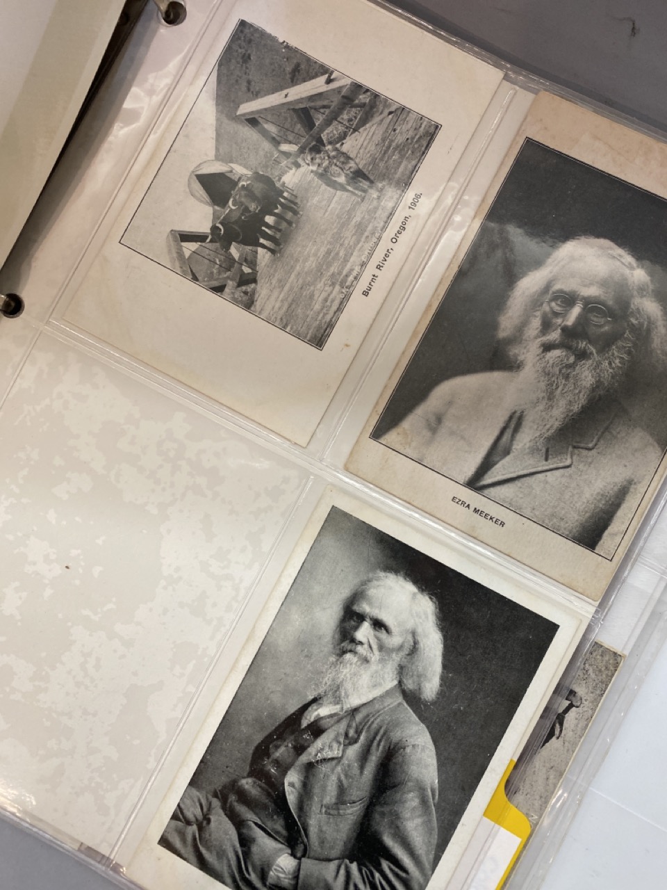 An album of postcards and paper related items on the journey of Ezra Meeker to Oregon. Primarily Photograph postcards. 80+ pieces total.