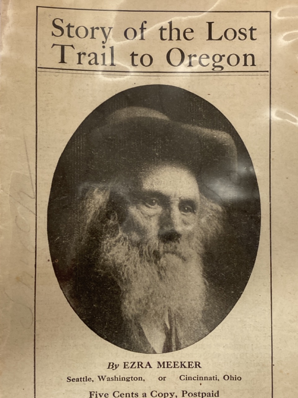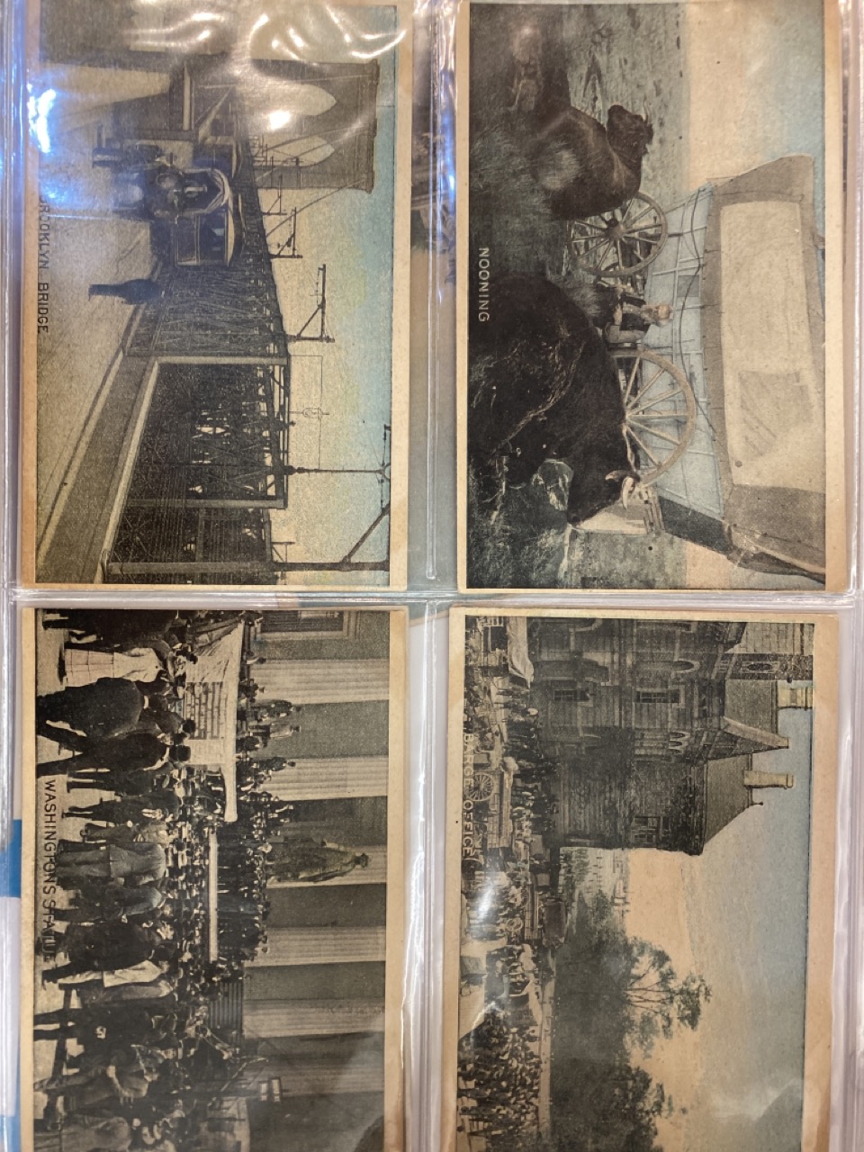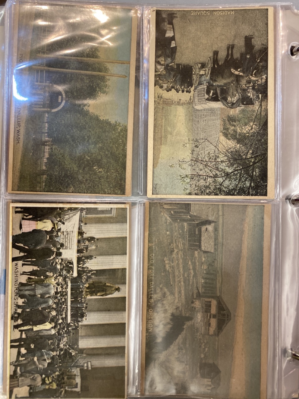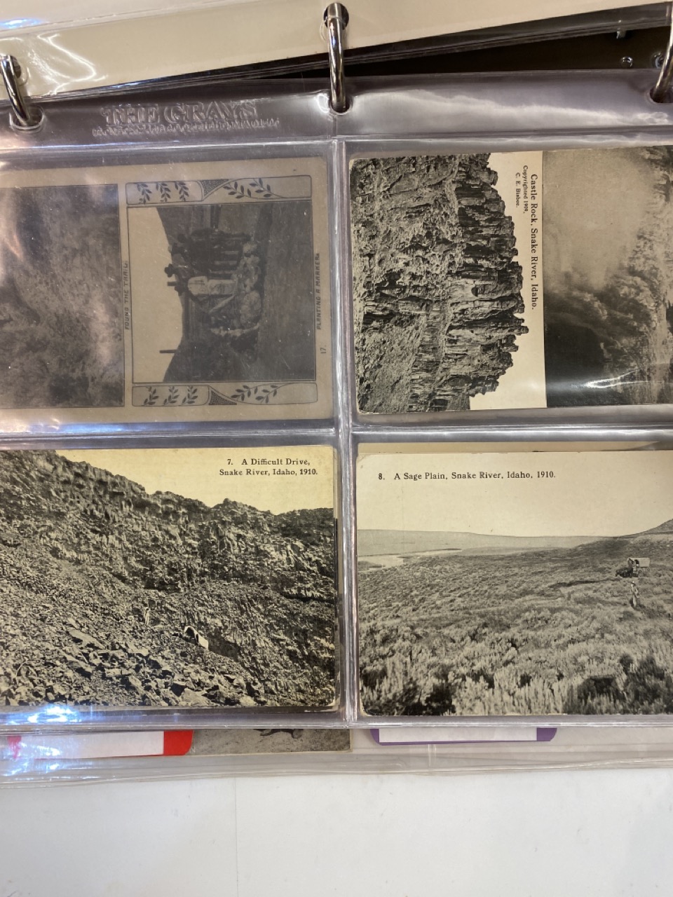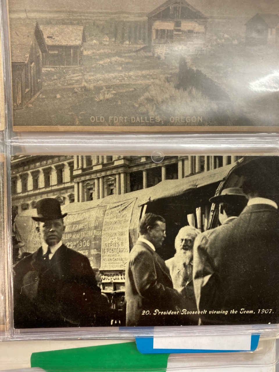 An album of postcards and paper related items on the journey of Ezra Meeker to Oregon. Primarily Photograph postcards. 80+ pieces total.