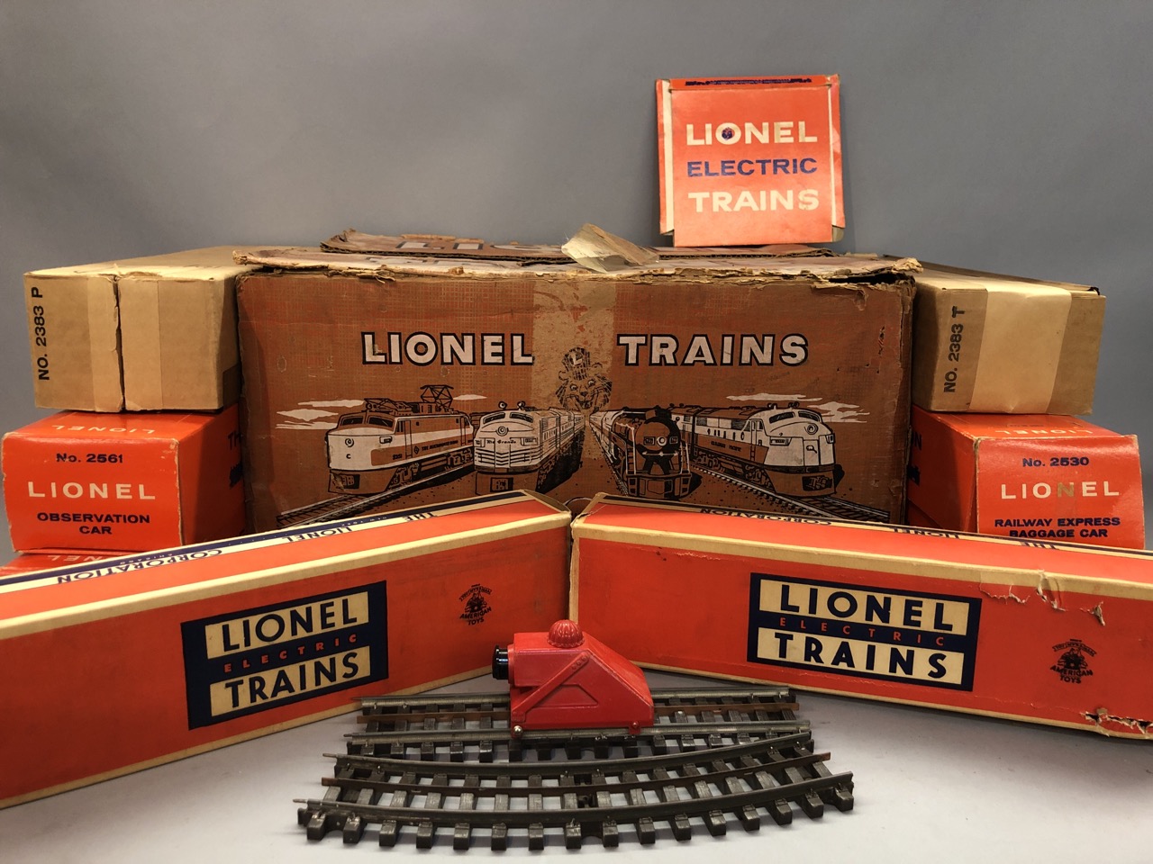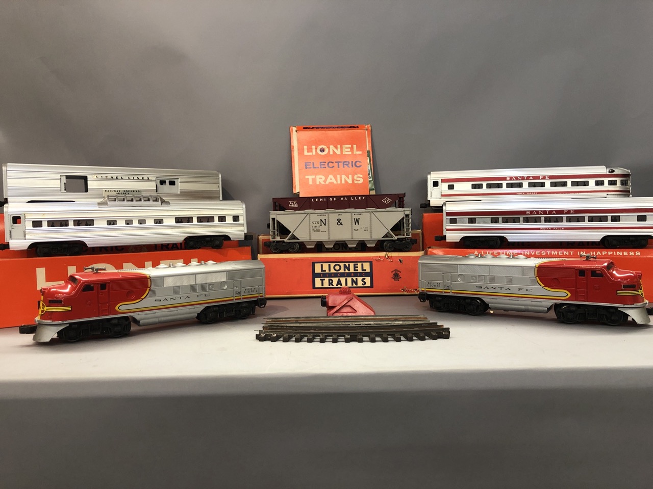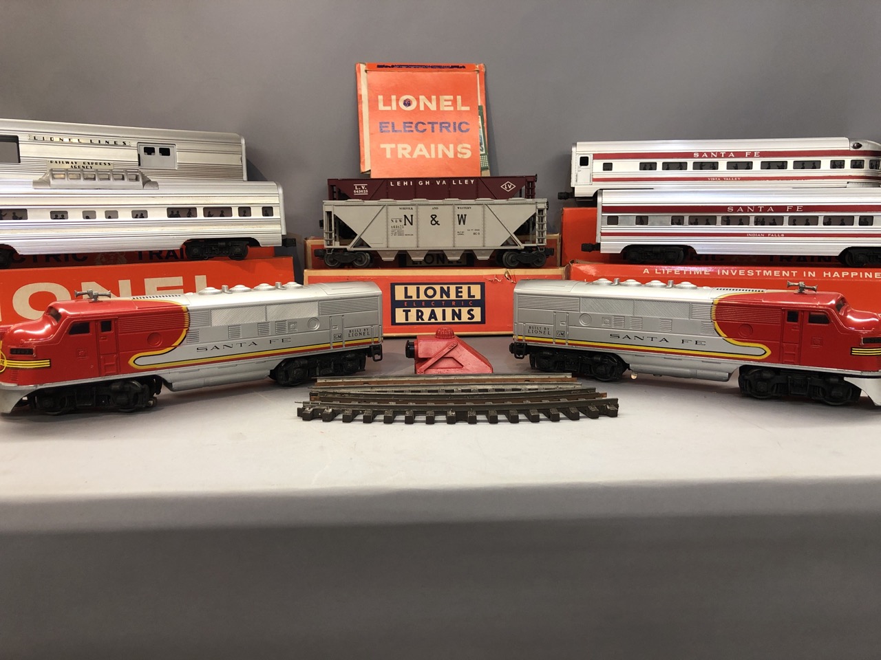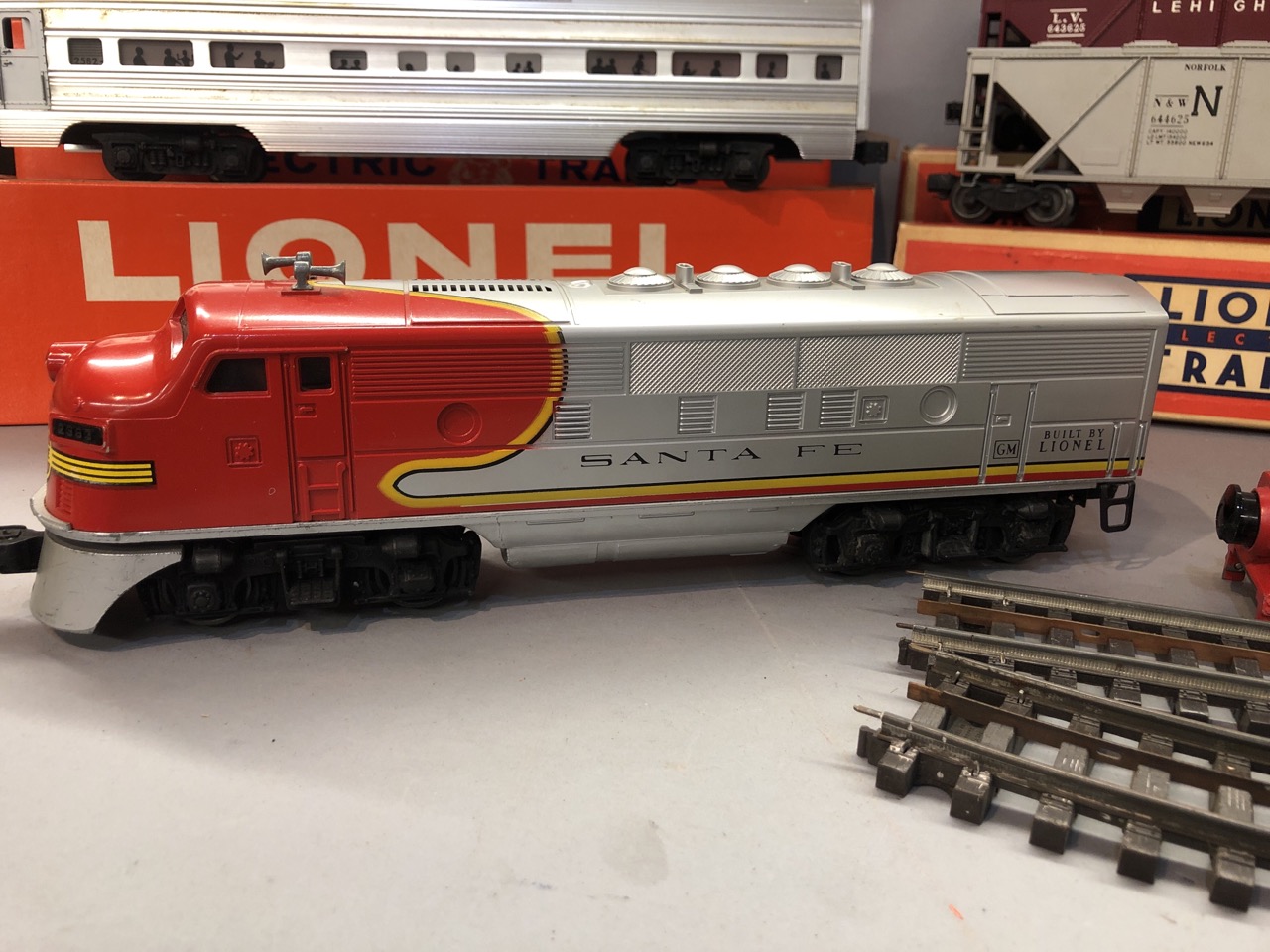 Vintage O scale Lionel train lot Santa Fe Engines 2383P and 2383T along with 6446 cement car, 6436 hopper car, billboards 2563 parlor car and 2561 observation car. All individiually boxed and outer box.