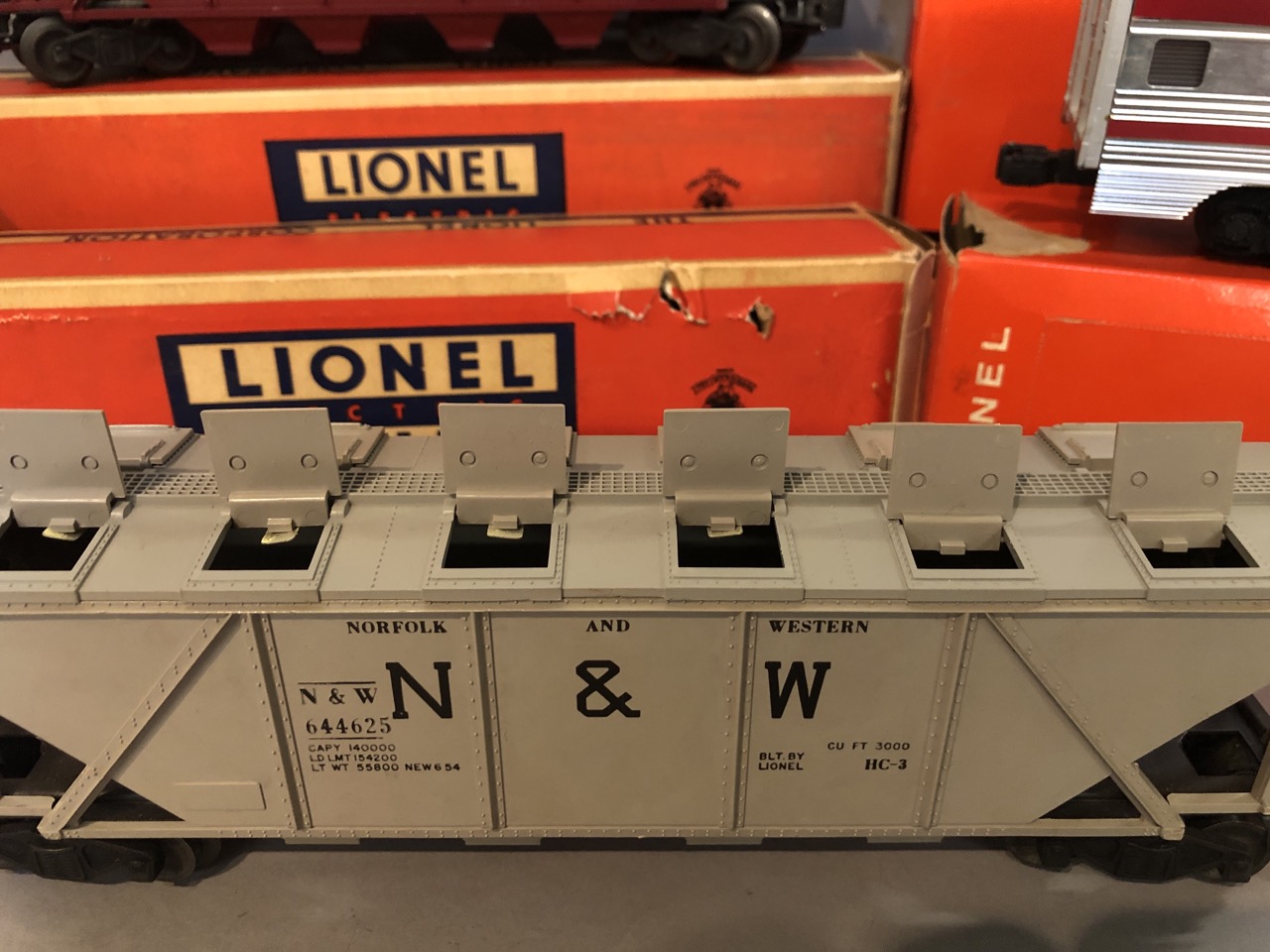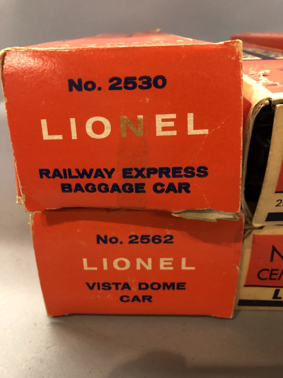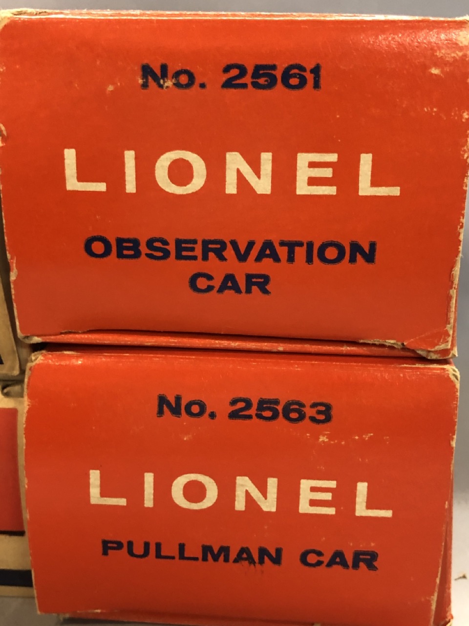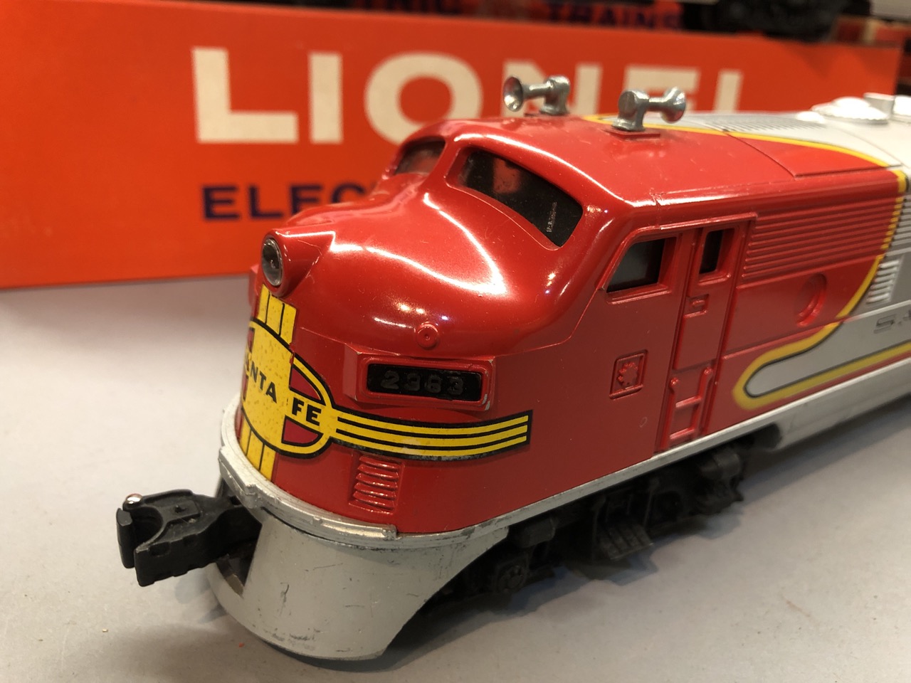 Vintage O scale Lionel train lot Santa Fe Engines 2383P and 2383T along with 6446 cement car, 6436 hopper car, billboards 2563 parlor car and 2561 observation car. All individiually boxed and outer box.