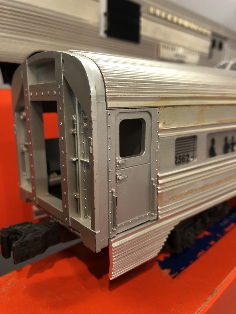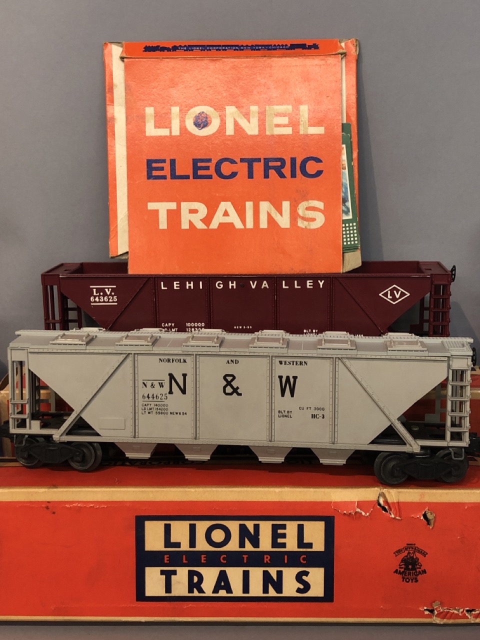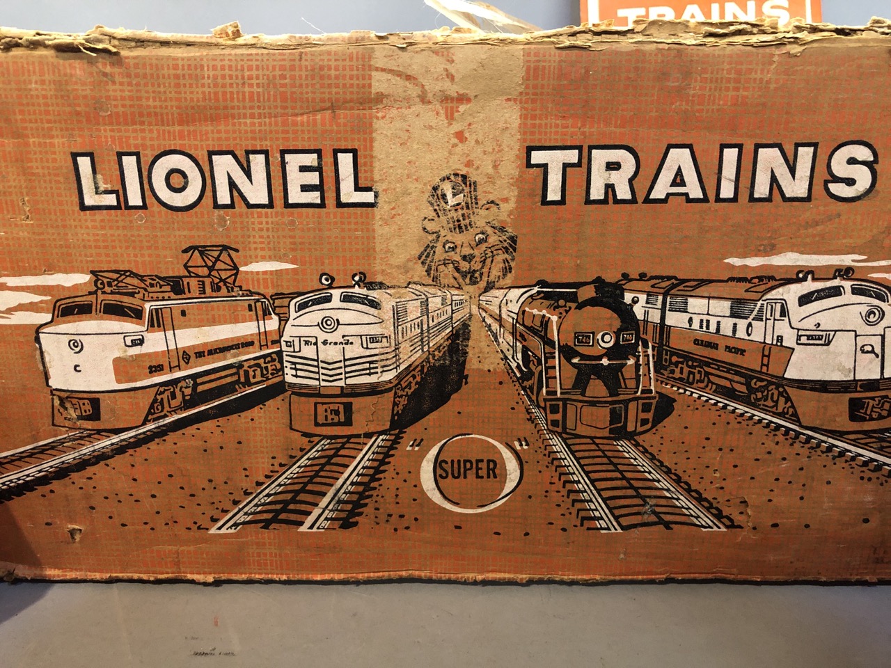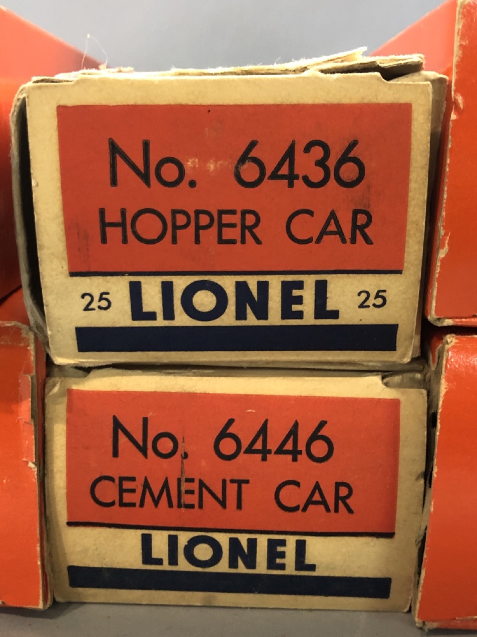 Vintage O scale Lionel train lot Santa Fe Engines 2383P and 2383T along with 6446 cement car, 6436 hopper car, billboards 2563 parlor car and 2561 observation car. All individiually boxed and outer box.