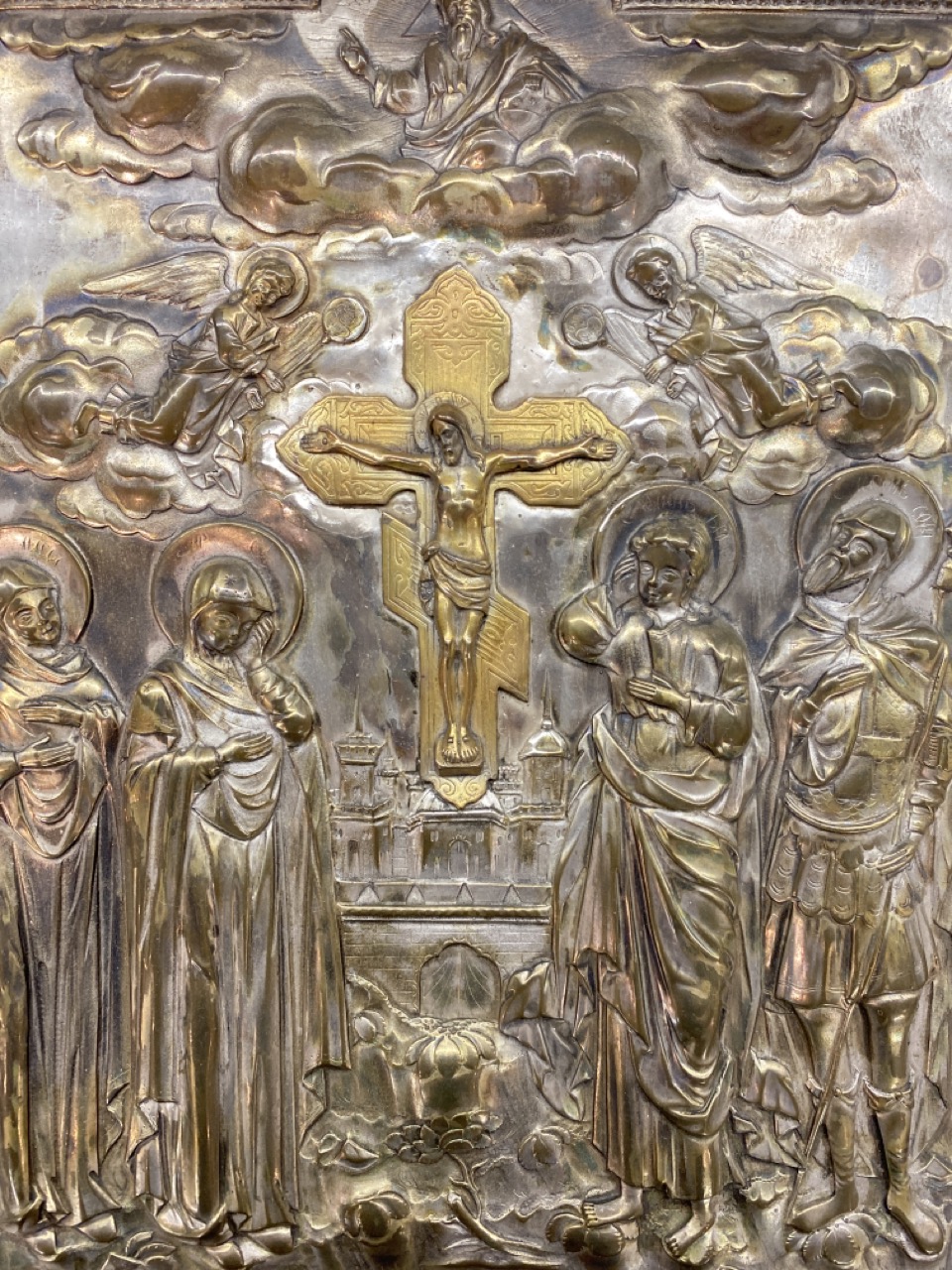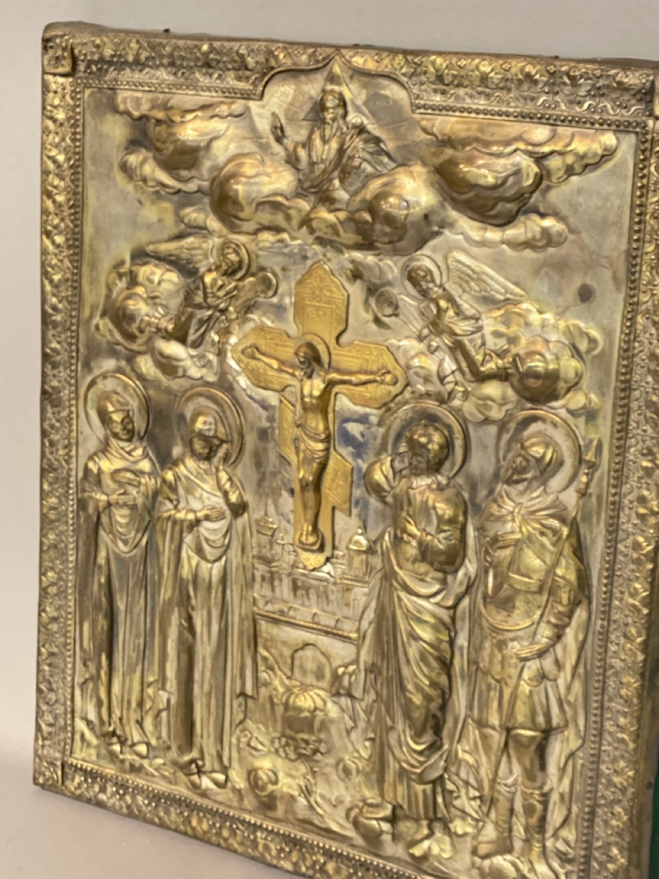 A vintage religious icon with crucifix.