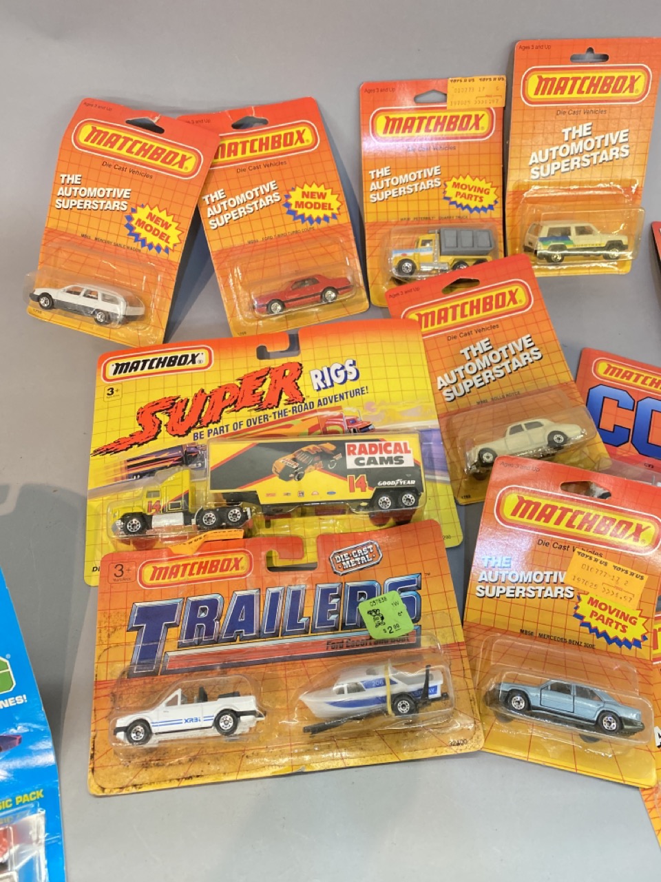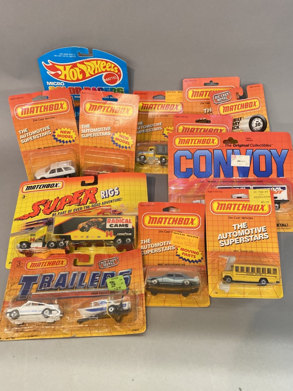 Eleven (11) Matchbox and One (1) Micro Color Racers Hot Wheels cars. One lots all still in pacakage. As seen in photograph preview.