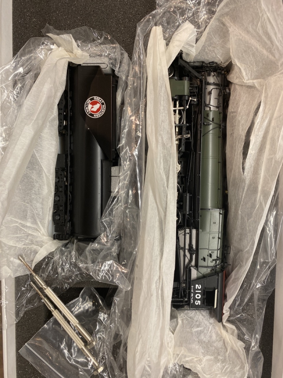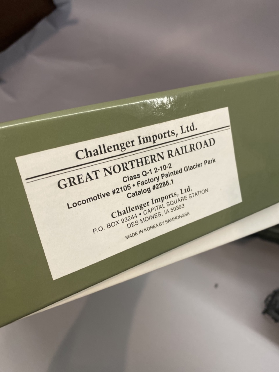Challenger Imports Great Northern Railroad Q-1 2-10-2 Vestibule Cab Version Loco #2105 Factory painted (Glacier Park). Catalog 2286.1. Samhongsa , Made in Korea with original box