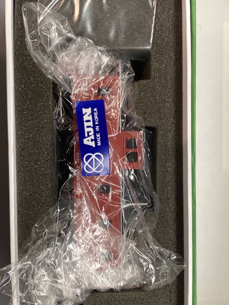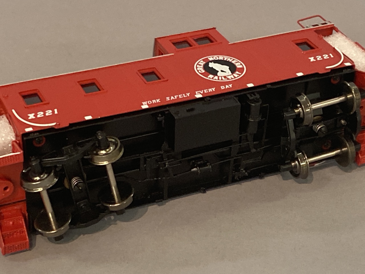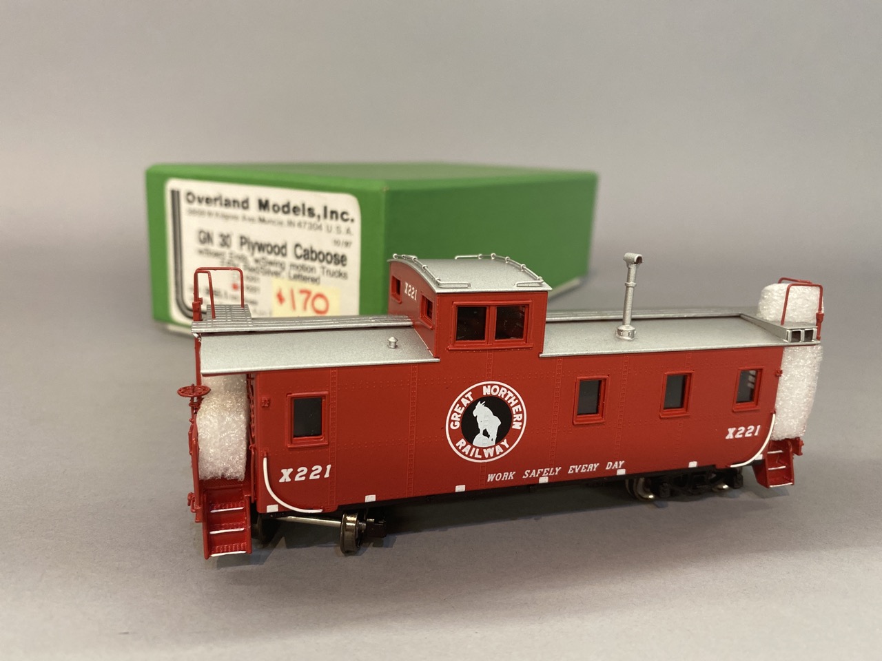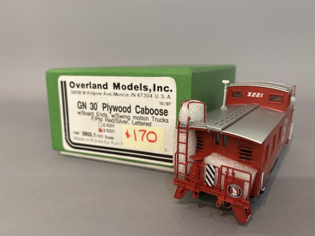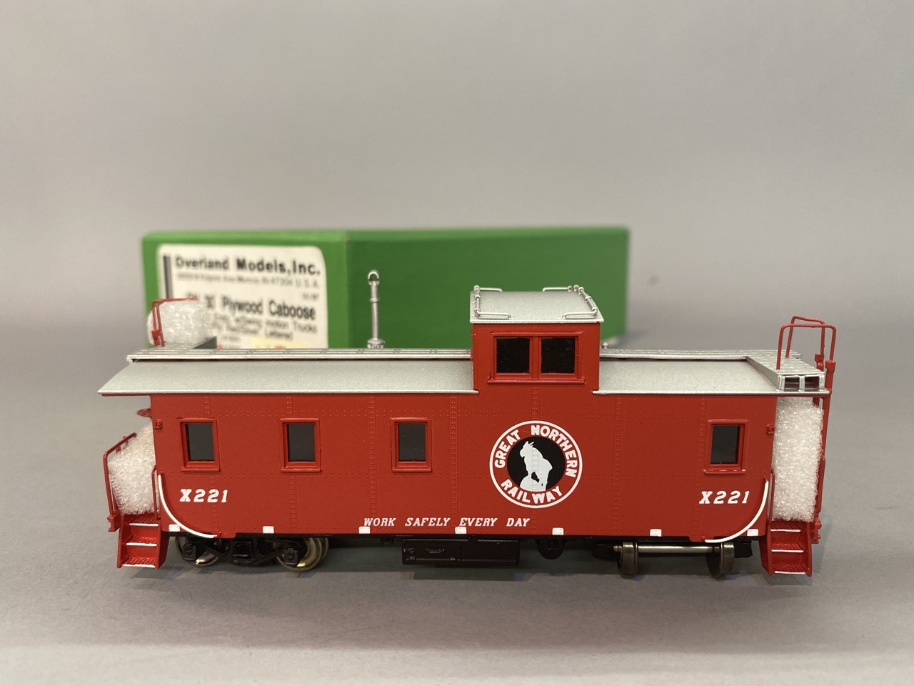 Overland Models Great Northern 30 foot plywood caboose with board ends with swing motion trucks, red paint with silver. #221 OMG 3955.1. HO scale with original box. Made in Korea.