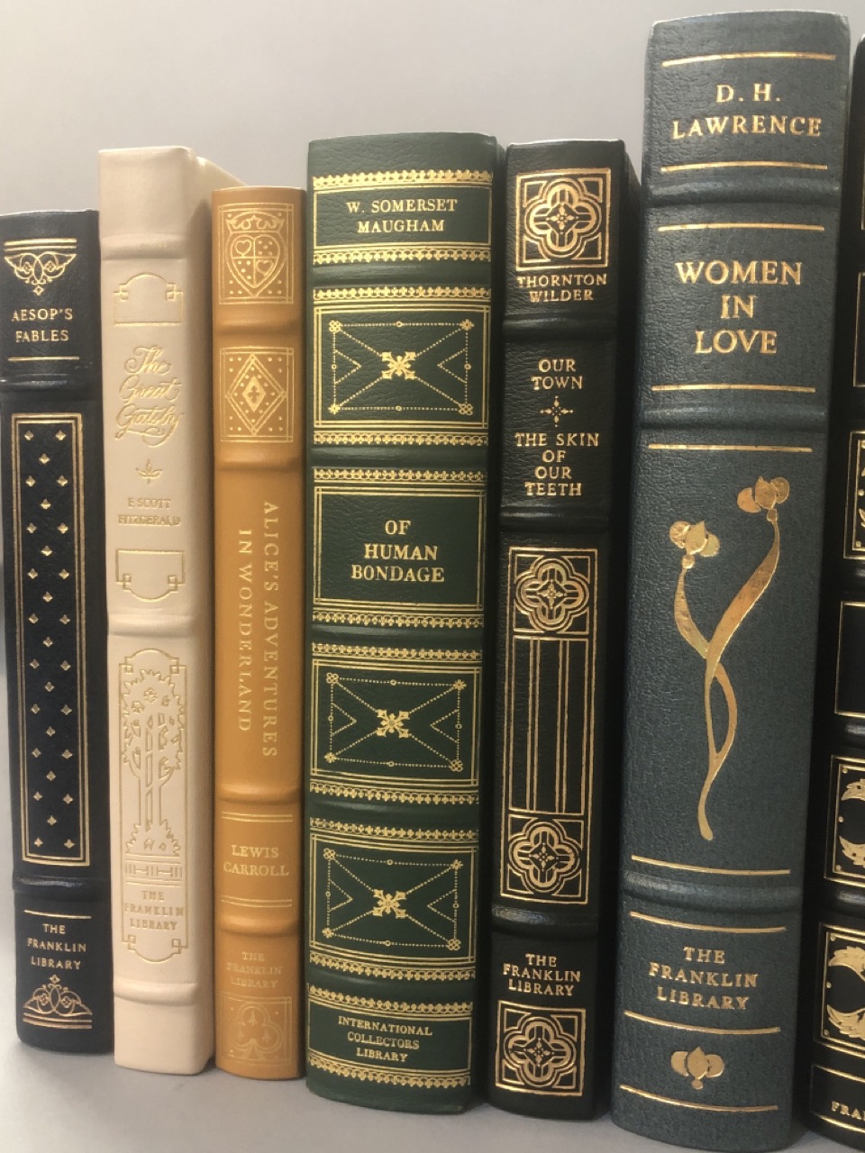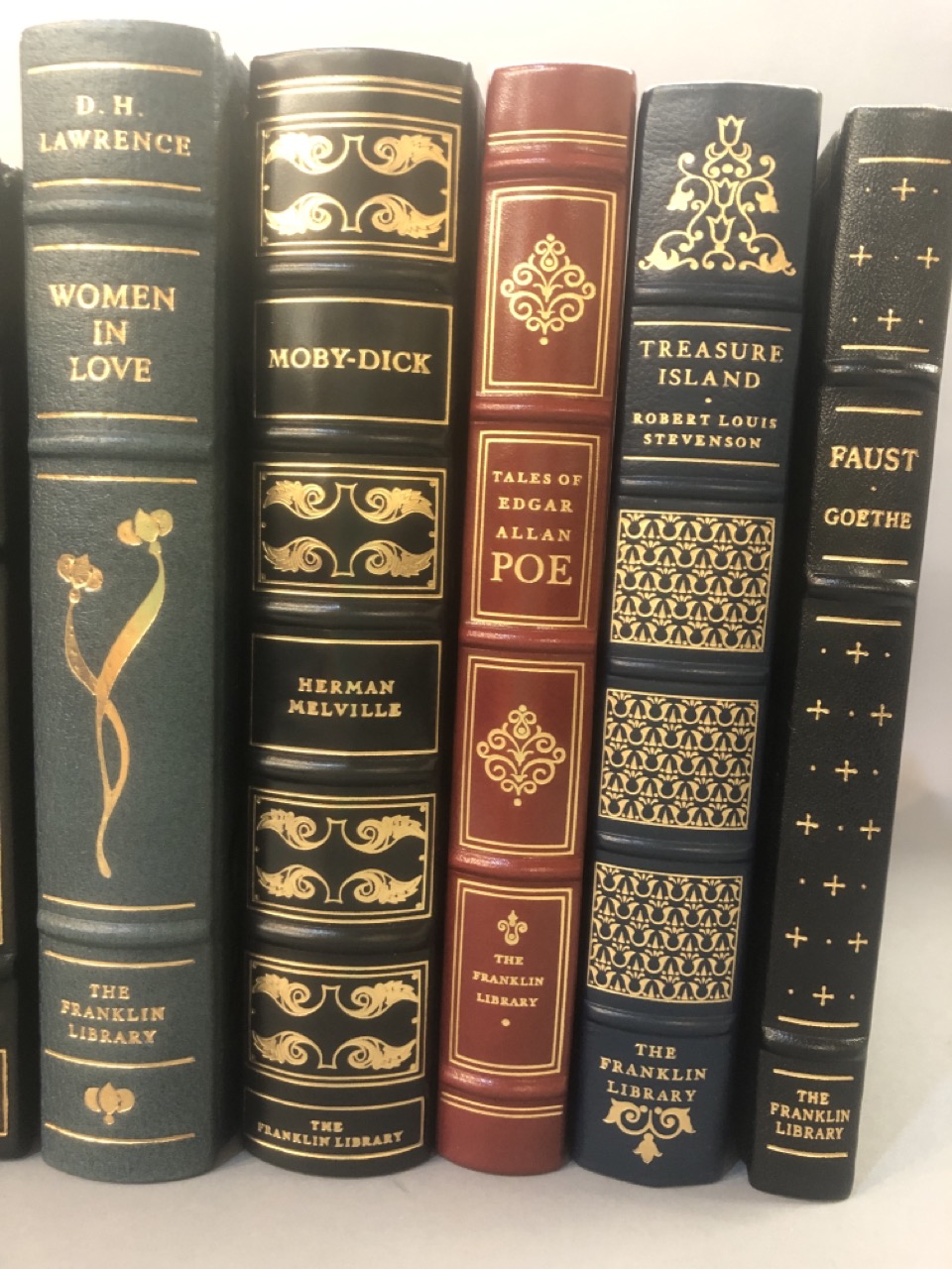 Franklin Library leather bound book 10 piece lot, Titles include: Aesop’s Fables,The Great Gatsby, Alice In Wonderland, Of Human Bondage, Our Town, Women In Love, Moby Dick, Tales Of Edgar Allen Poe, Treasure Island and Faust.