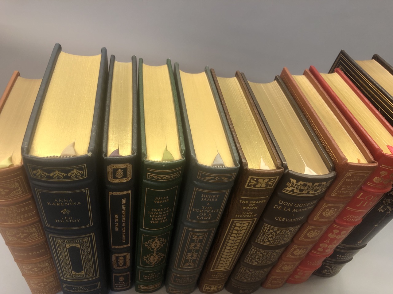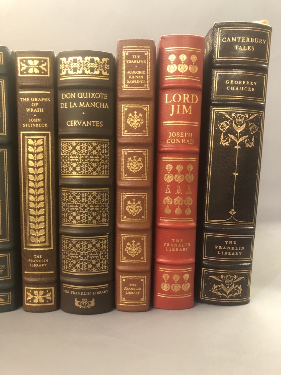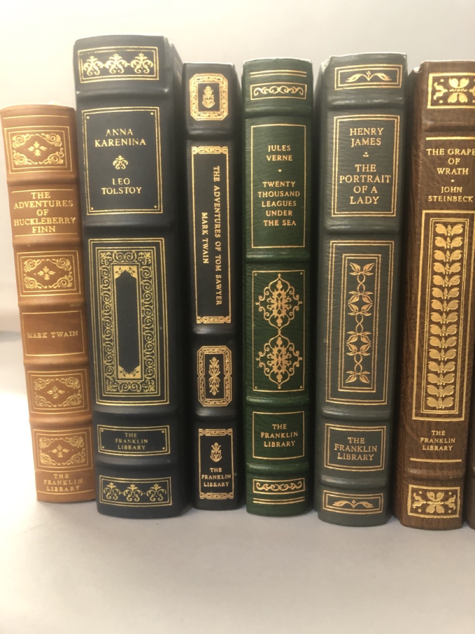 Franklin Library leather bound books, 10 piece lot. Titles include: The Adventures of Huckleberry Finn, Leo Tolestoy, The Adventures of Tom Sawyer, 20,000 Legues Under The Sea, The Portrait Of The Lady,The Grapes Of Wrath, Don De La Mancha, The Yearling, Lord Jim and Canterbury Tales.