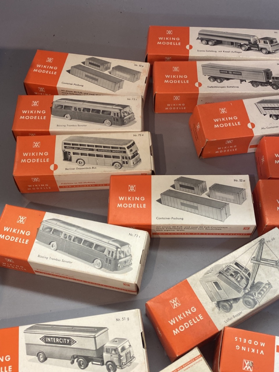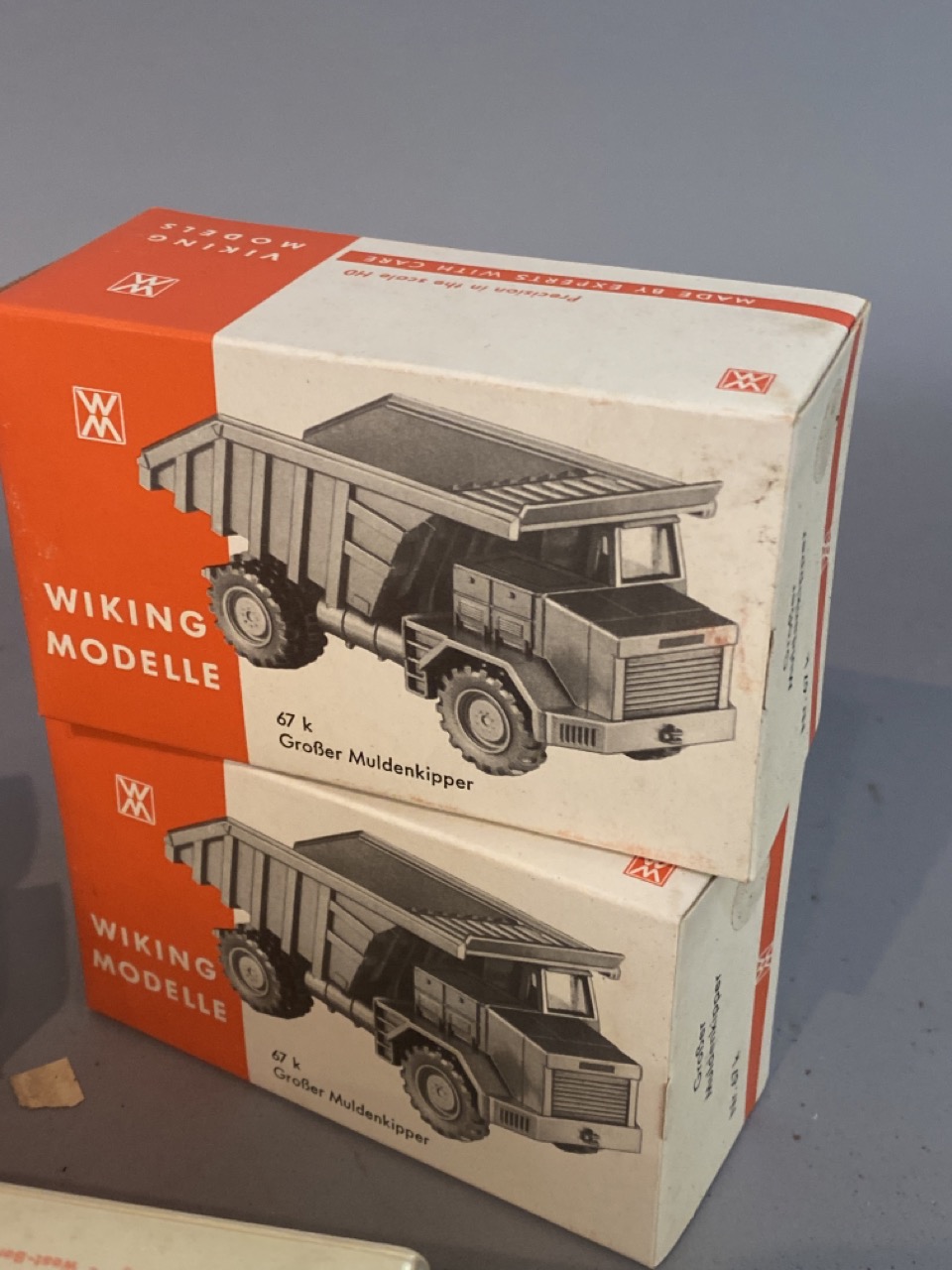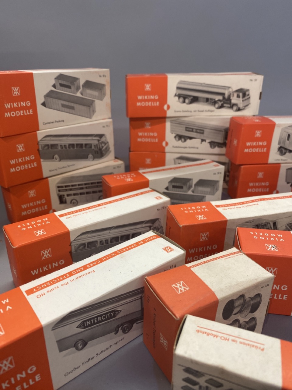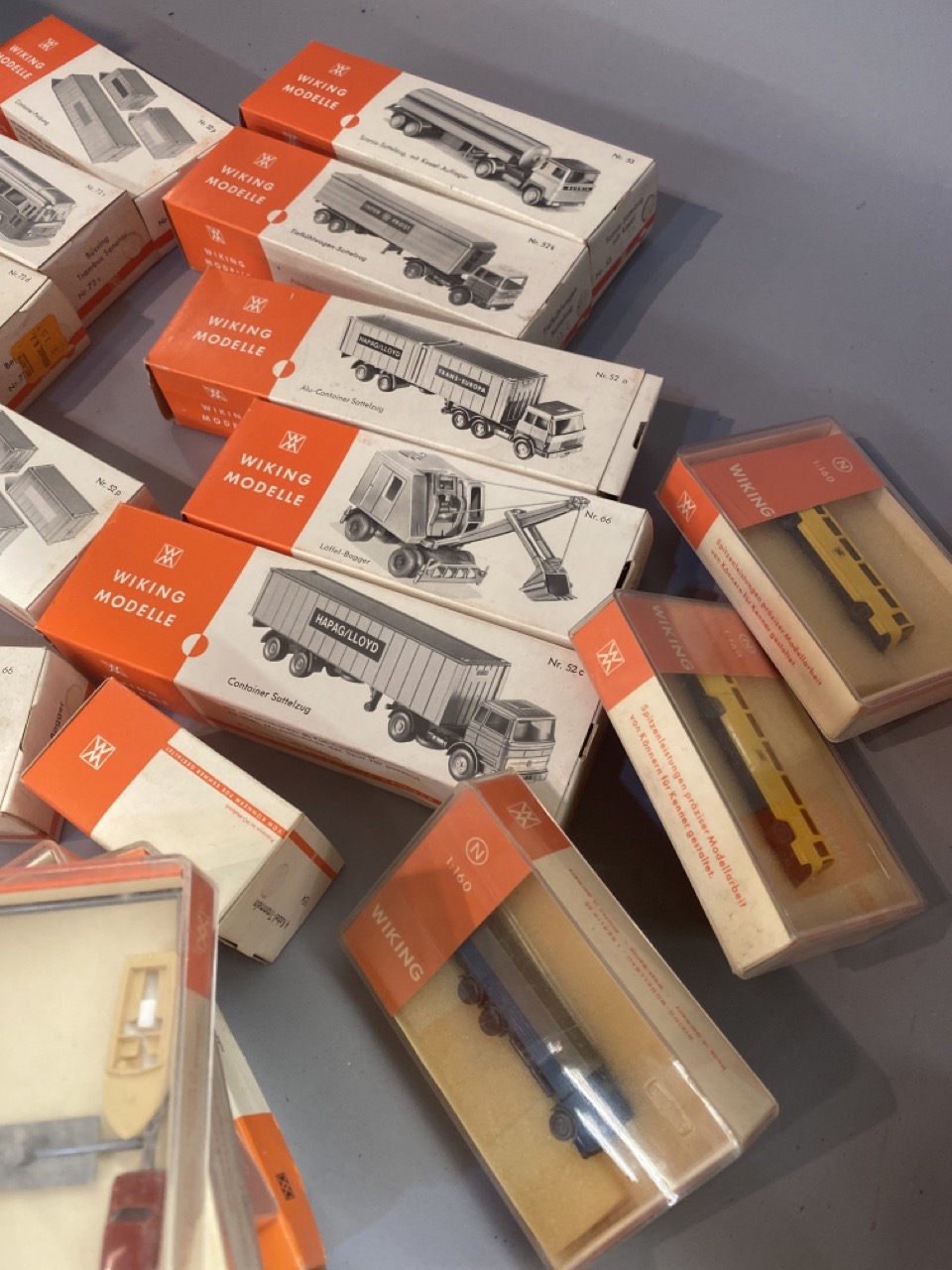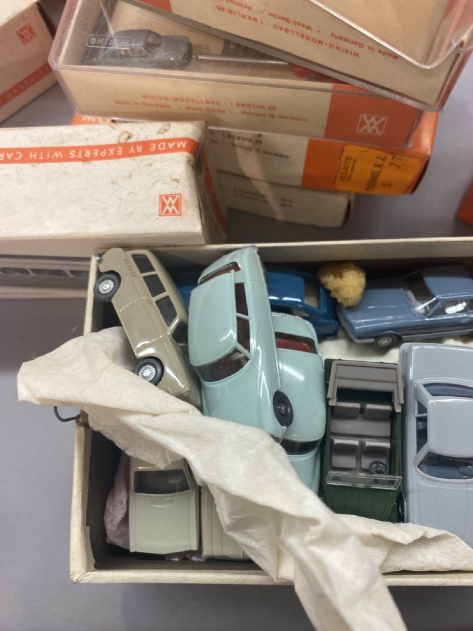 50 pieces total new old stock train set up vehicle models. Trucks, cars etc. 1:87 HO scale and 1:160 scale. Made In Germany.
